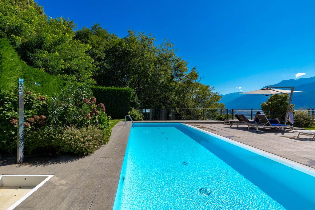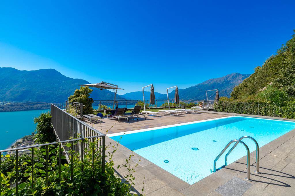 Il solarium e la piscina, parti comuni del complesso, sono posizionati sulla copertura, offrendo una vista mozzafiato sul lago e sulle montagne.