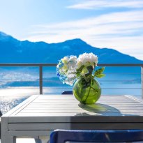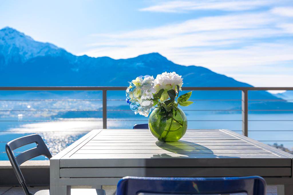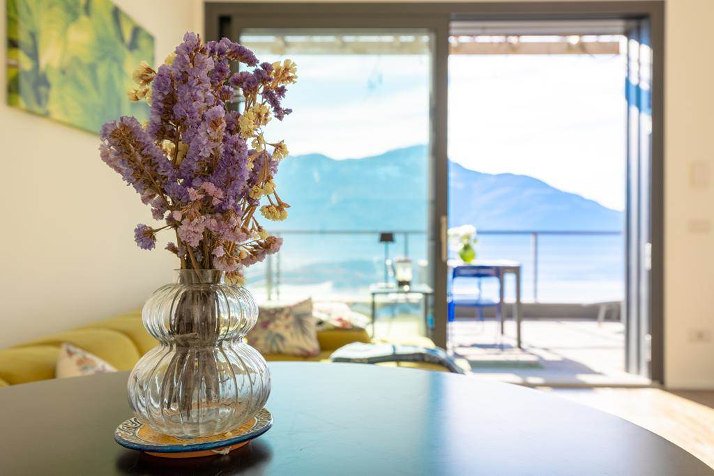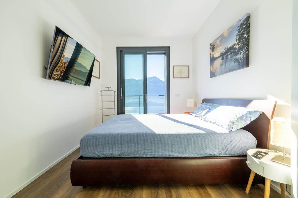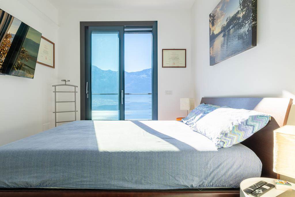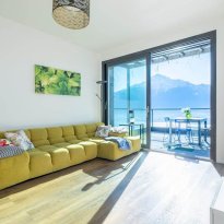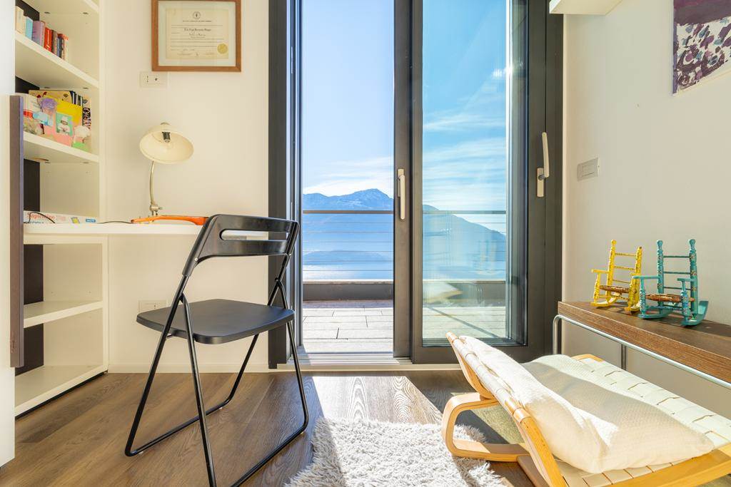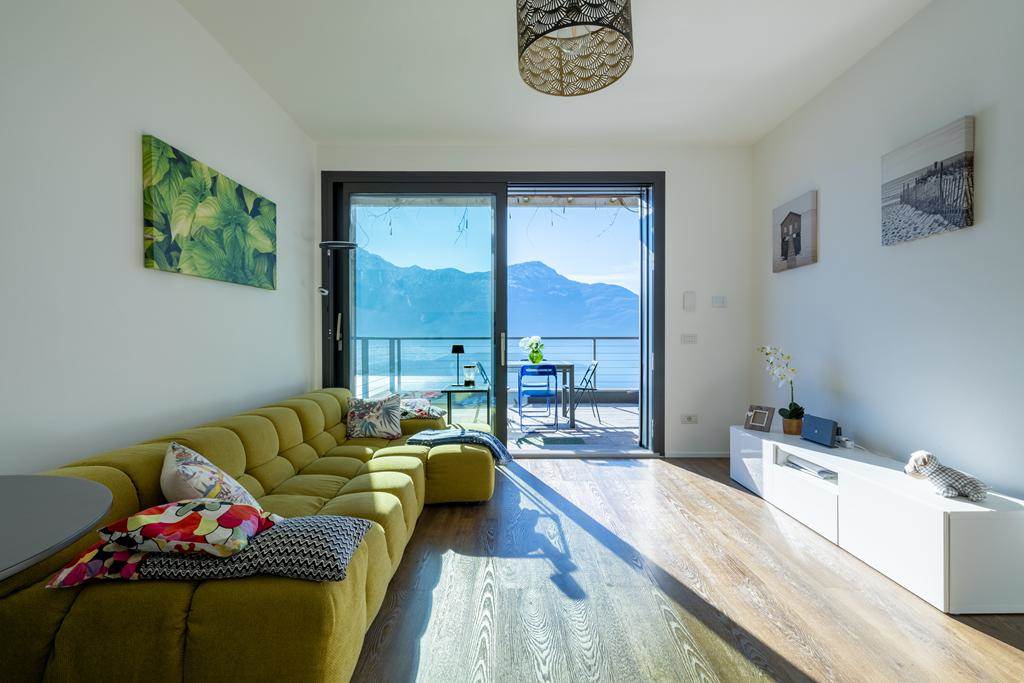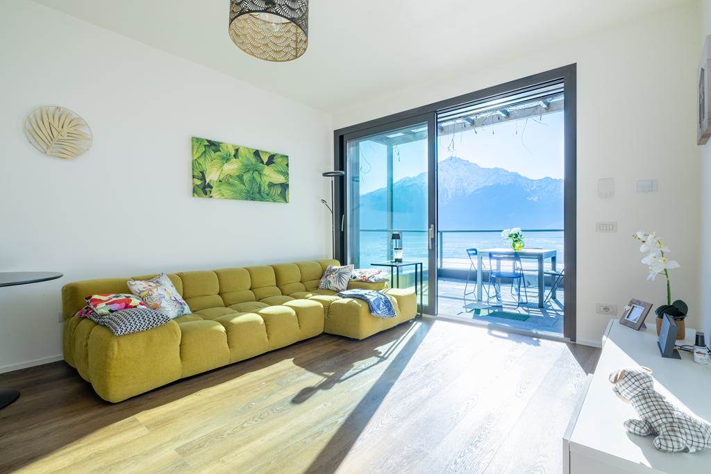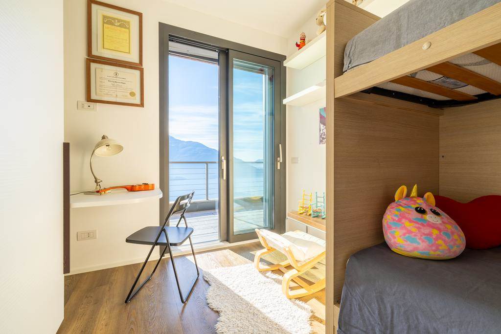 L’immobile è composto da zona giorno con cucina a vista, ampia vetrata panoramica affacciata sul lago e sulle montagne, due camere da letto e due bagni.