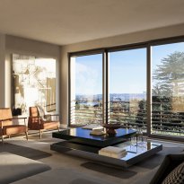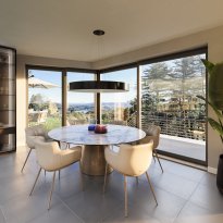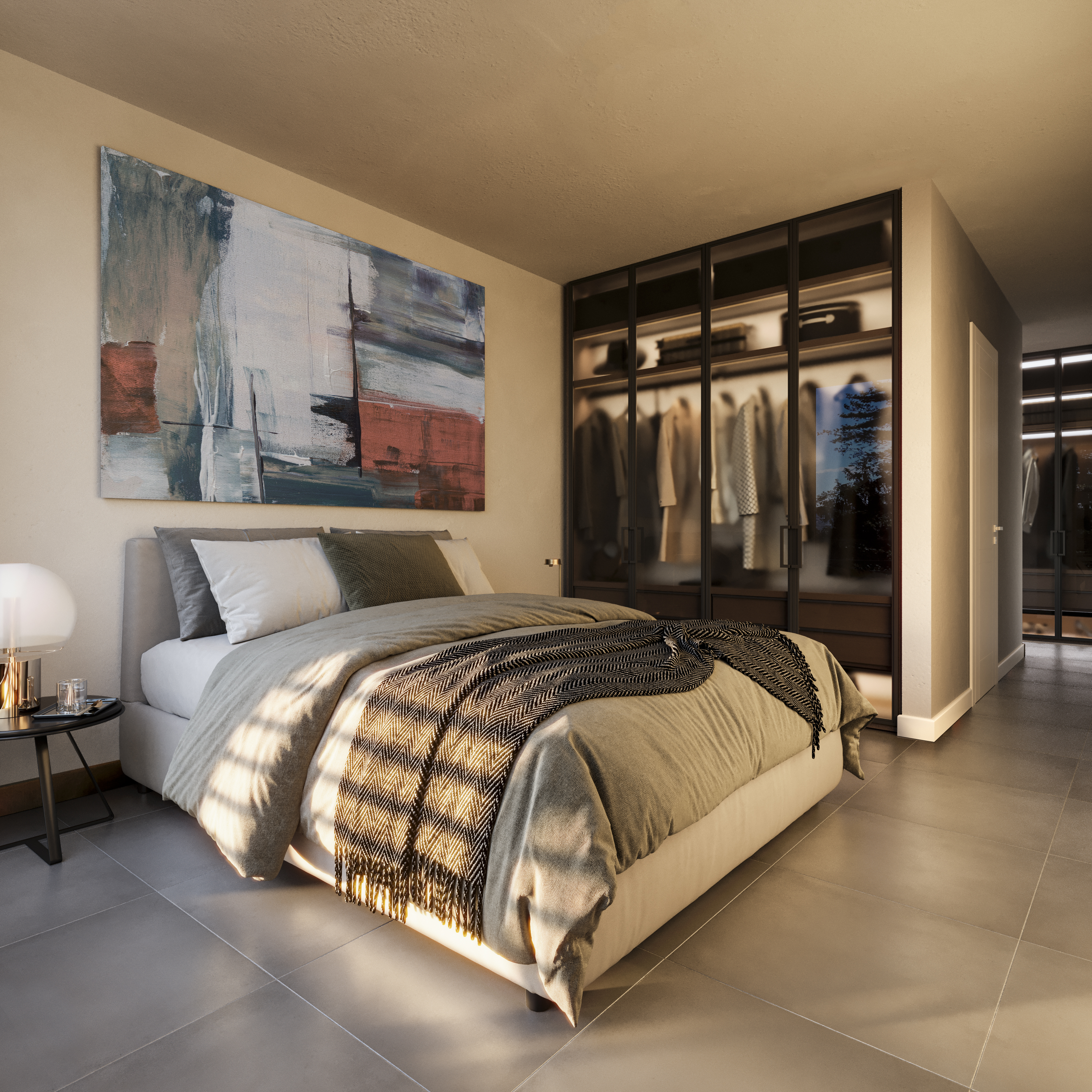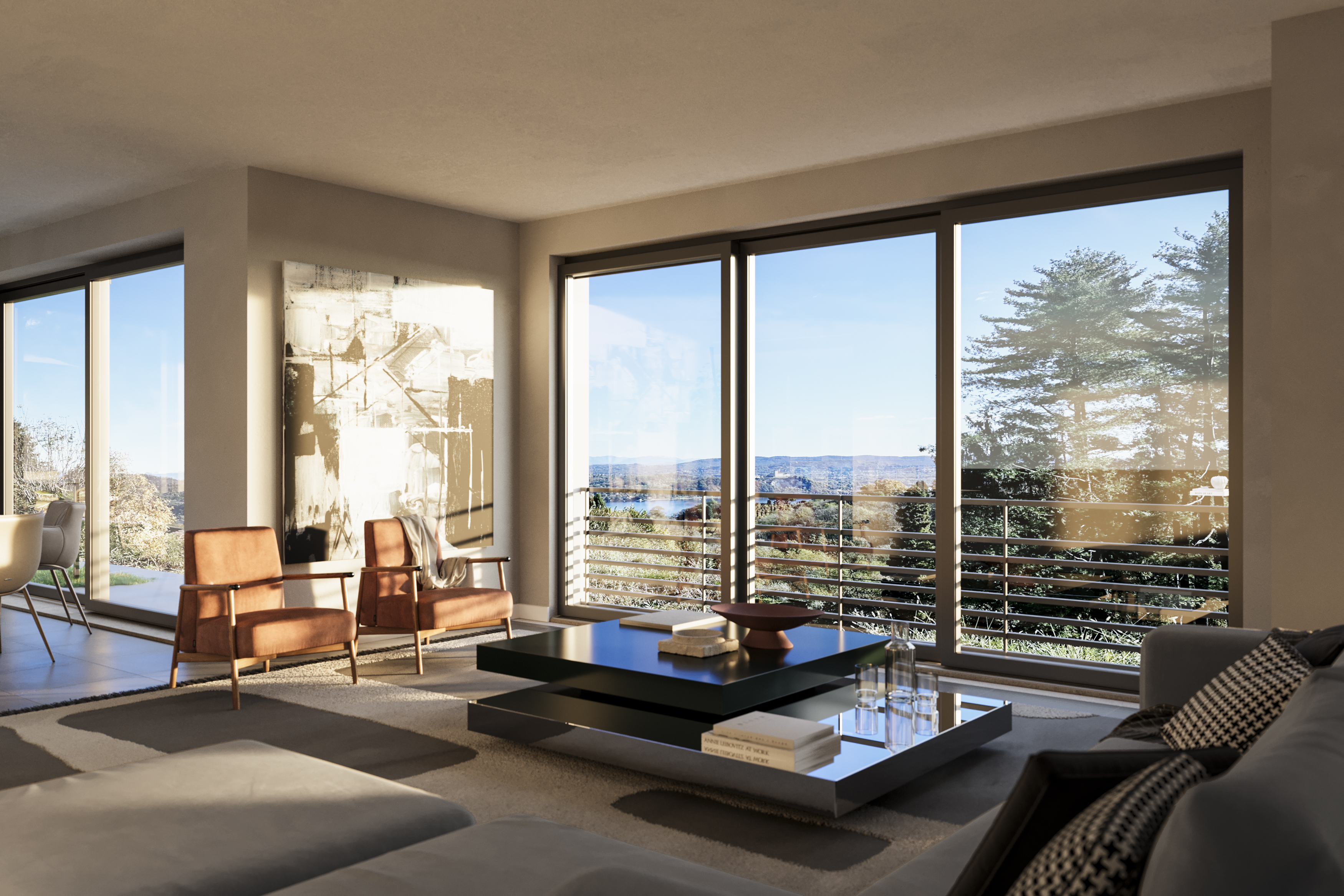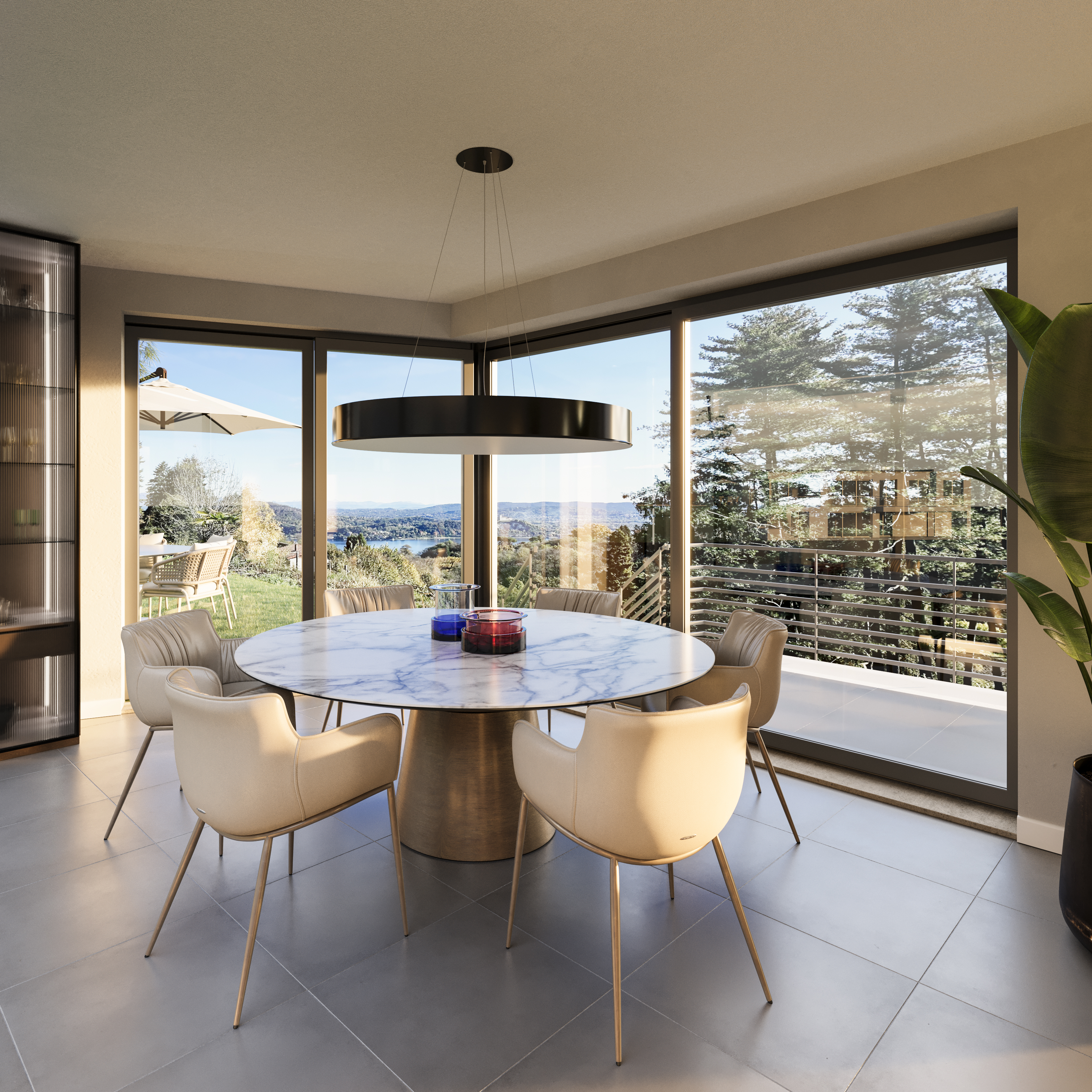 Il primo piano è dedicato alla zona giorno, concepita come un grande ambiente open space che comprende soggiorno, sala da pranzo e cucina, tutte con porte-finestre affacciate sul lago, che garantiscono una luminosità straordinaria e una continuità naturale con gli spazi esterni. Completano il piano un bagno di servizio, la camera padronale con bagno en suite e cabina armadio, e due ulteriori camere da letto.