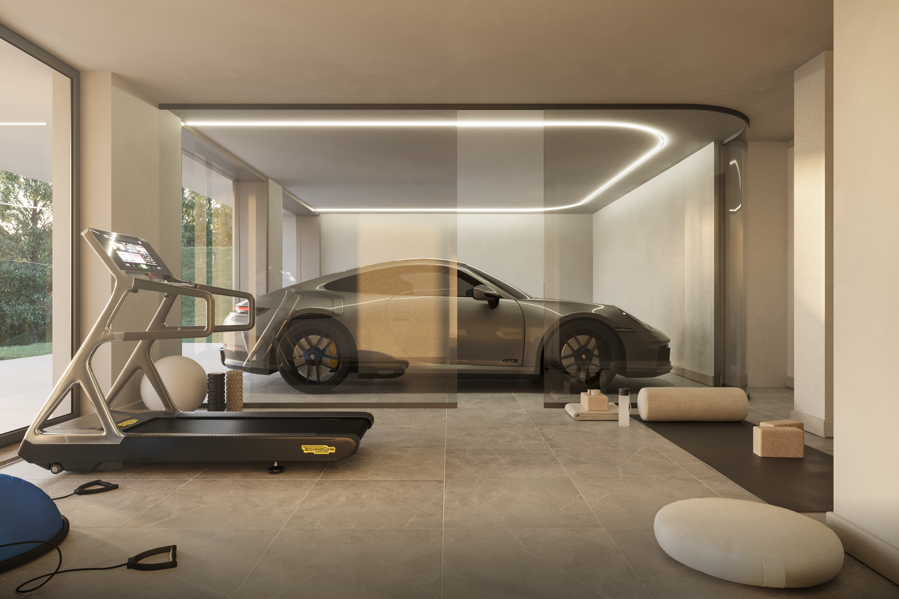 Il progetto attuale prevede, al piano terra, una spaziosa taverna, una camera da letto con cabina armadio e bagno privato, un ripostiglio, un ulteriore bagno di servizio, una sauna e un’area fitness. Sempre a questo livello si trova un comodo garage doppio in larghezza.