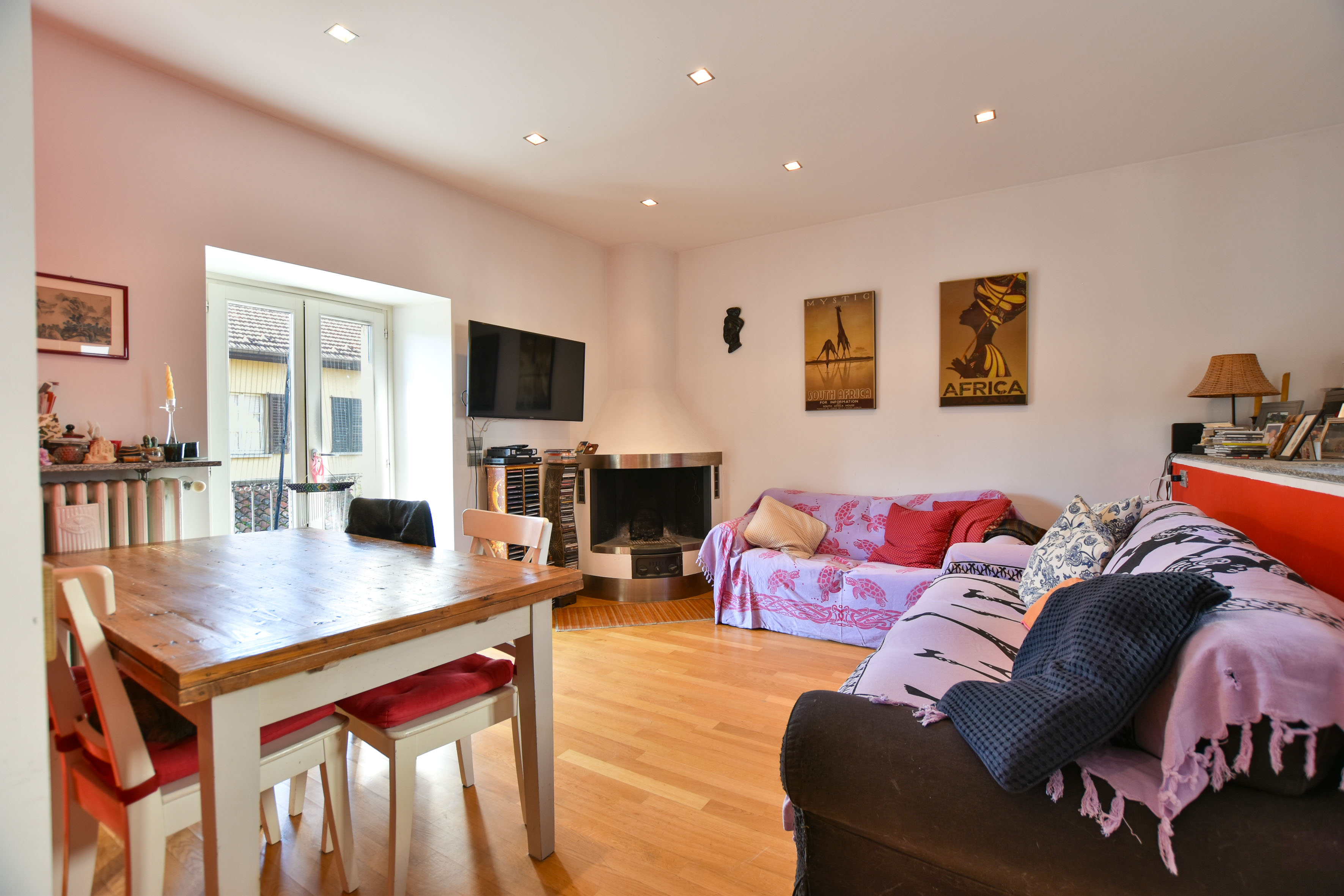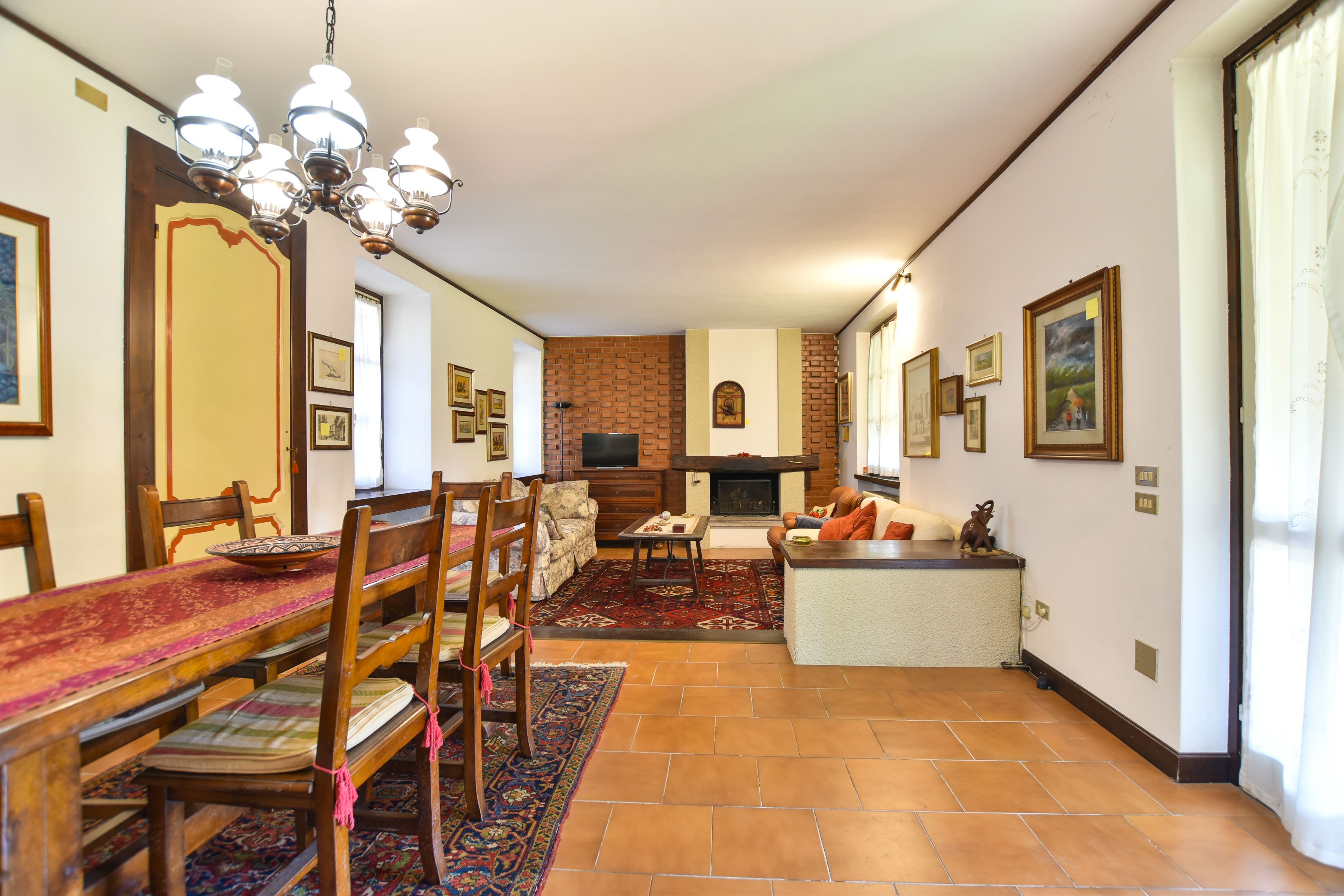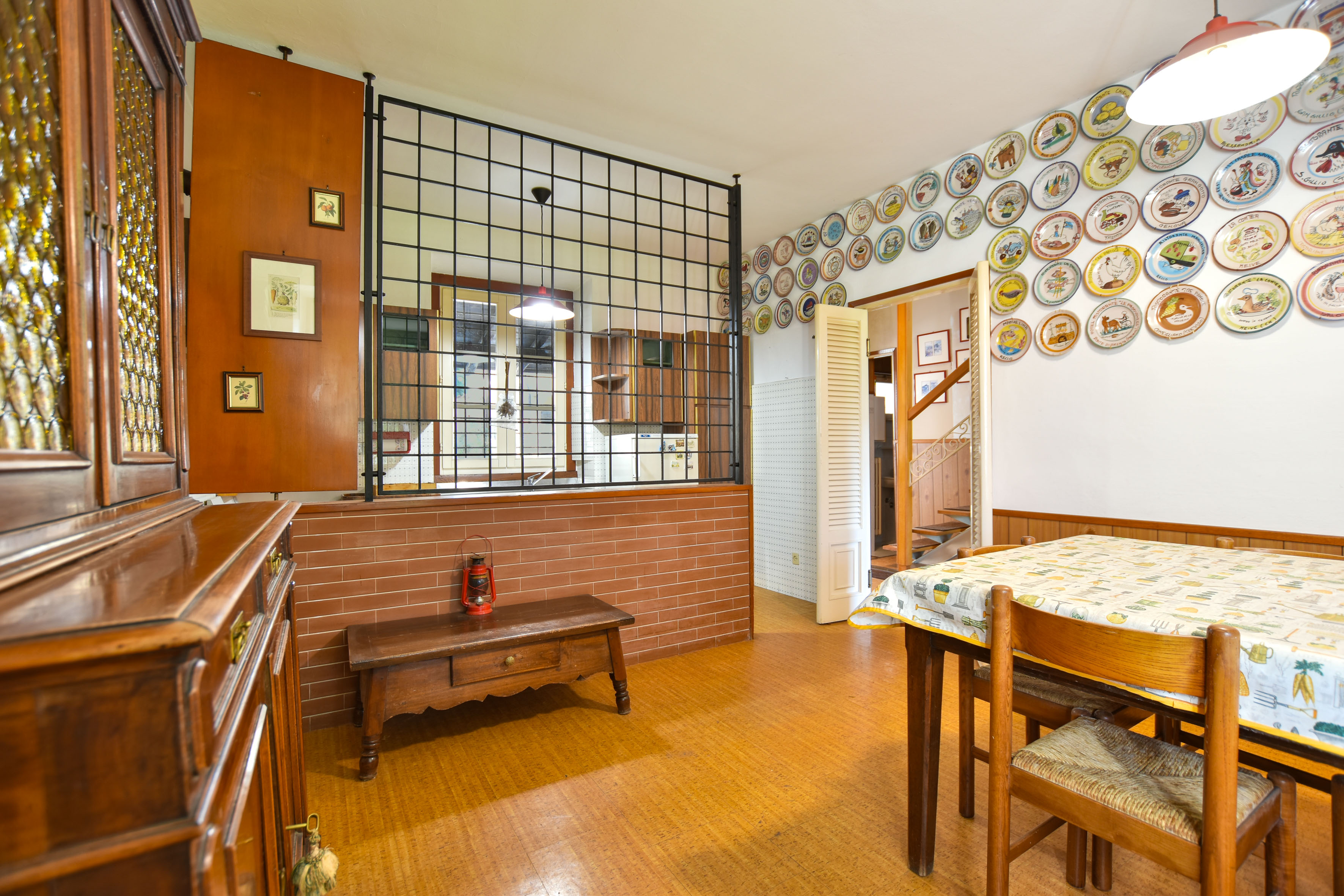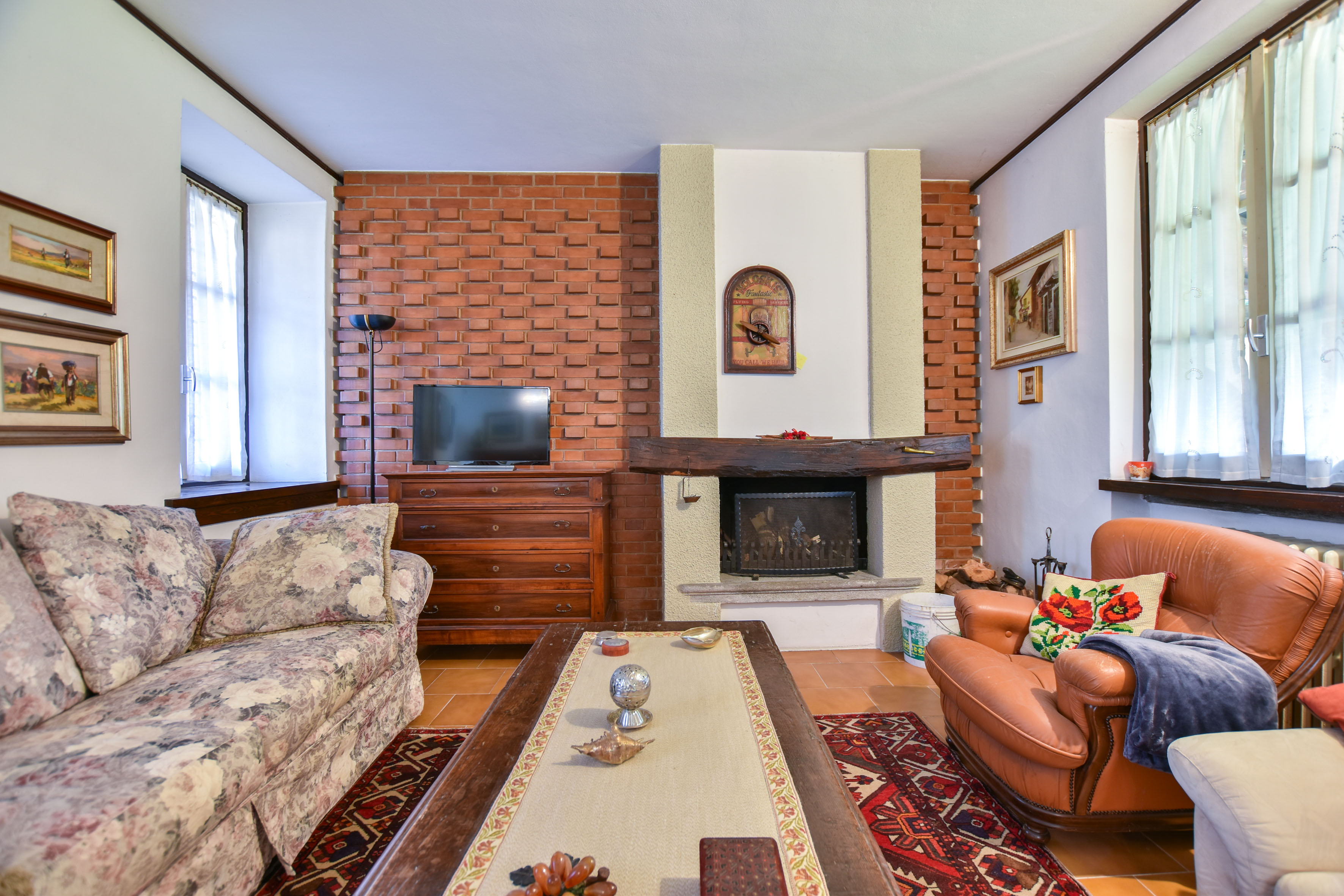 Al piano superiore si trovano un luminoso soggiorno con camino e zona pranzo, un angolo cottura e un secondo bagno con doccia, oltre a una camera matrimoniale con accesso al balcone. Gli infissi sono in legno con doppi vetri e il riscaldamento è autonomo a gas con radiatori.