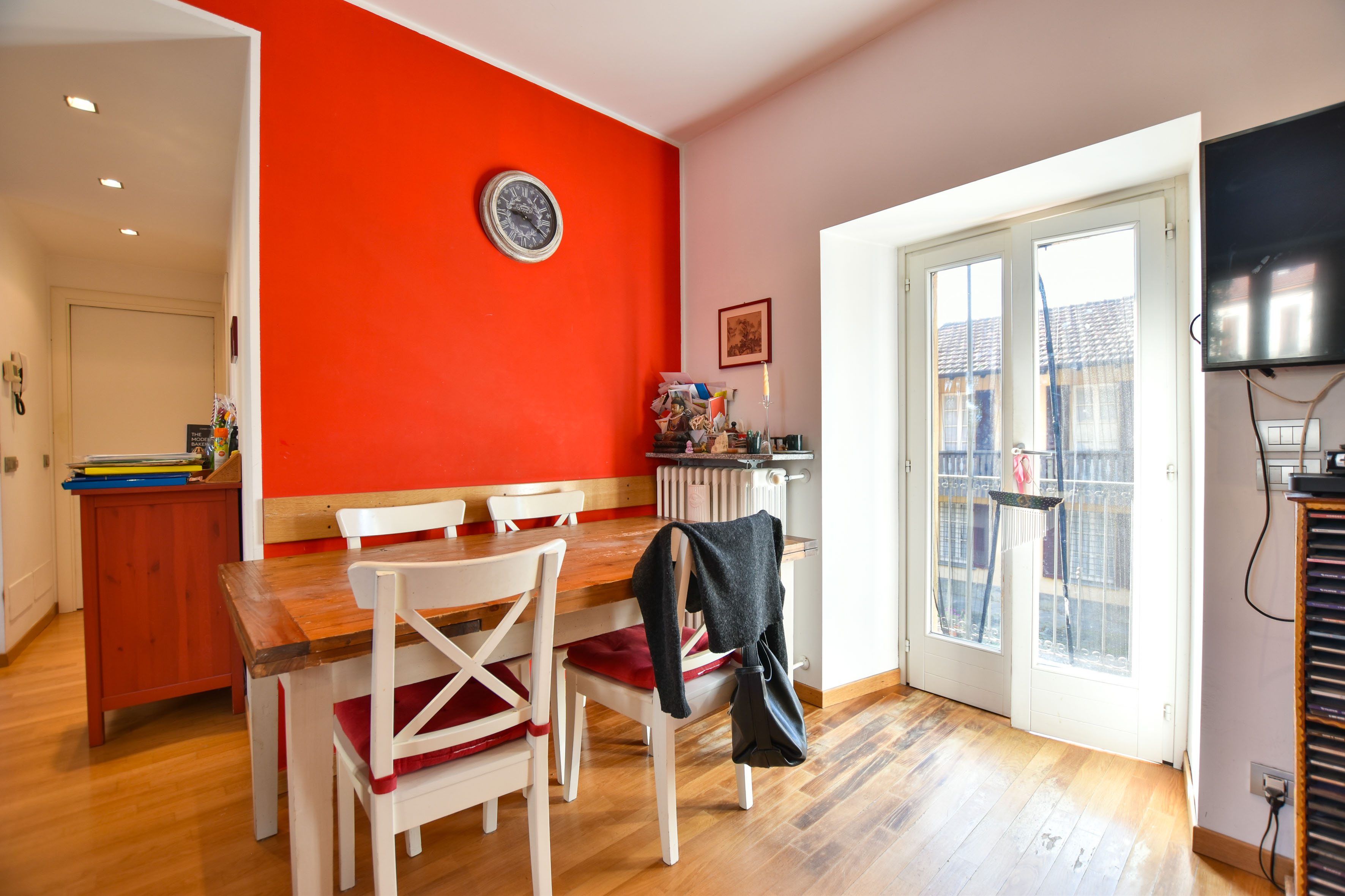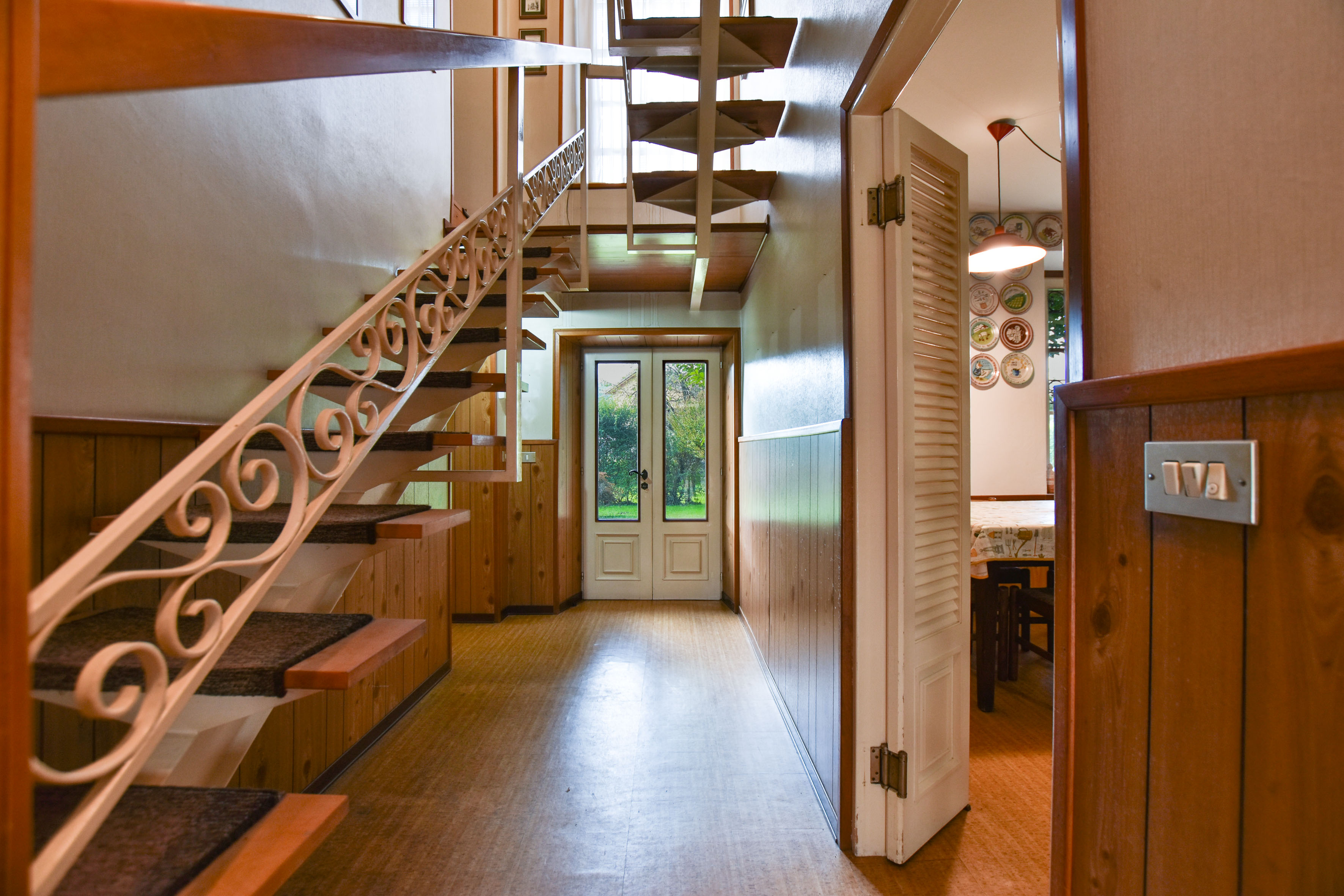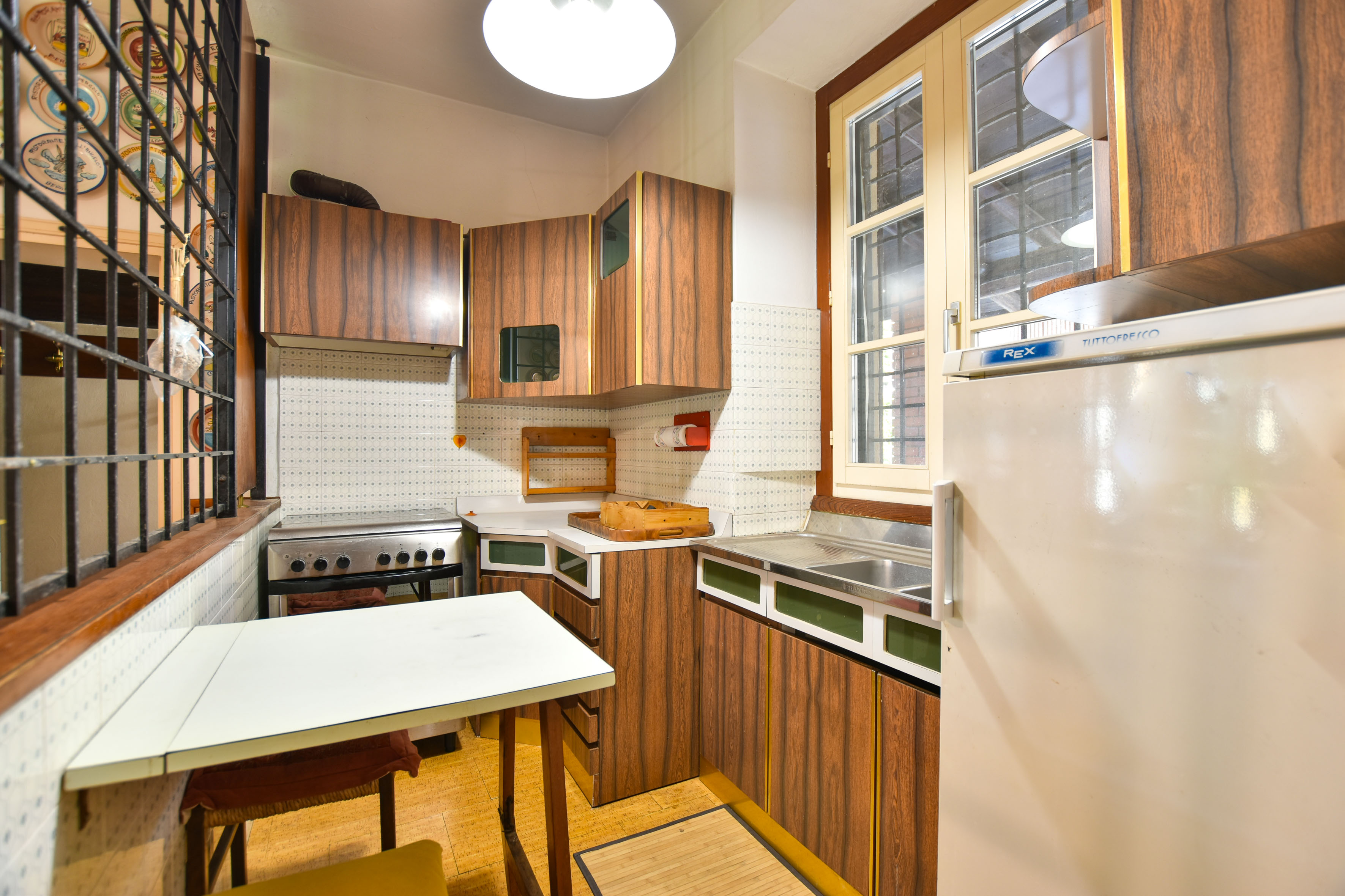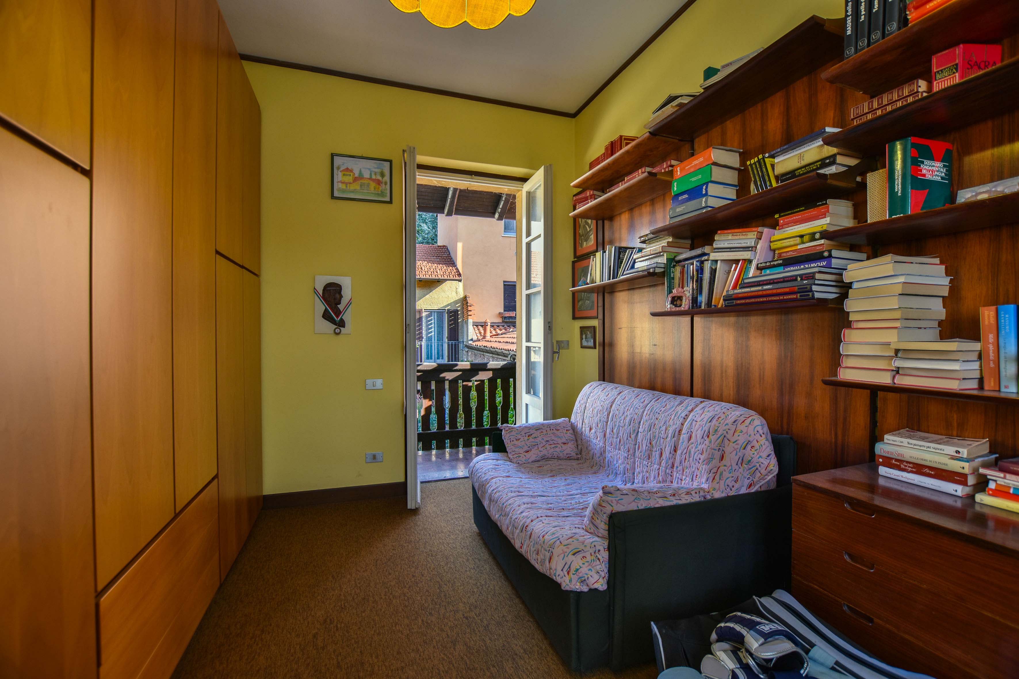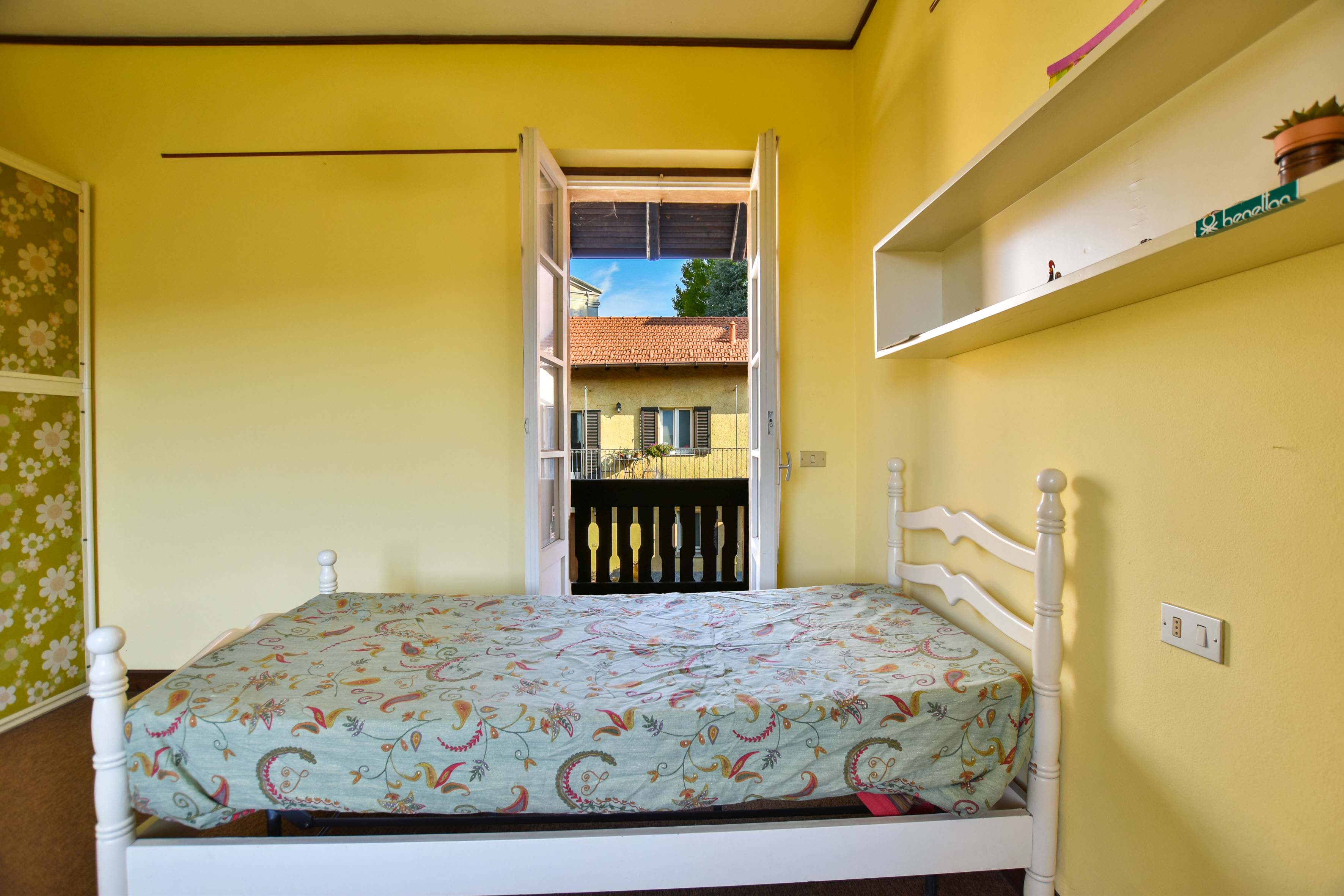 Al piano superiore si trovano un luminoso soggiorno con camino e zona pranzo, un angolo cottura e un secondo bagno con doccia, oltre a una camera matrimoniale con accesso al balcone. Gli infissi sono in legno con doppi vetri e il riscaldamento è autonomo a gas con radiatori.