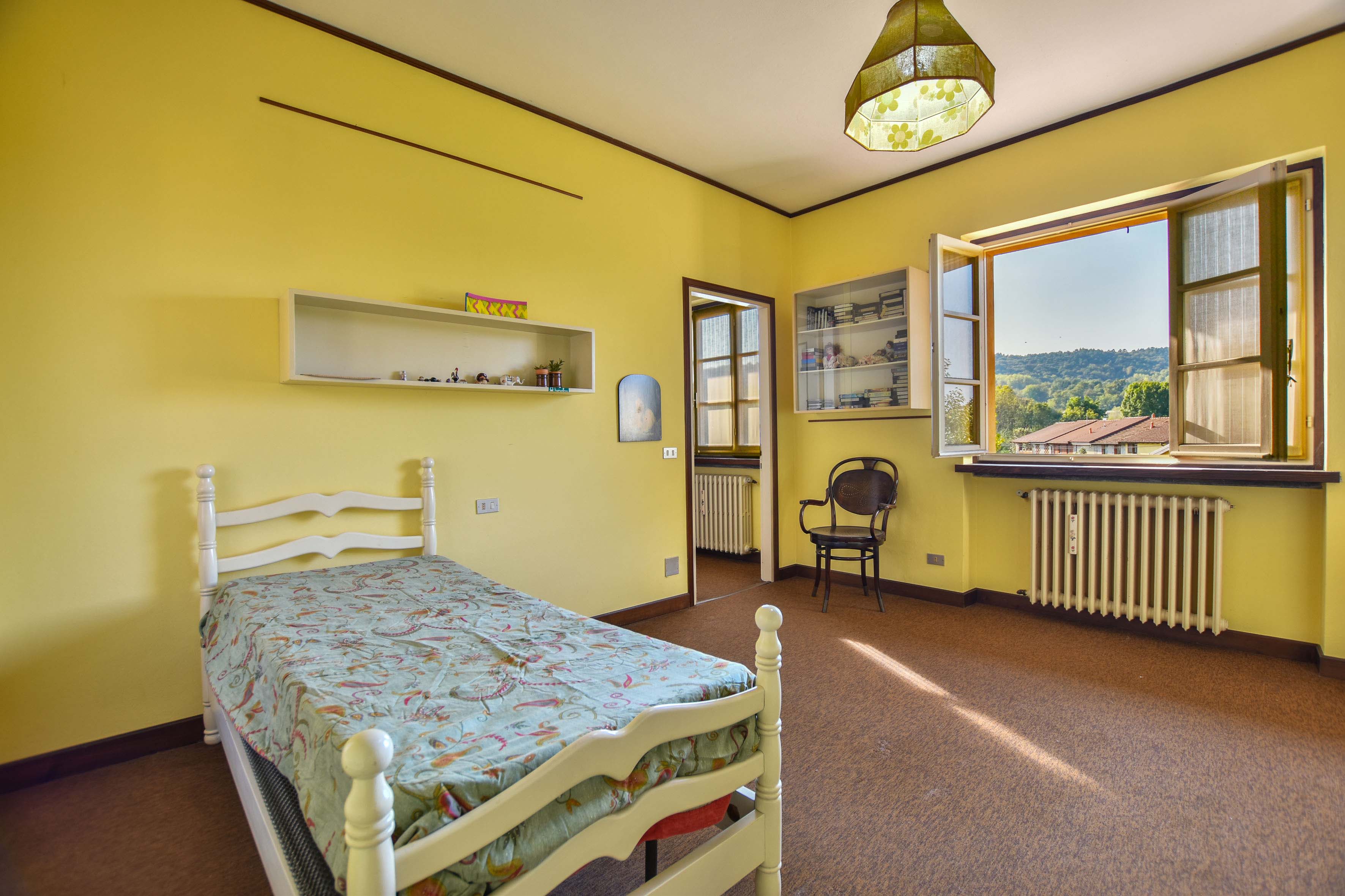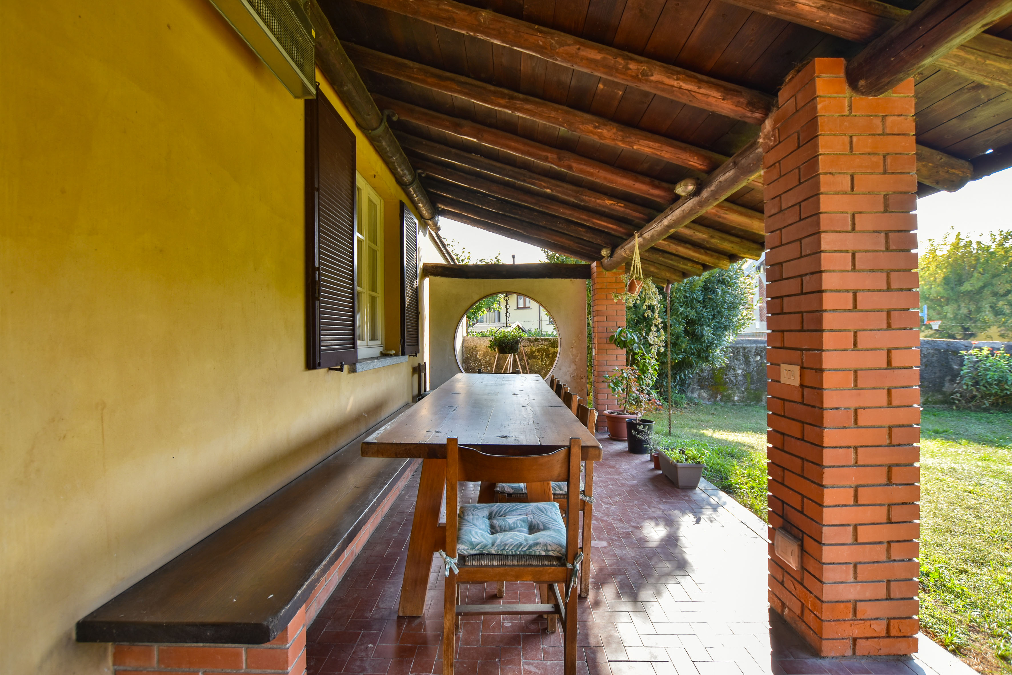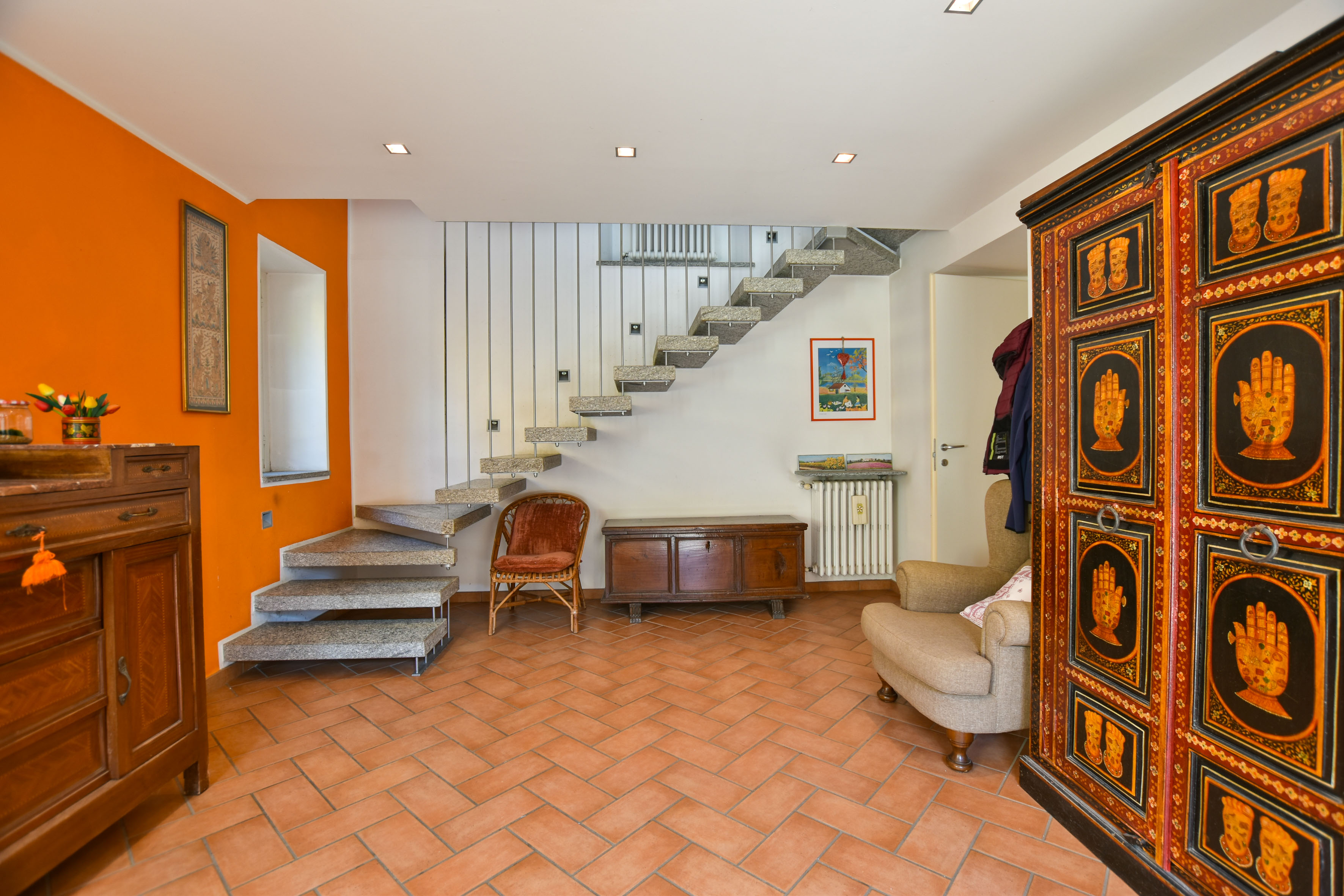 Al piano terra si trovano l’ingresso, un bagno di servizio, una cucina con zona pranzo, un ripostiglio con attacco lavatrice e un soggiorno con camino che si apre su un portico profondo e sul giardino.