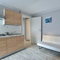 Al secondo piano sono presenti due unità distinte: la prima dispone di soggiorno con divano letto, cucina e bagno con doccia; la seconda offre soggiorno con cucina, una camera da letto e bagno con doccia. I due appartamenti del secondo piano possono essere nuovamente uniti per realizzare un’unica soluzione con soggiorno e cucina, due camere da letto e due bagni.