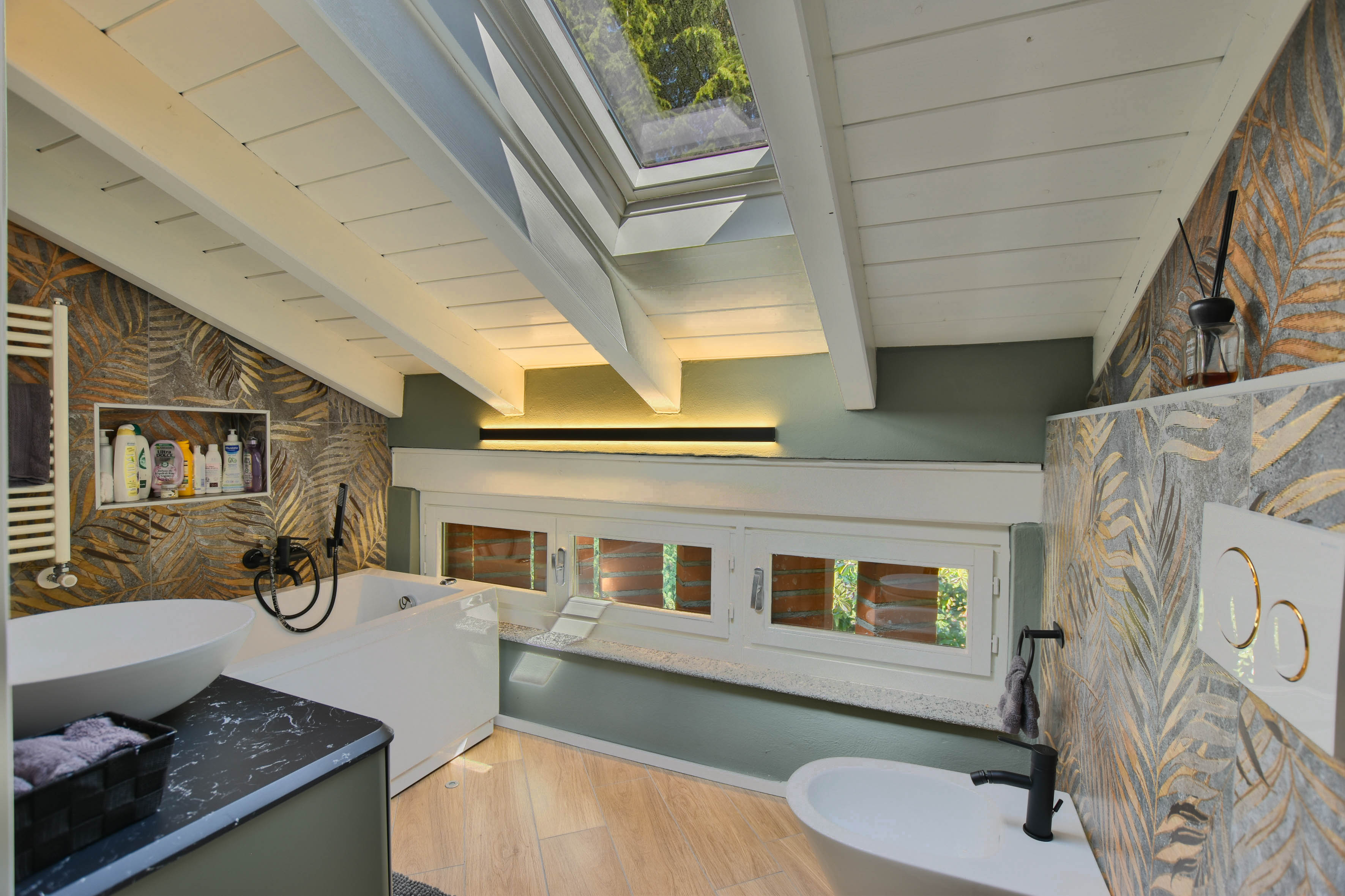 Il piano mansardato accoglie un ampio vano utilizzato come camera da letto, con bagno privato e spazi accessori.