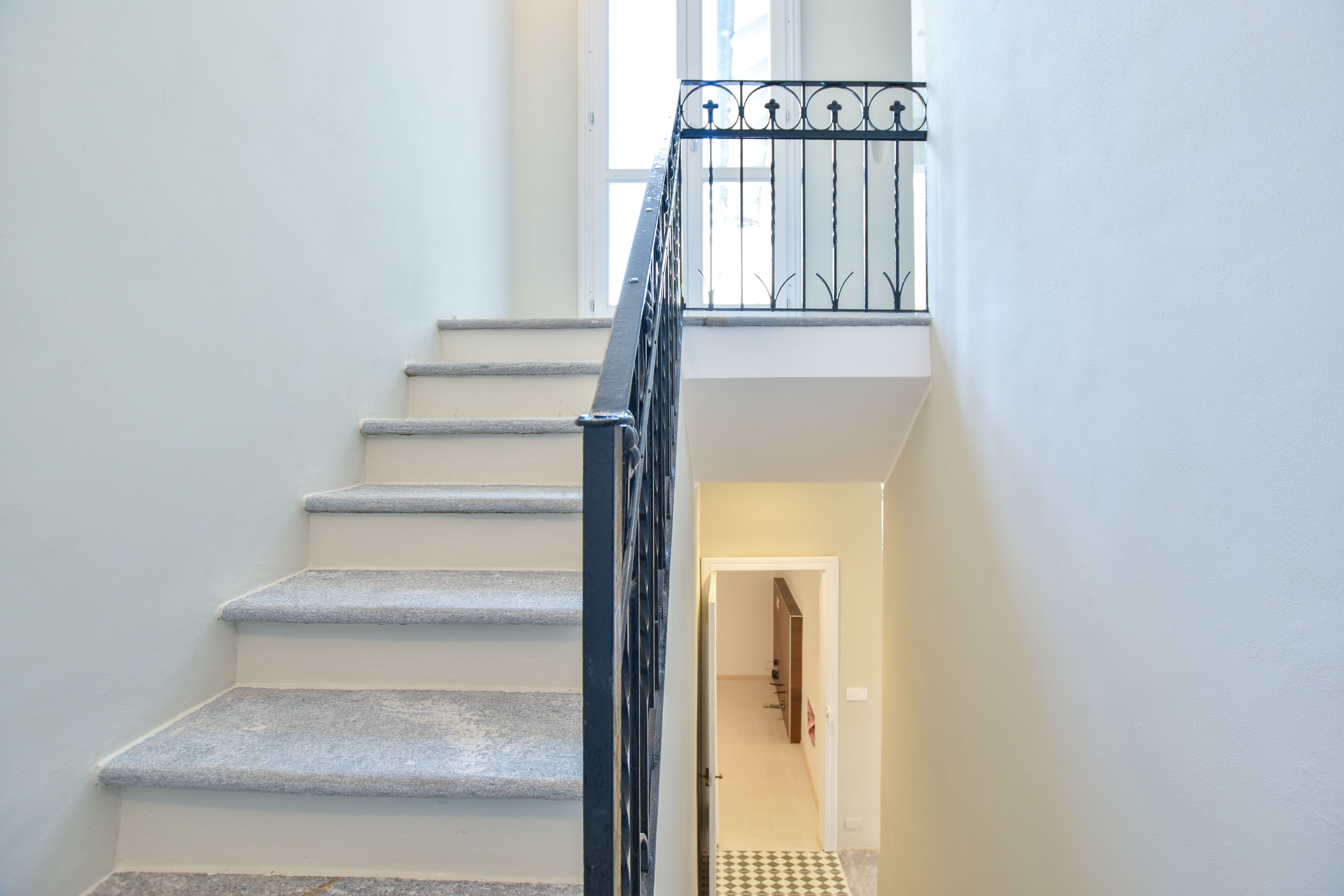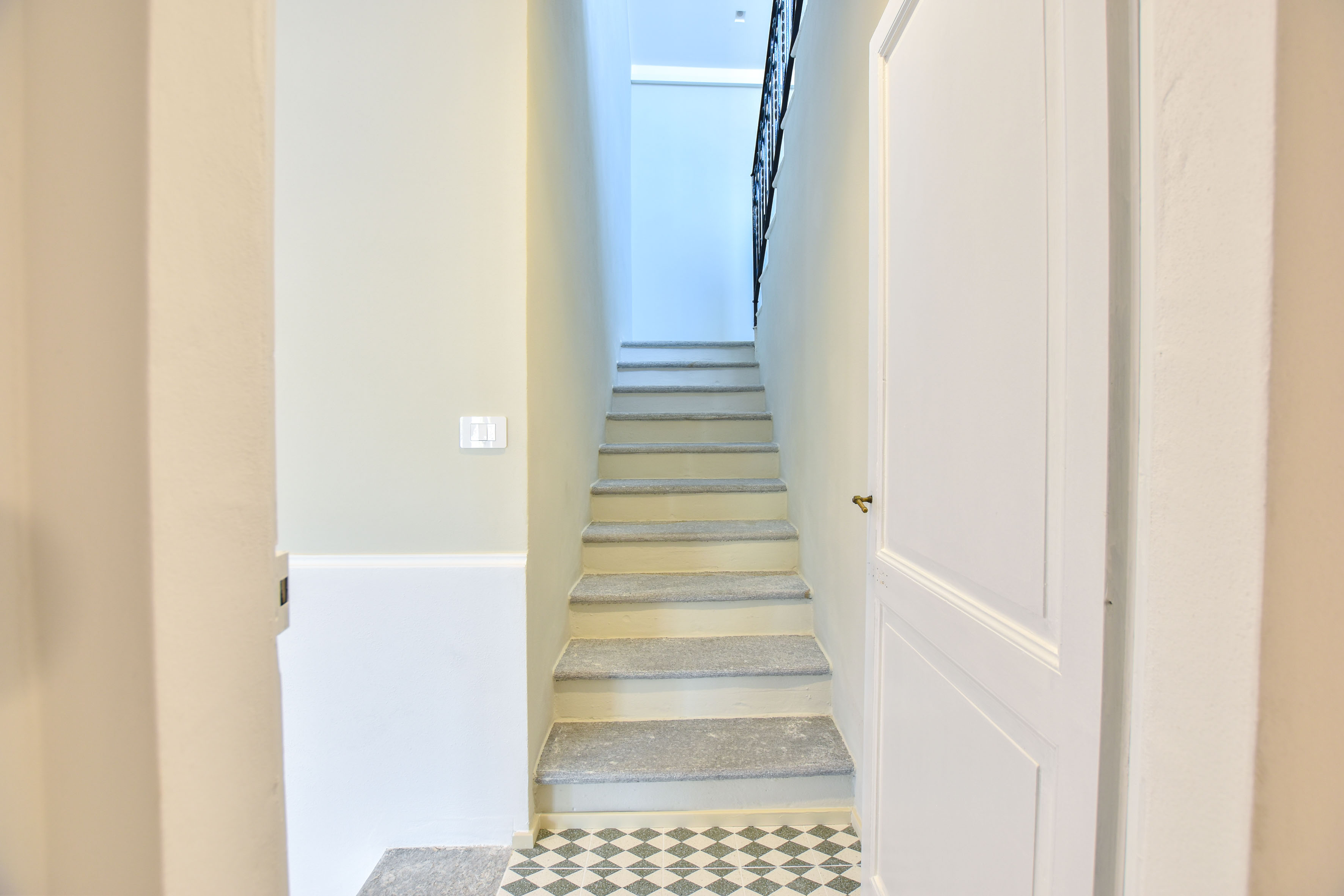 Una scala in pietra conduce al piano superiore, dove si trovano la camera padronale con balcone vista lago, una seconda camera e un ampio bagno.