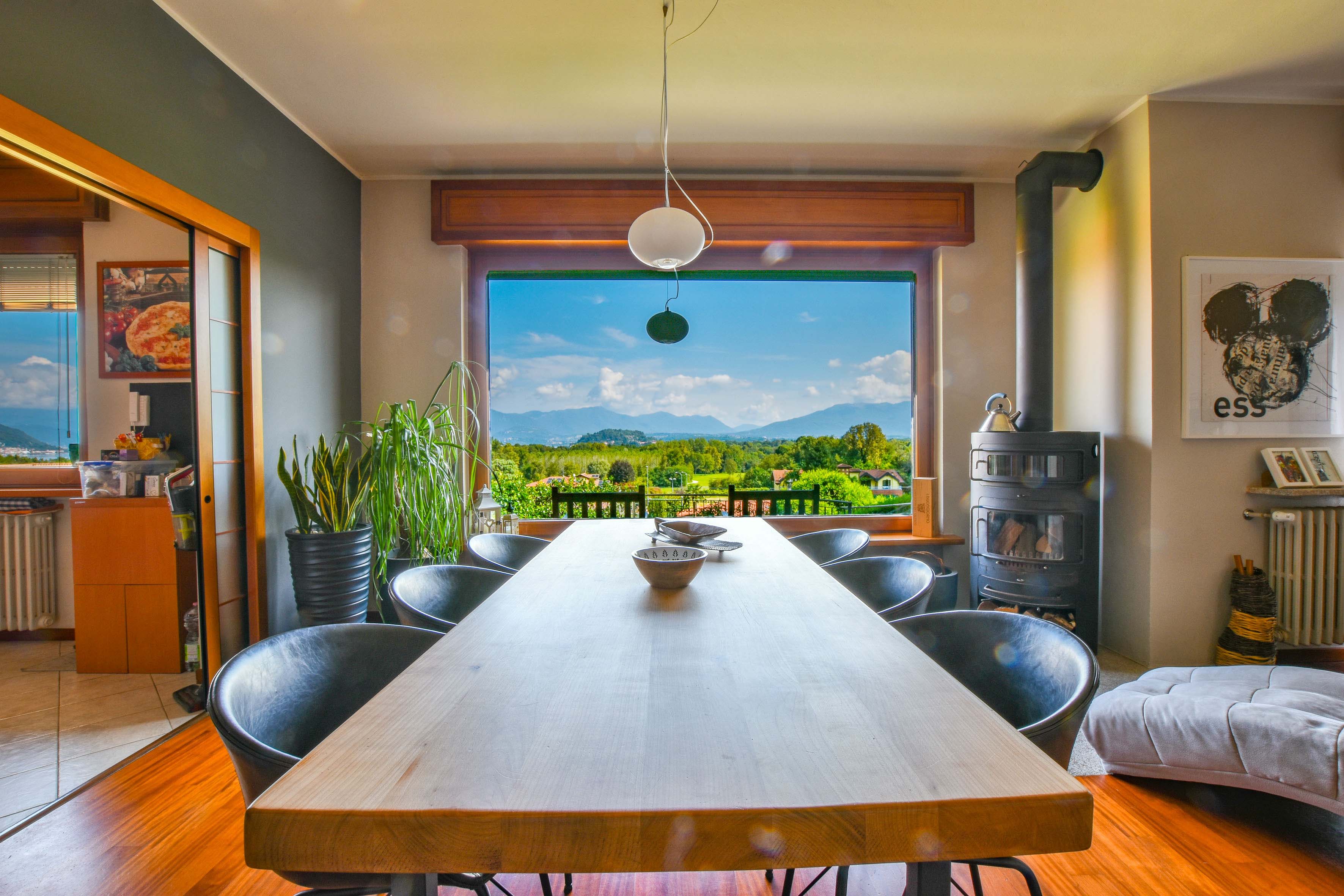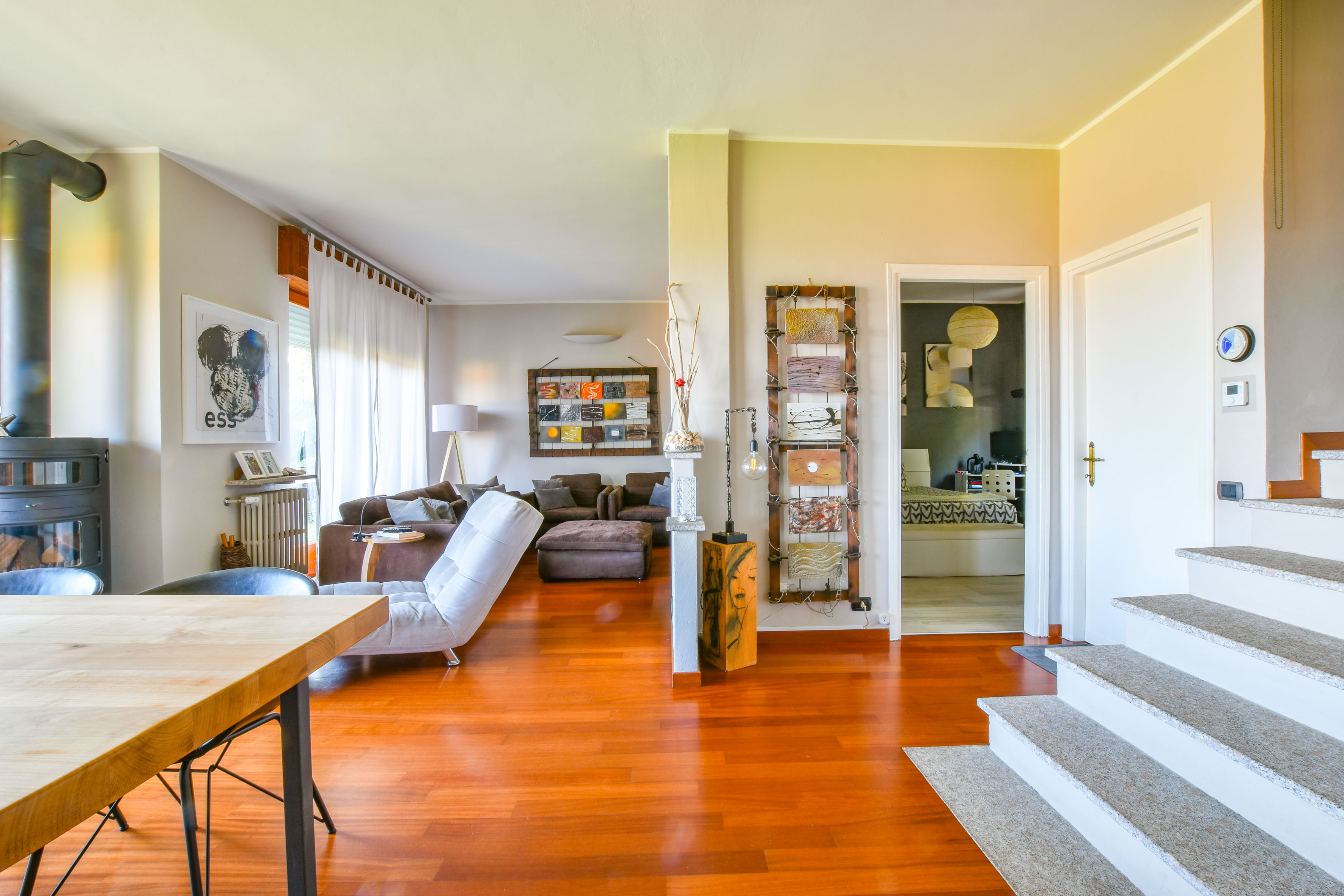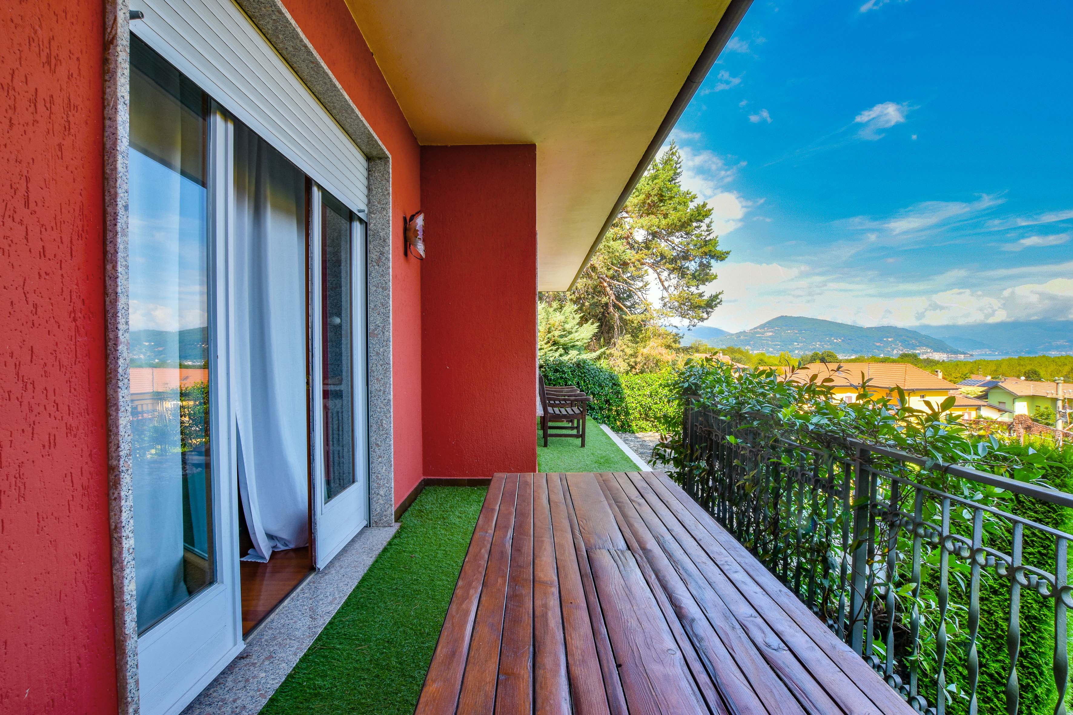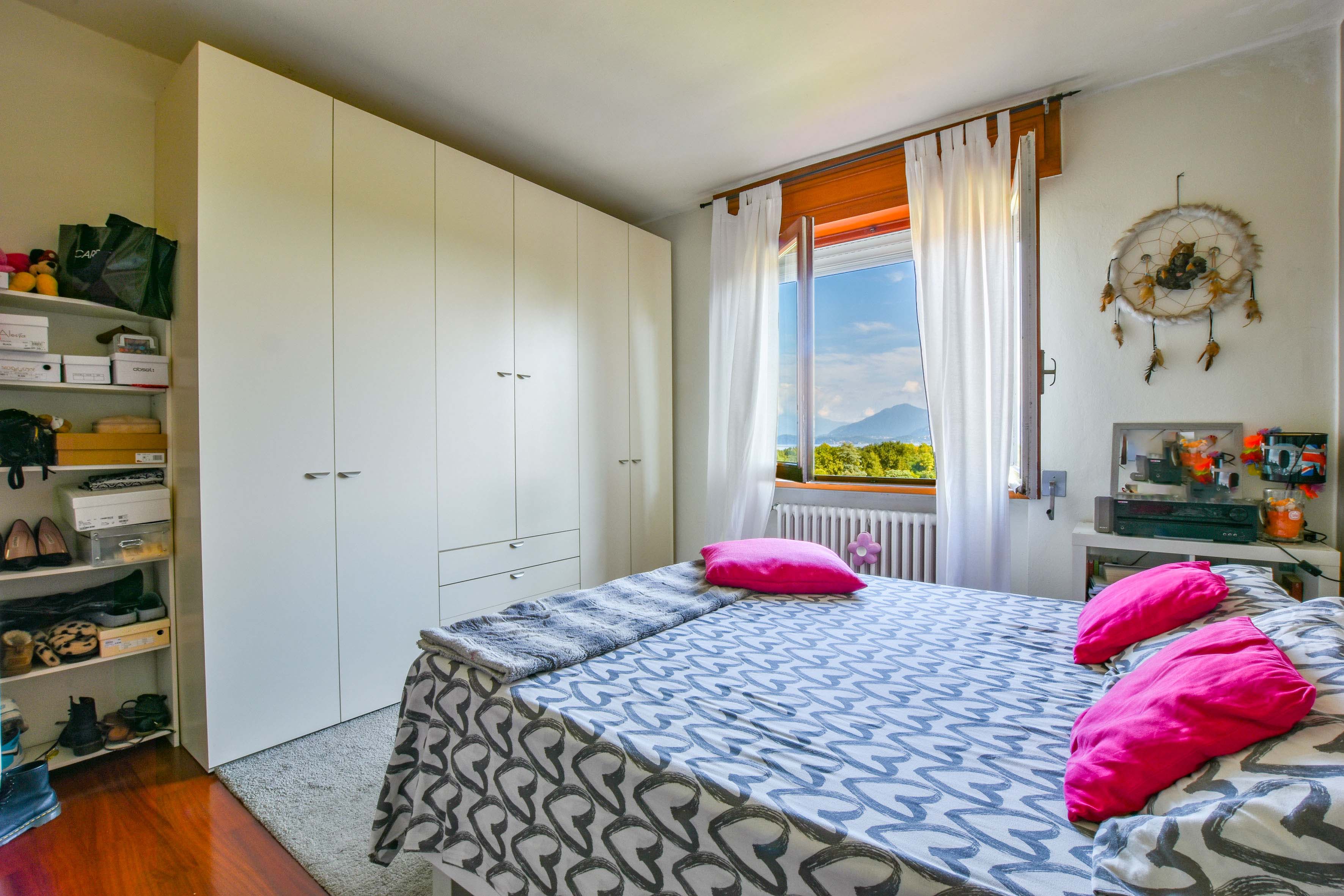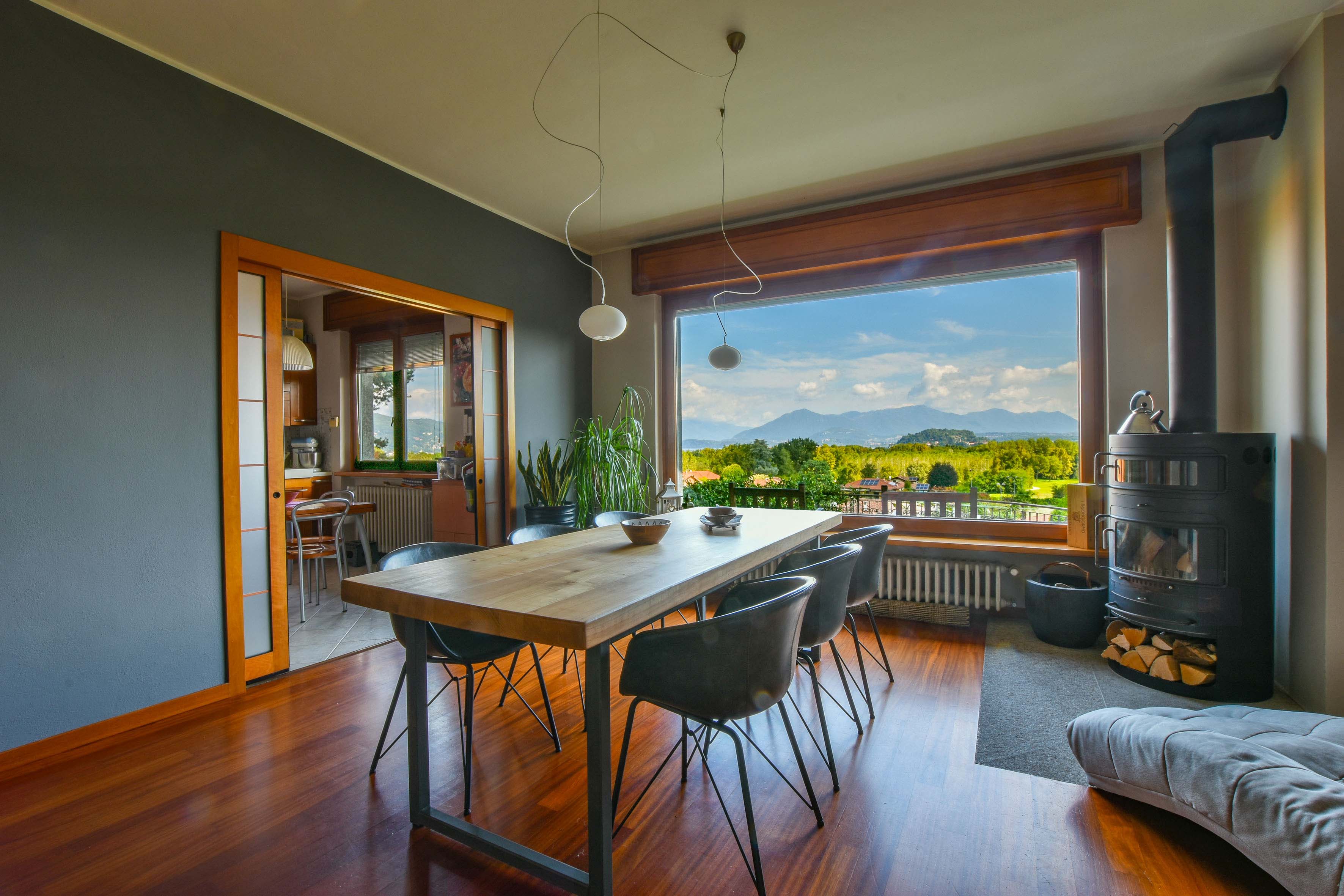 Al piano terra, l’abitazione dispone di una cucina abitabile separata da eleganti porte scorrevoli a scomparsa, inoltre troviamo un ampio soggiorno con zona pranzo e salotto, arricchito da una stufa a legna; un luogo di incontro e di condivisione, illuminato dalla luce naturale che filtra dalle ampie vetrate, affacciate sul pittoresco panorama e sul balcone che offre una vista spettacolare sul Lago Maggiore e sul paesaggio circostante. Completa il piano una camera matrimoniale, affacciata sul retro del giardino e servita da un bagno.