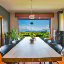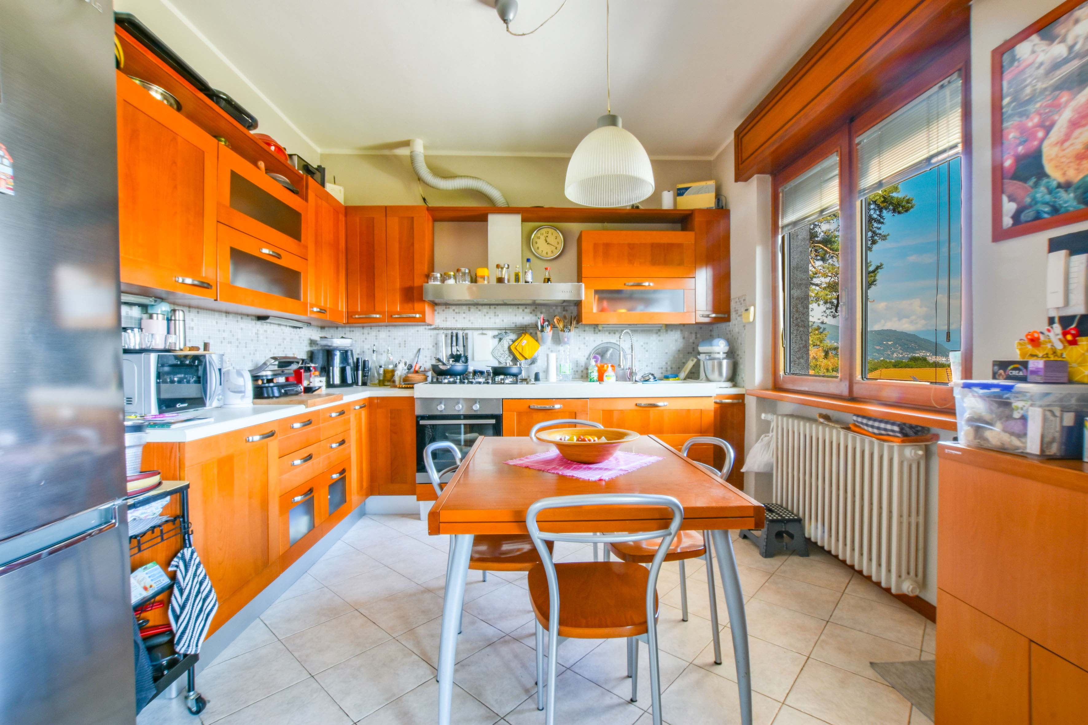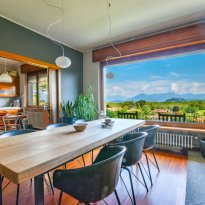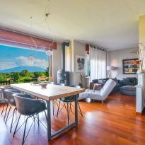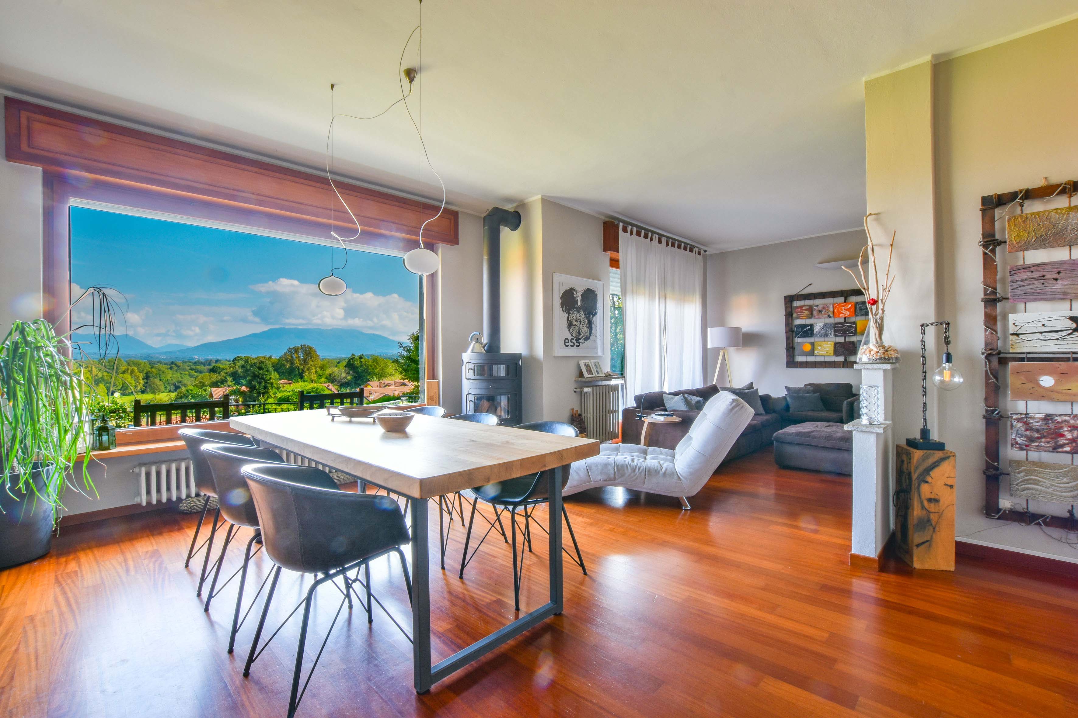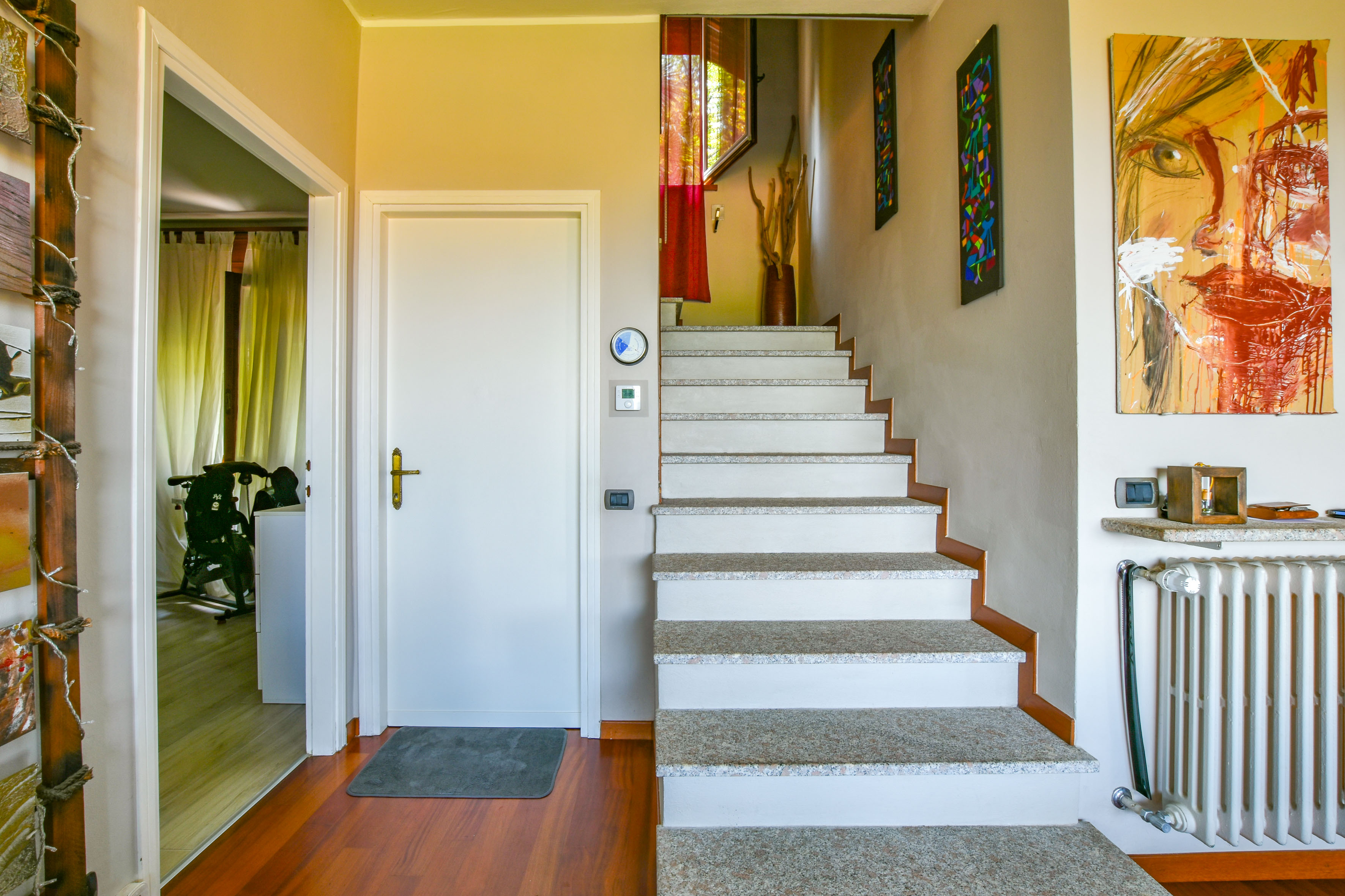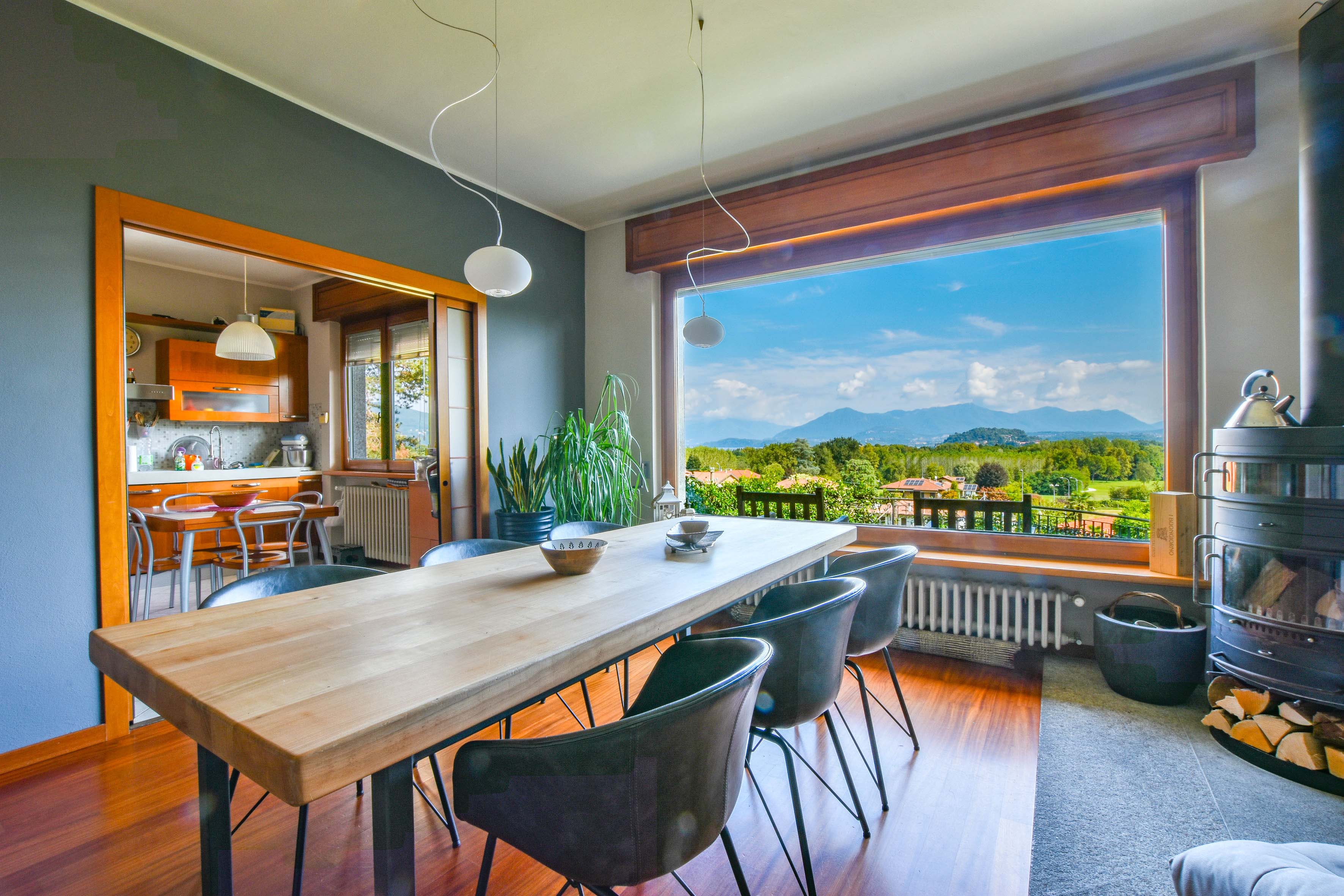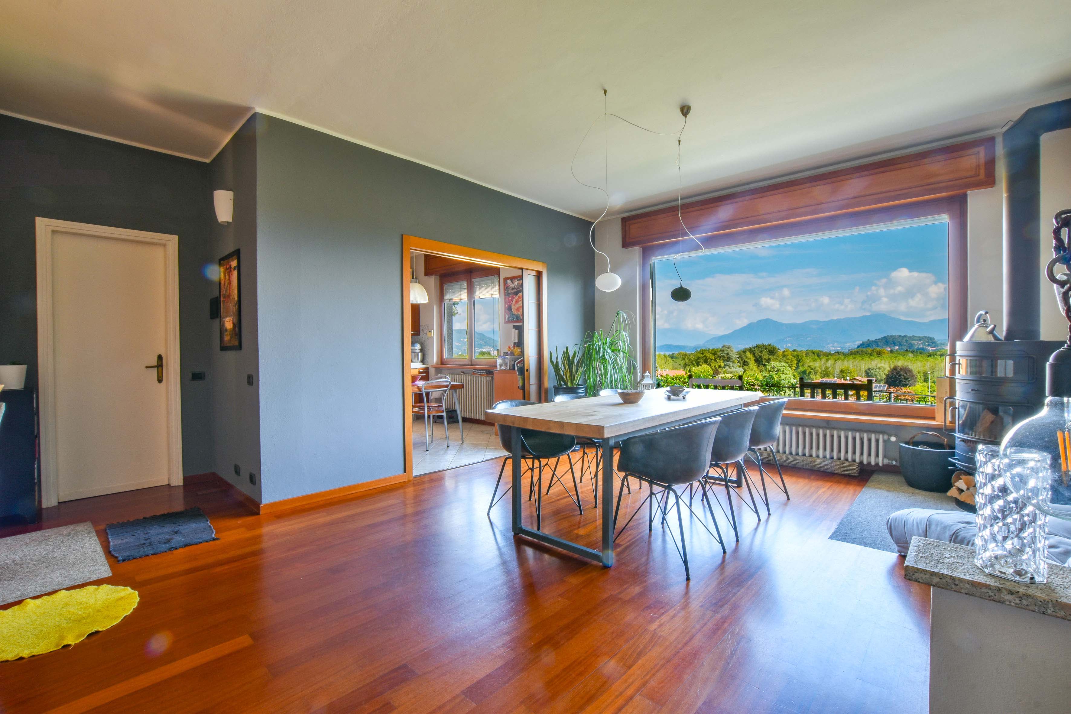 Al piano terra, l’abitazione dispone di una cucina abitabile separata da eleganti porte scorrevoli a scomparsa, inoltre troviamo un ampio soggiorno con zona pranzo e salotto, arricchito da una stufa a legna; un luogo di incontro e di condivisione, illuminato dalla luce naturale che filtra dalle ampie vetrate, affacciate sul pittoresco panorama e sul balcone che offre una vista spettacolare sul Lago Maggiore e sul paesaggio circostante. Completa il piano una camera matrimoniale, affacciata sul retro del giardino e servita da un bagno.