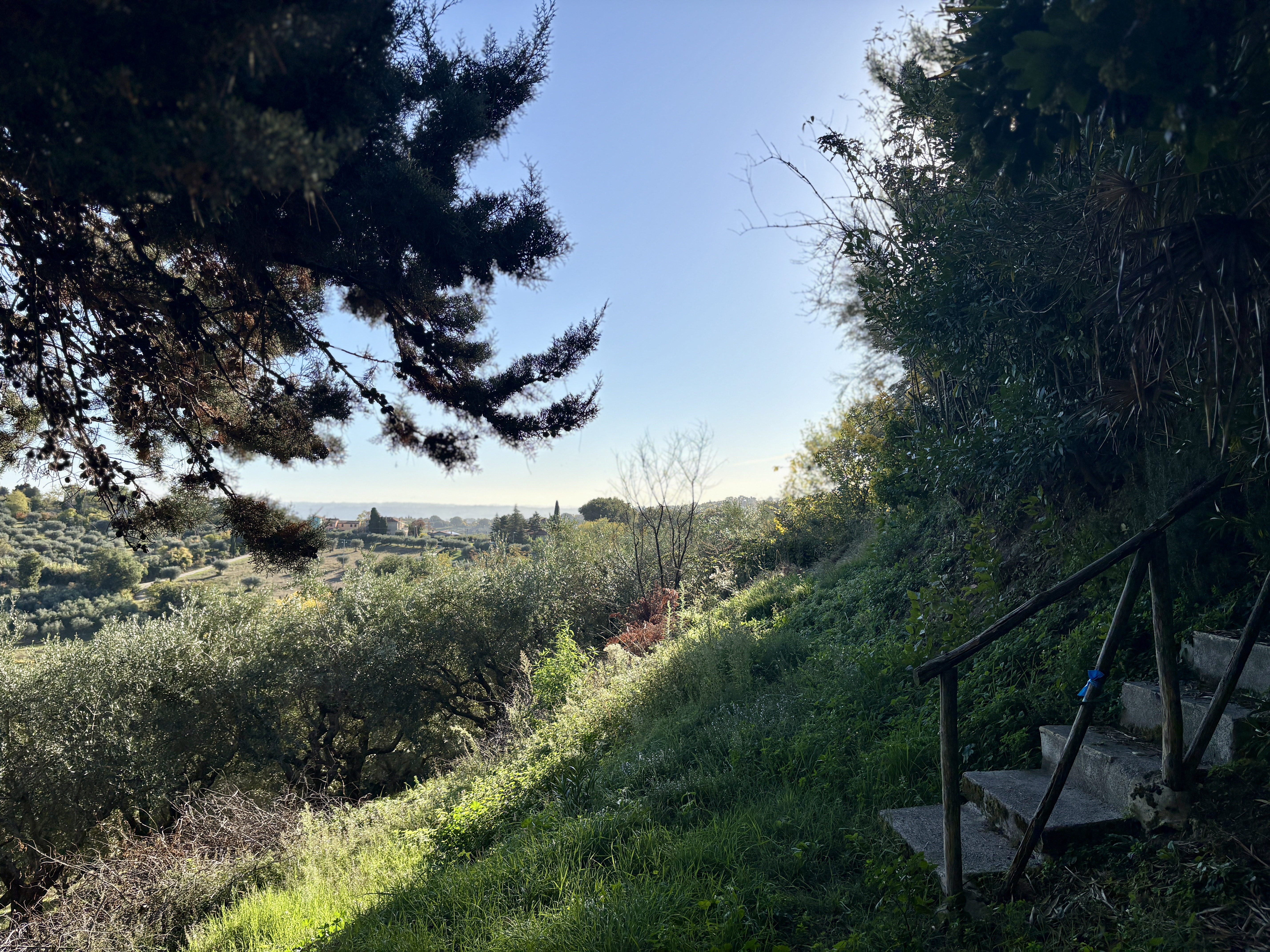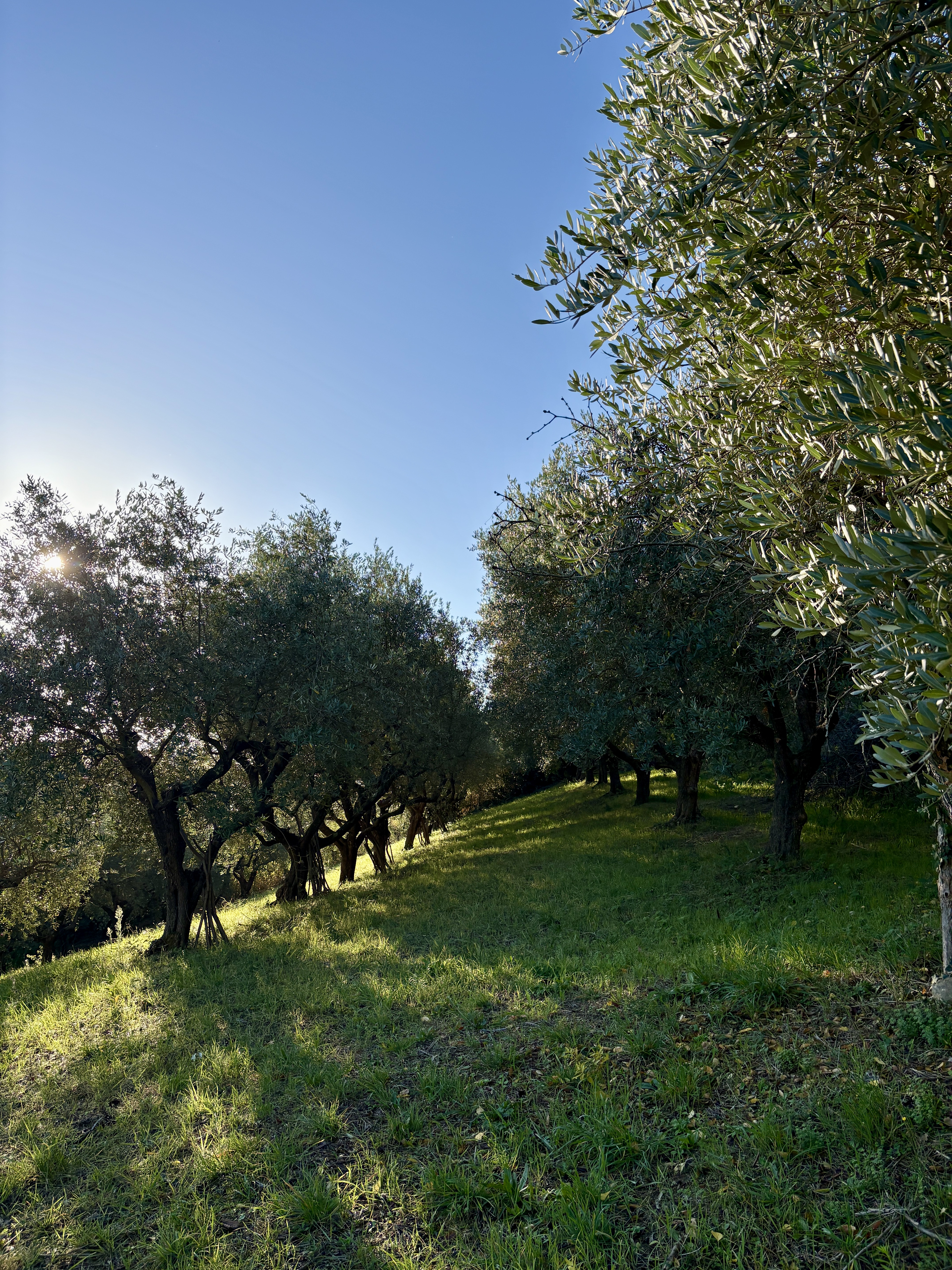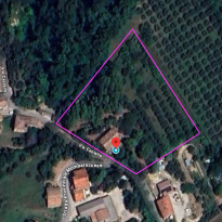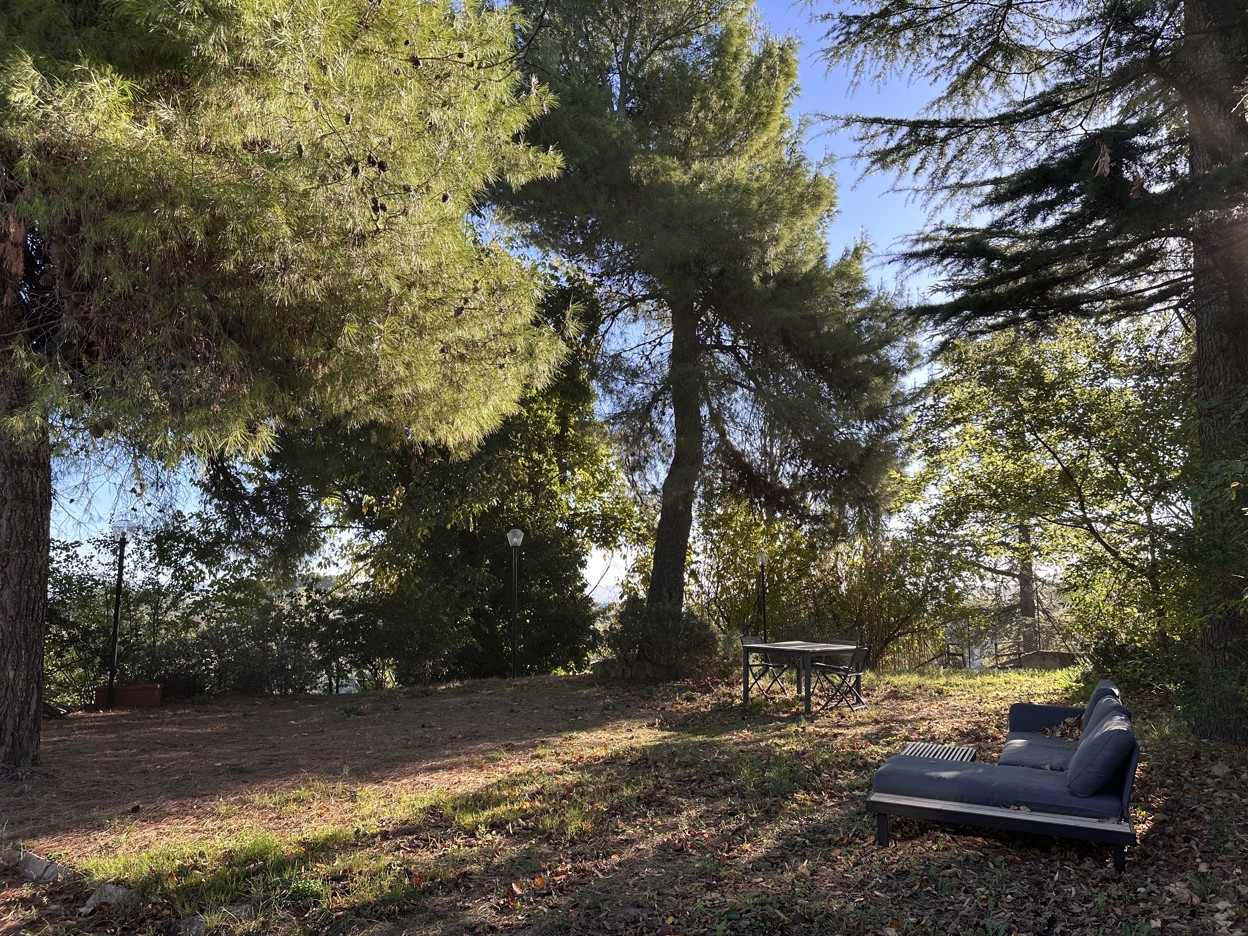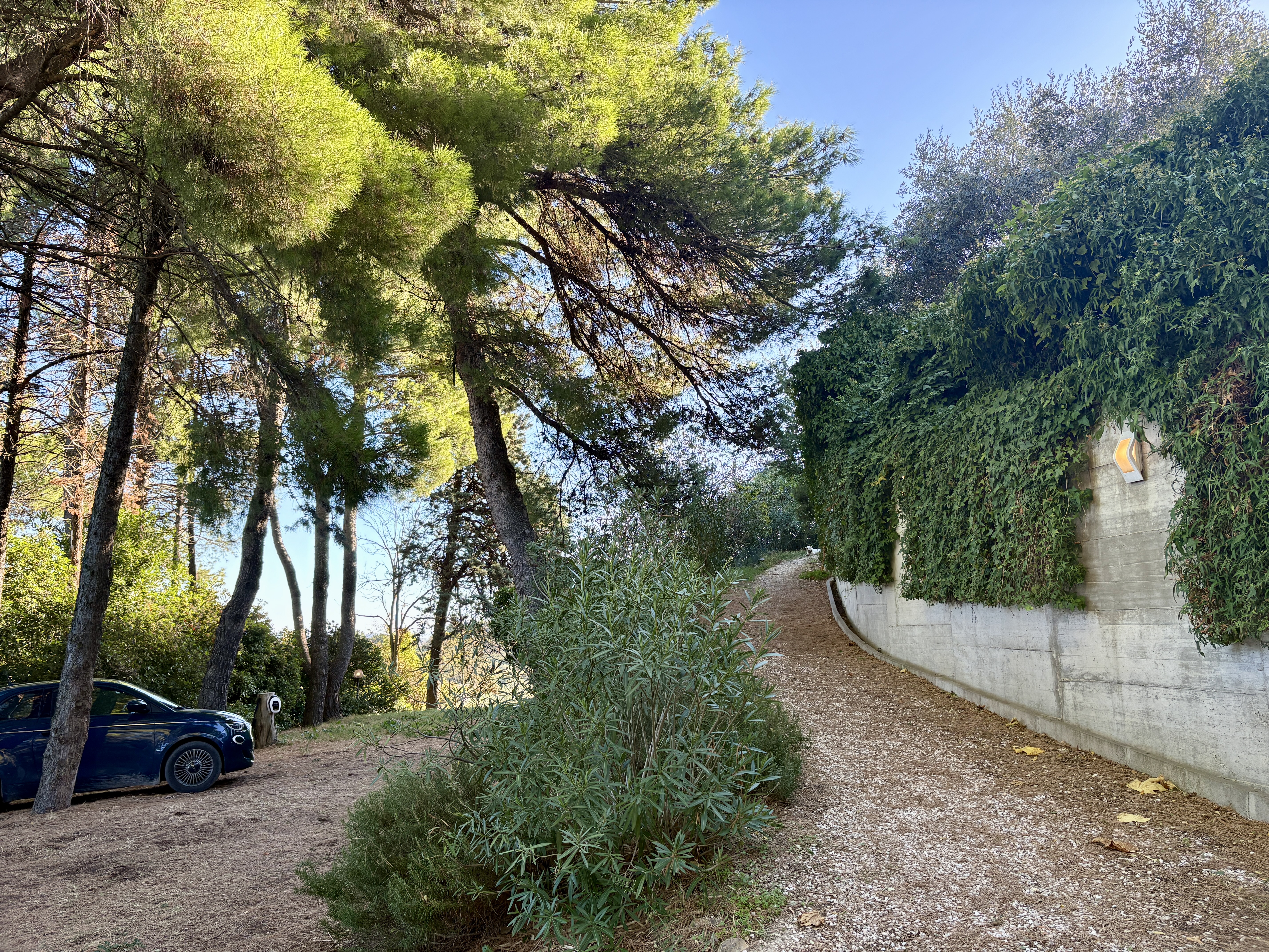 Una bella e spaziosa terrazza è stata recentemente creata su due lati della casa; dal giardino abbastanza pianeggiante che circonda la casa si ha una vista sul mare nelle giornate limpide. Il frutteto con diversi alberi da frutto e pini e 70 ulivi maturi si trova un po' più in basso. Il terreno, con una superficie di 5.561 m², è completamente recintato e, sebbene la casa non sia isolata, offre la massima privacy. La proprietà è facilmente accessibile tramite una strada asfaltata molto tranquilla, con accesso alla casa tramite 2 cancelli d'ingresso.