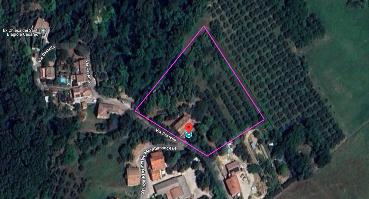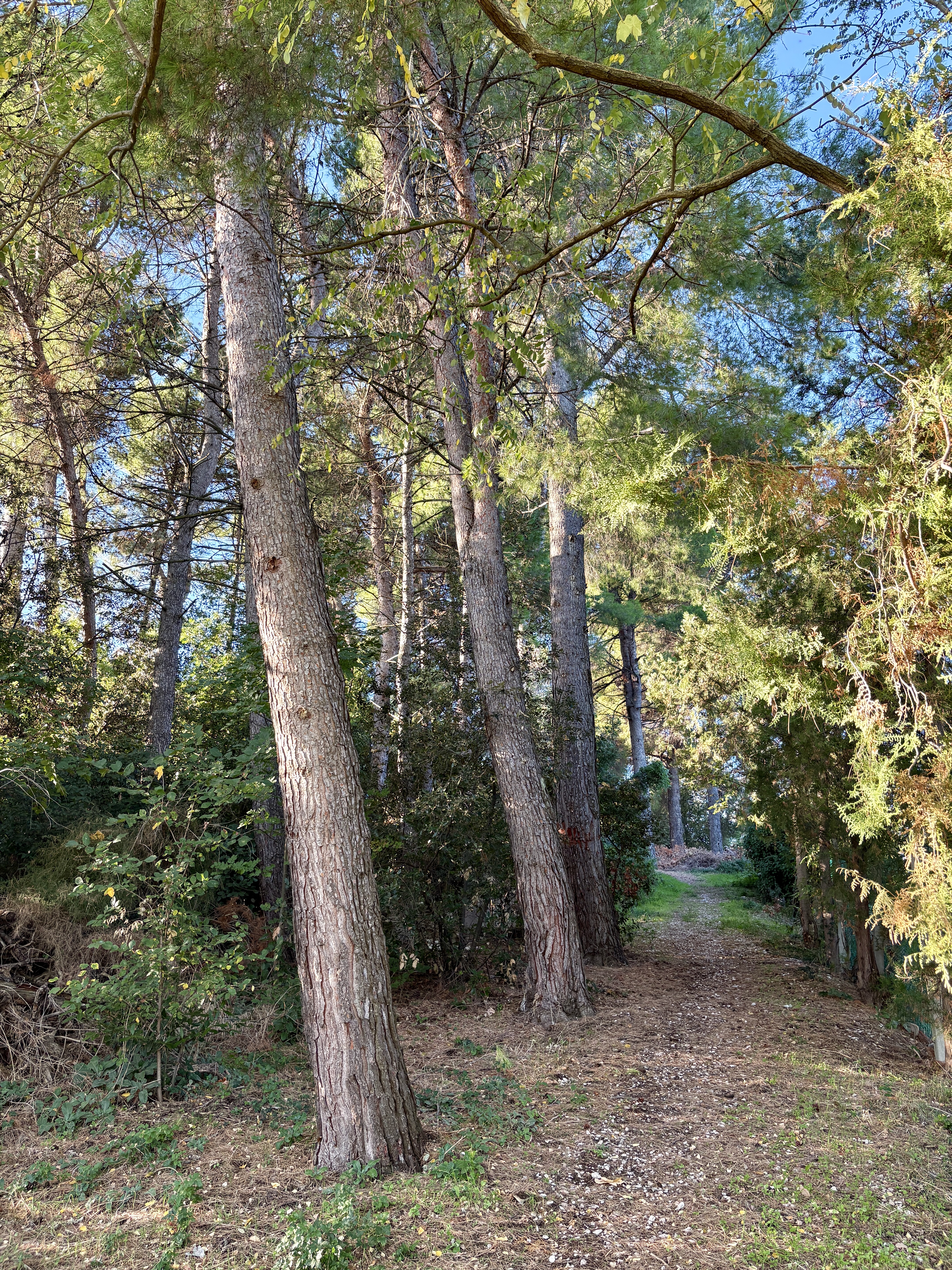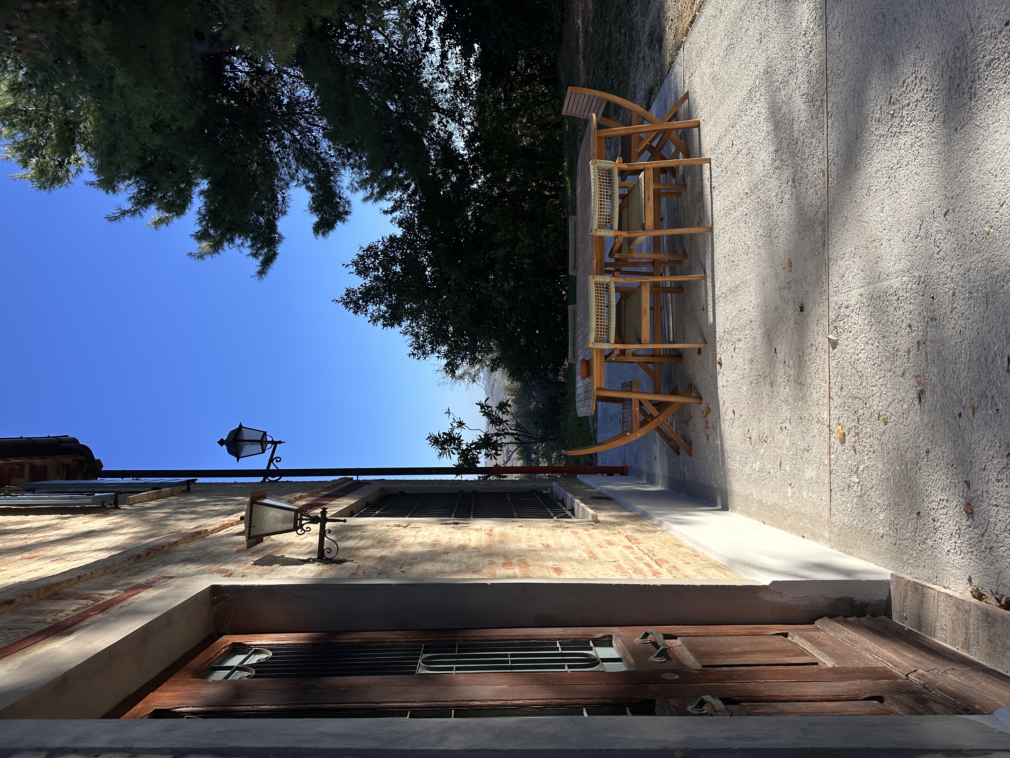 Una bella e spaziosa terrazza è stata recentemente creata su due lati della casa; dal giardino abbastanza pianeggiante che circonda la casa si ha una vista sul mare nelle giornate limpide. Il frutteto con diversi alberi da frutto e pini e 70 ulivi maturi si trova un po' più in basso. Il terreno, con una superficie di 5.561 m², è completamente recintato e, sebbene la casa non sia isolata, offre la massima privacy. La proprietà è facilmente accessibile tramite una strada asfaltata molto tranquilla, con accesso alla casa tramite 2 cancelli d'ingresso.