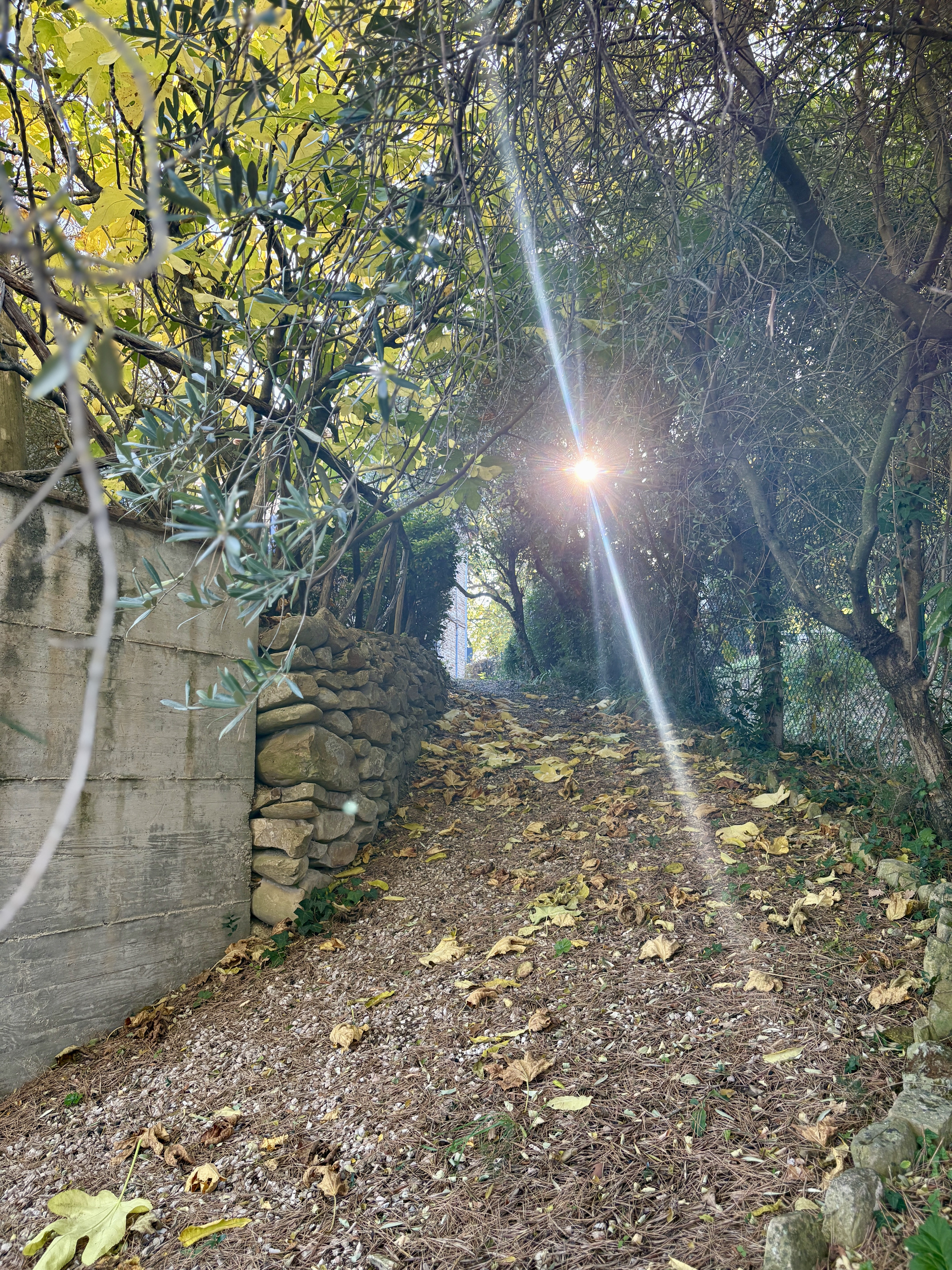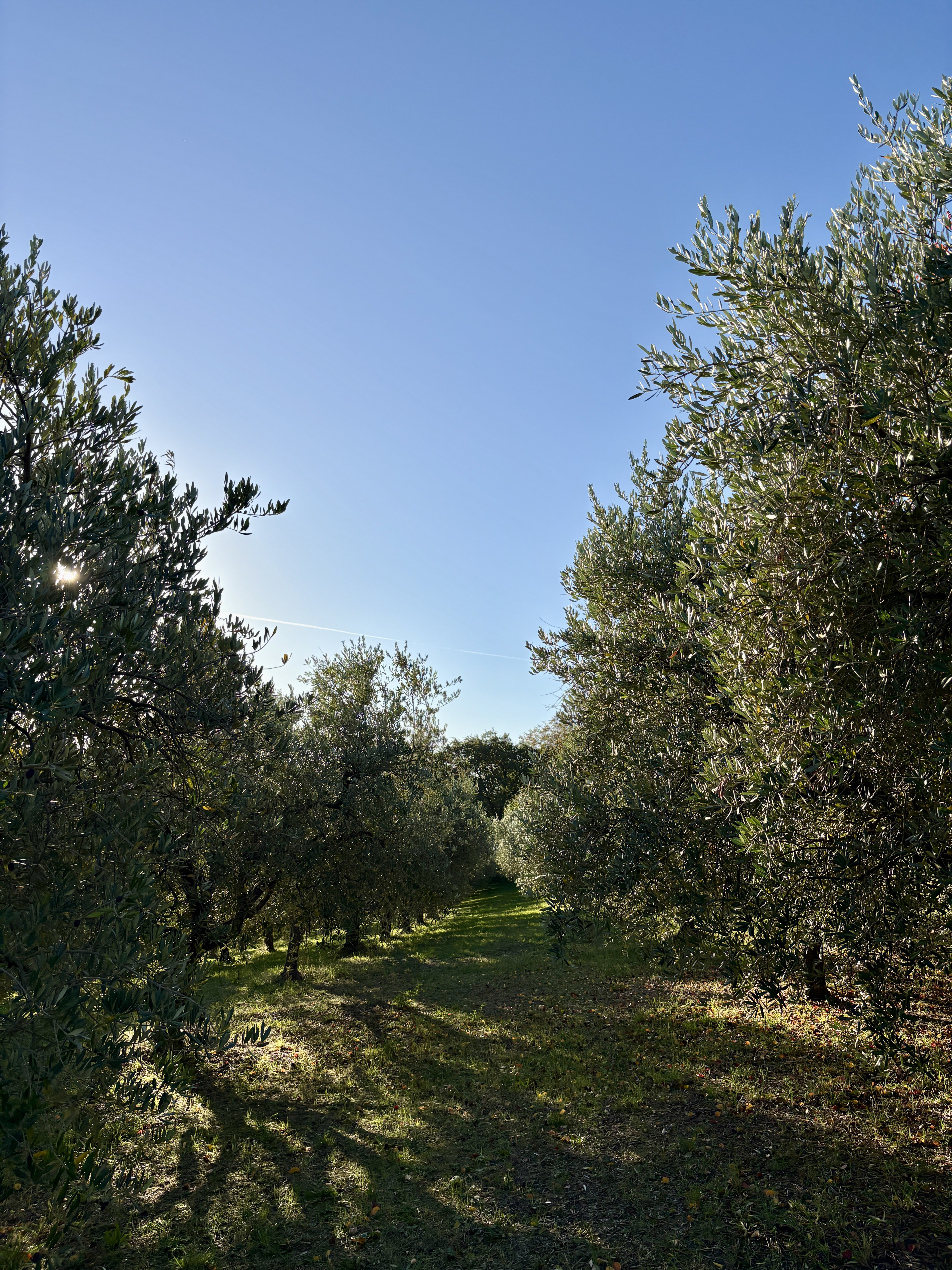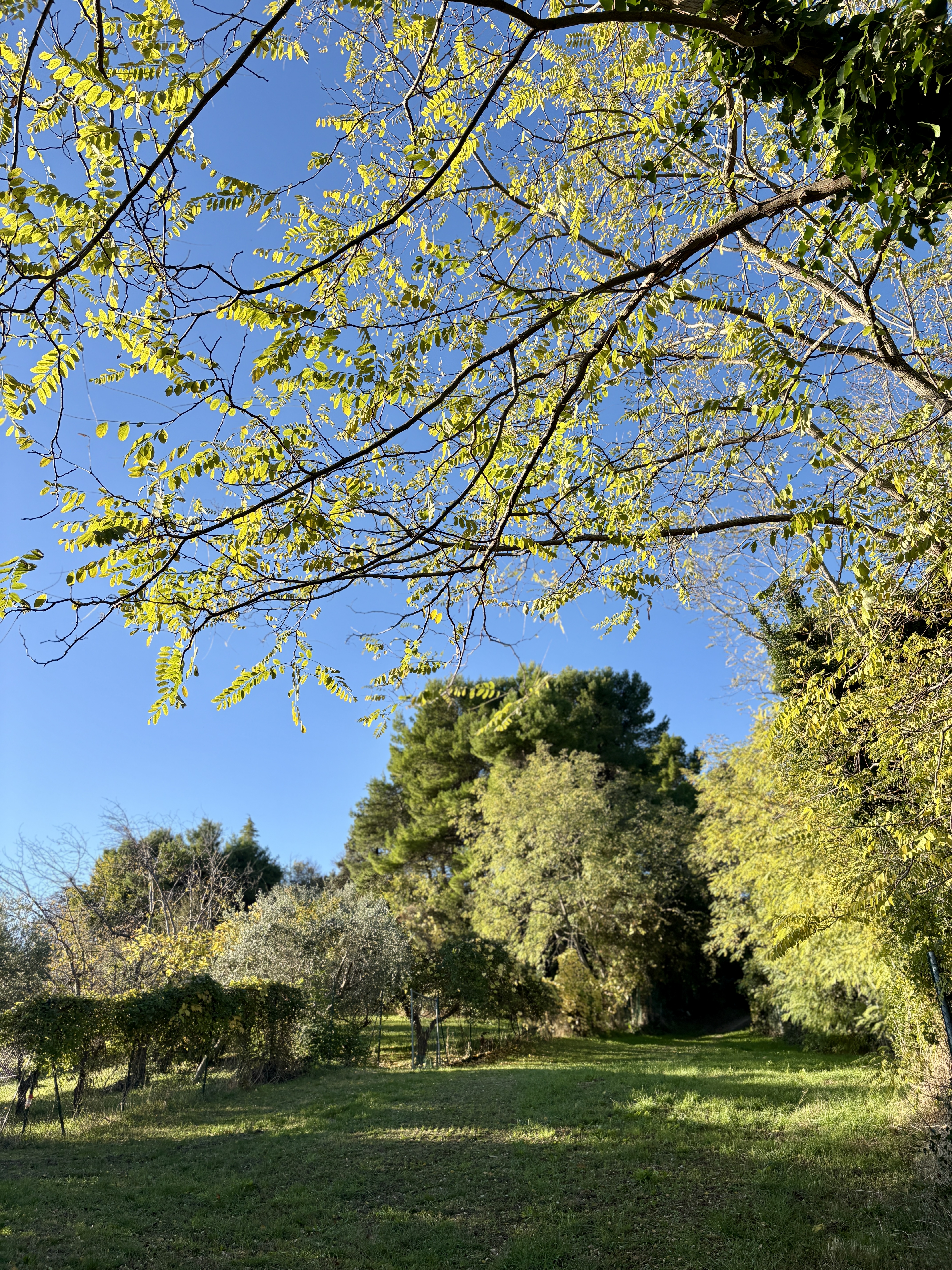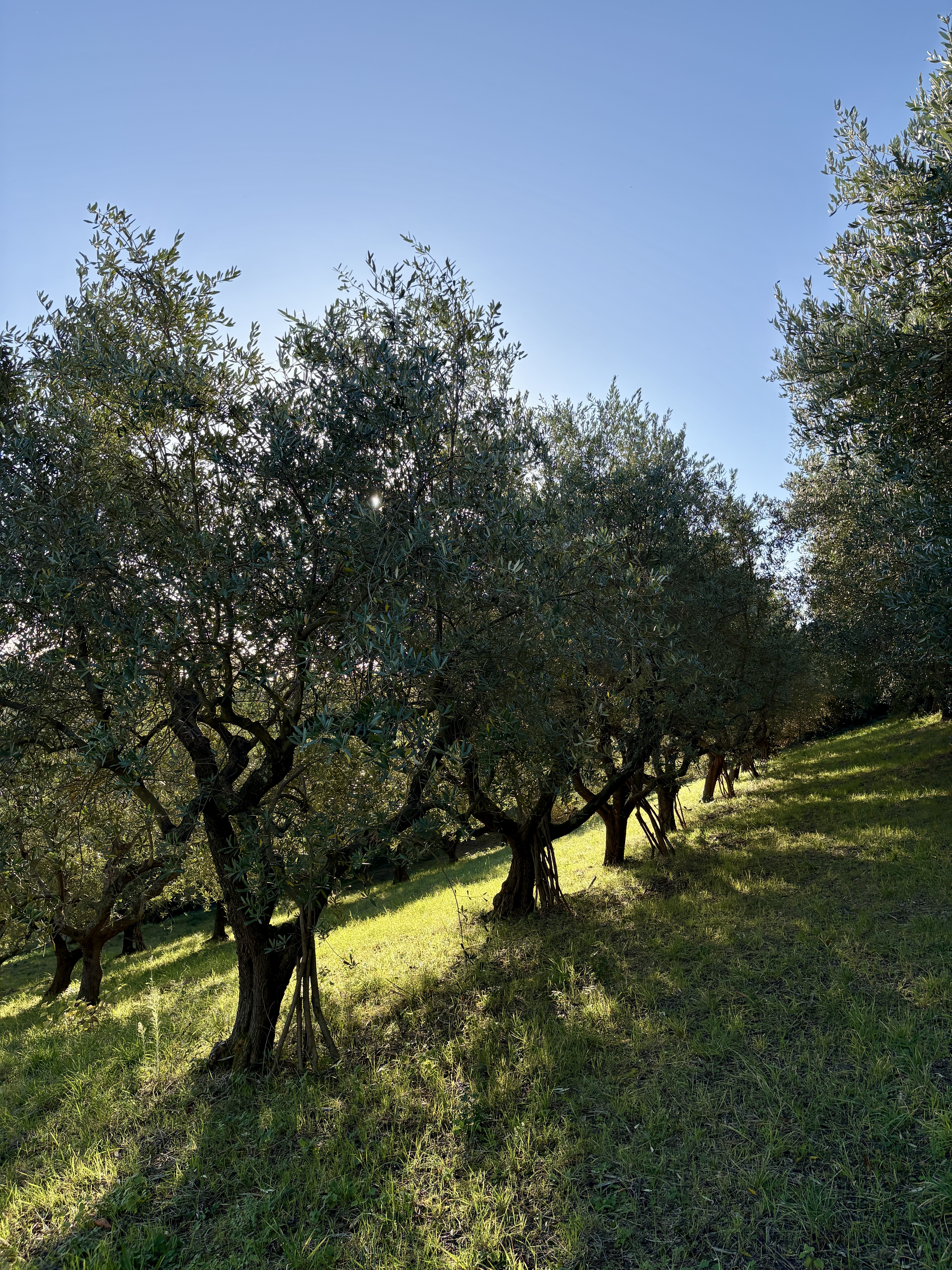 Una bella e spaziosa terrazza è stata recentemente creata su due lati della casa; dal giardino abbastanza pianeggiante che circonda la casa si ha una vista sul mare nelle giornate limpide. Il frutteto con diversi alberi da frutto e pini e 70 ulivi maturi si trova un po' più in basso. Il terreno, con una superficie di 5.561 m², è completamente recintato e, sebbene la casa non sia isolata, offre la massima privacy. La proprietà è facilmente accessibile tramite una strada asfaltata molto tranquilla, con accesso alla casa tramite 2 cancelli d'ingresso.