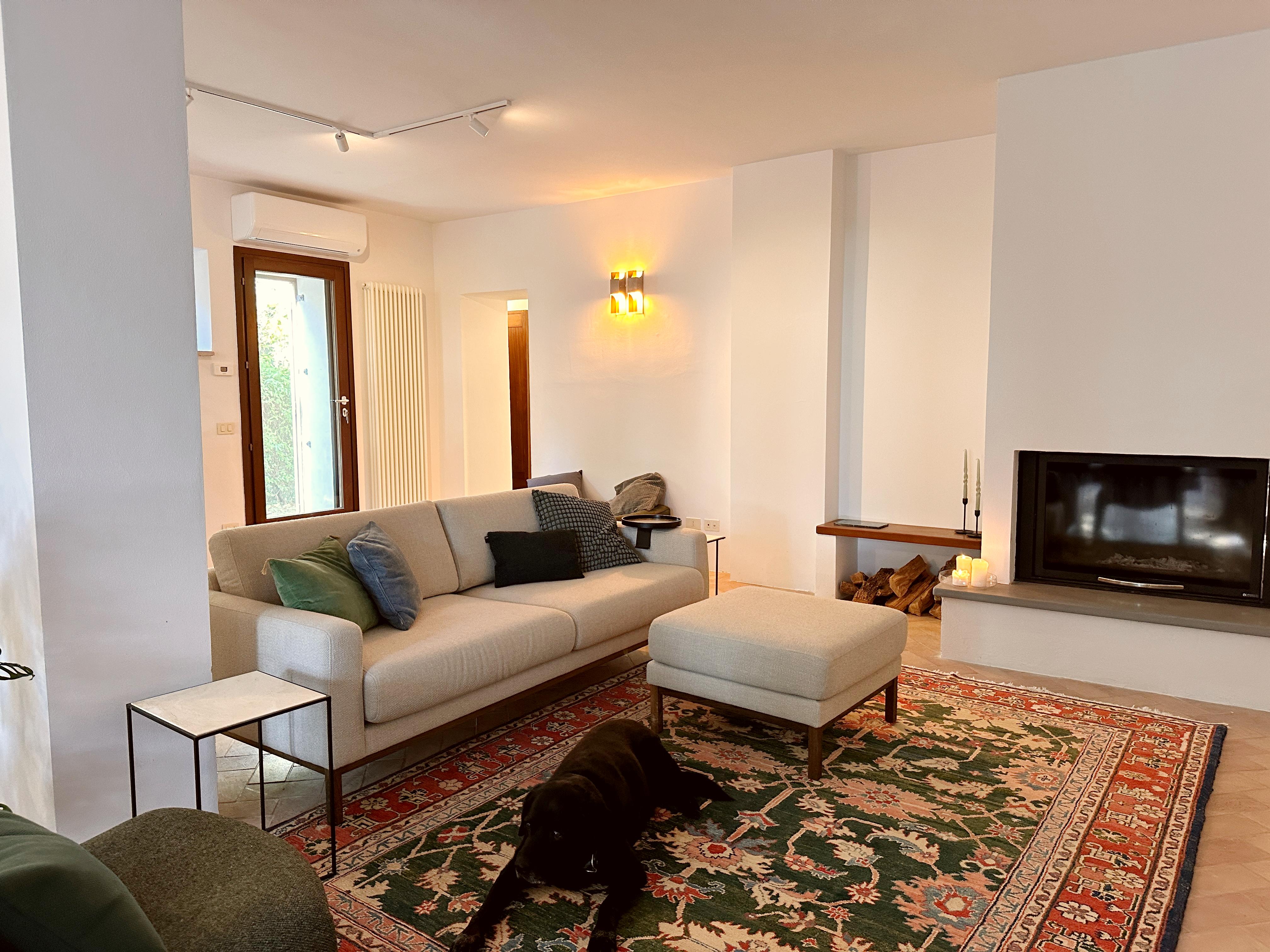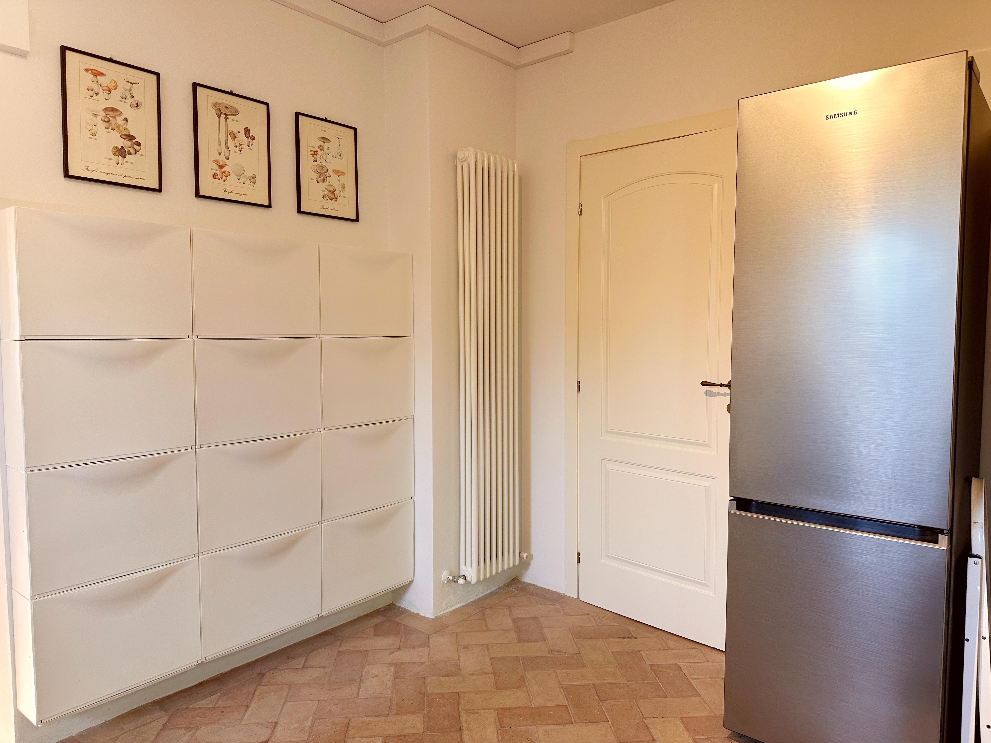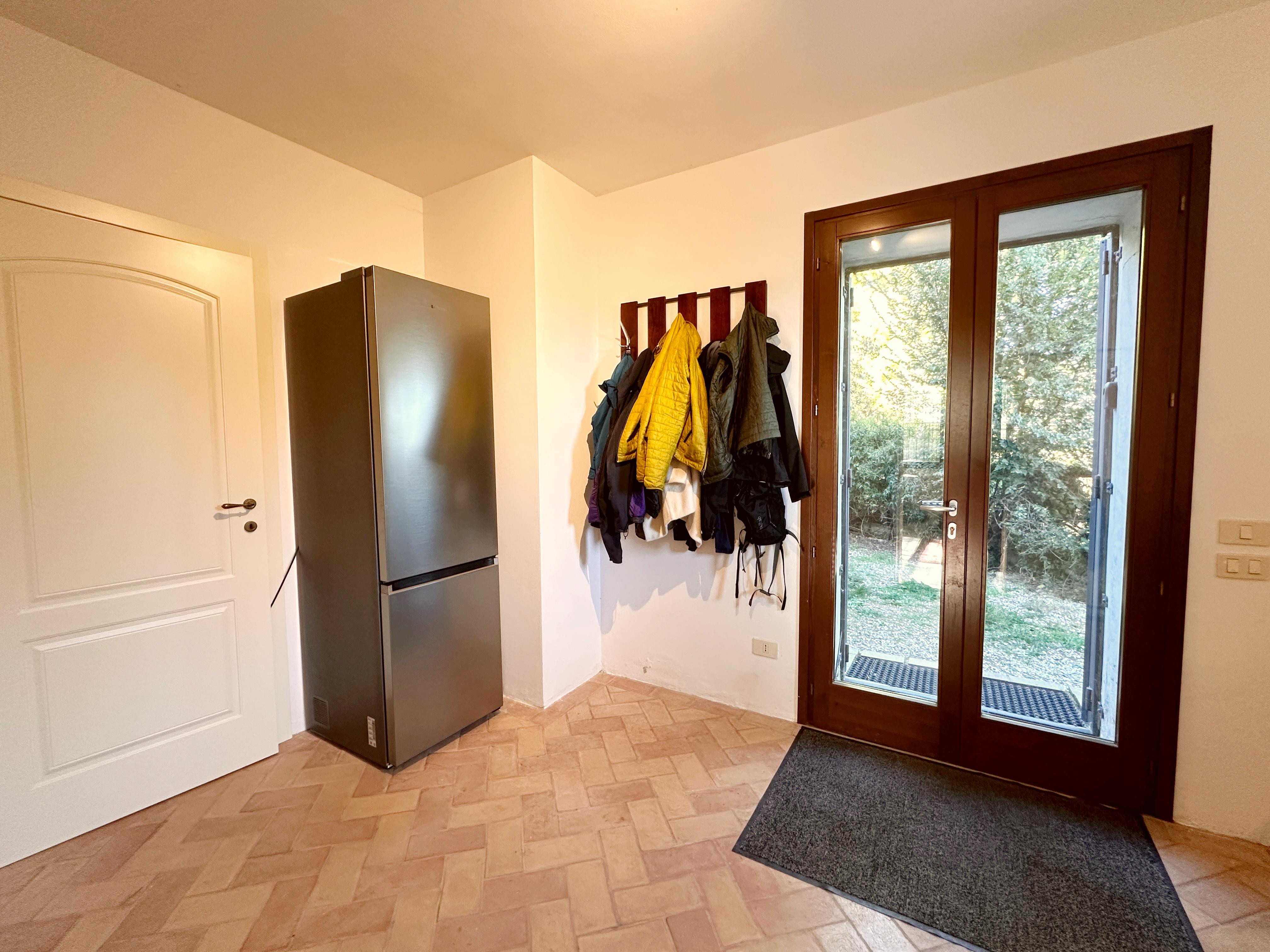Piano terra:ingresso, ampio e luminoso soggiorno con stufa a legna HR incorporata e porte finestre sul giardino, passaggio diretto alla nuova cucina con elettrodomestici incorporati, ampio ripostiglio, WC, ripostiglio e locale tecnico. Una scala interna conduce al piano superiore.