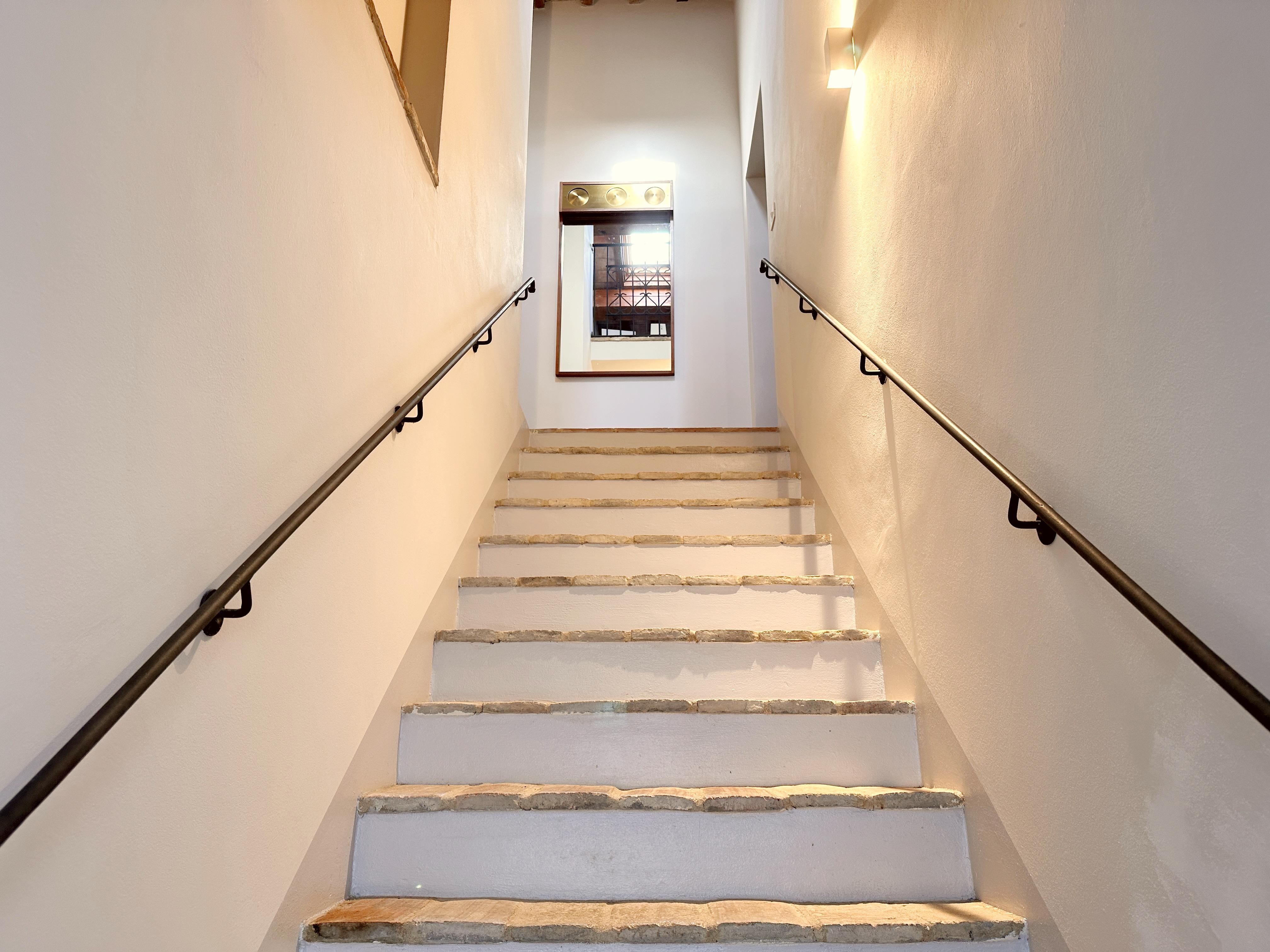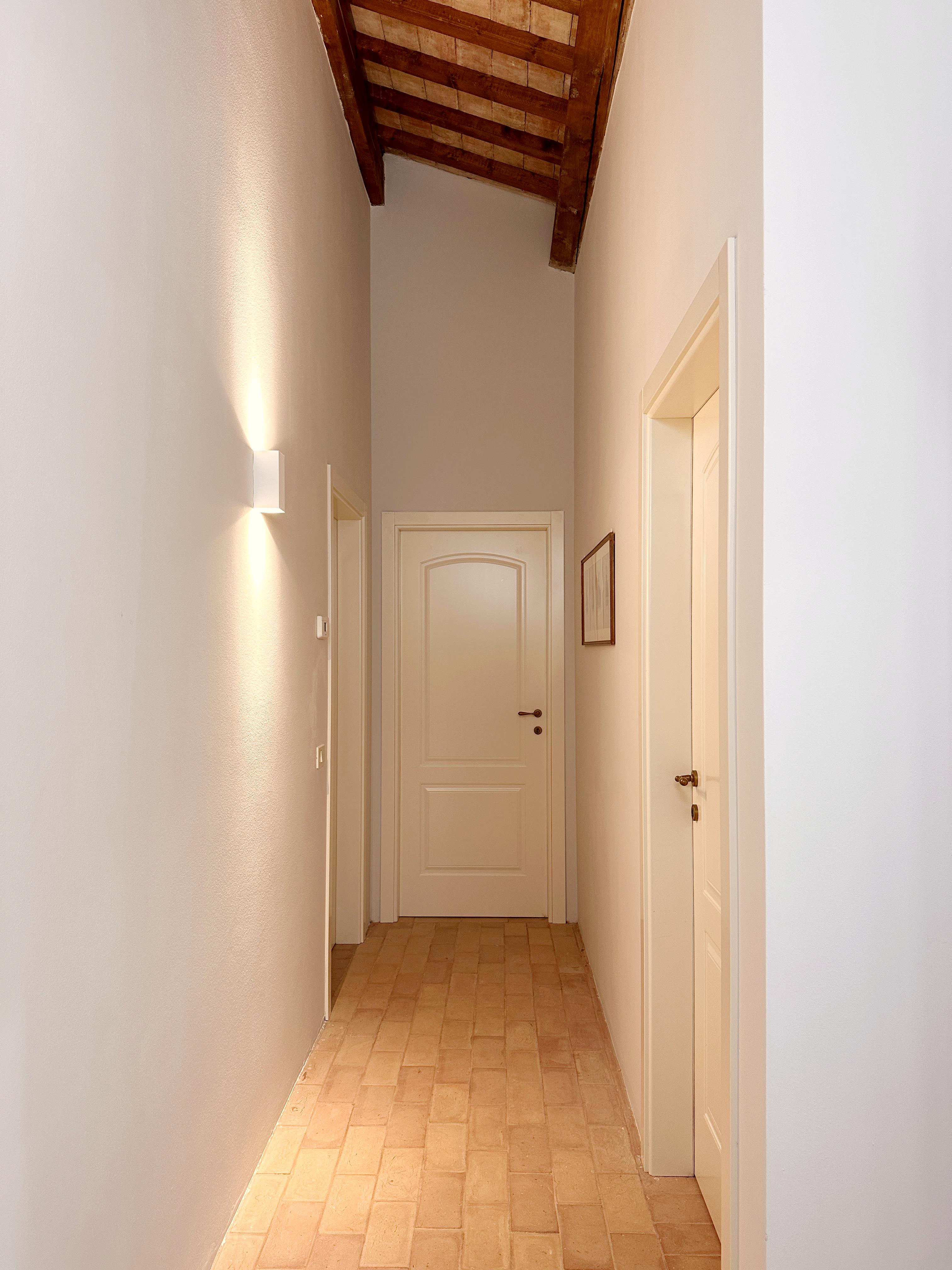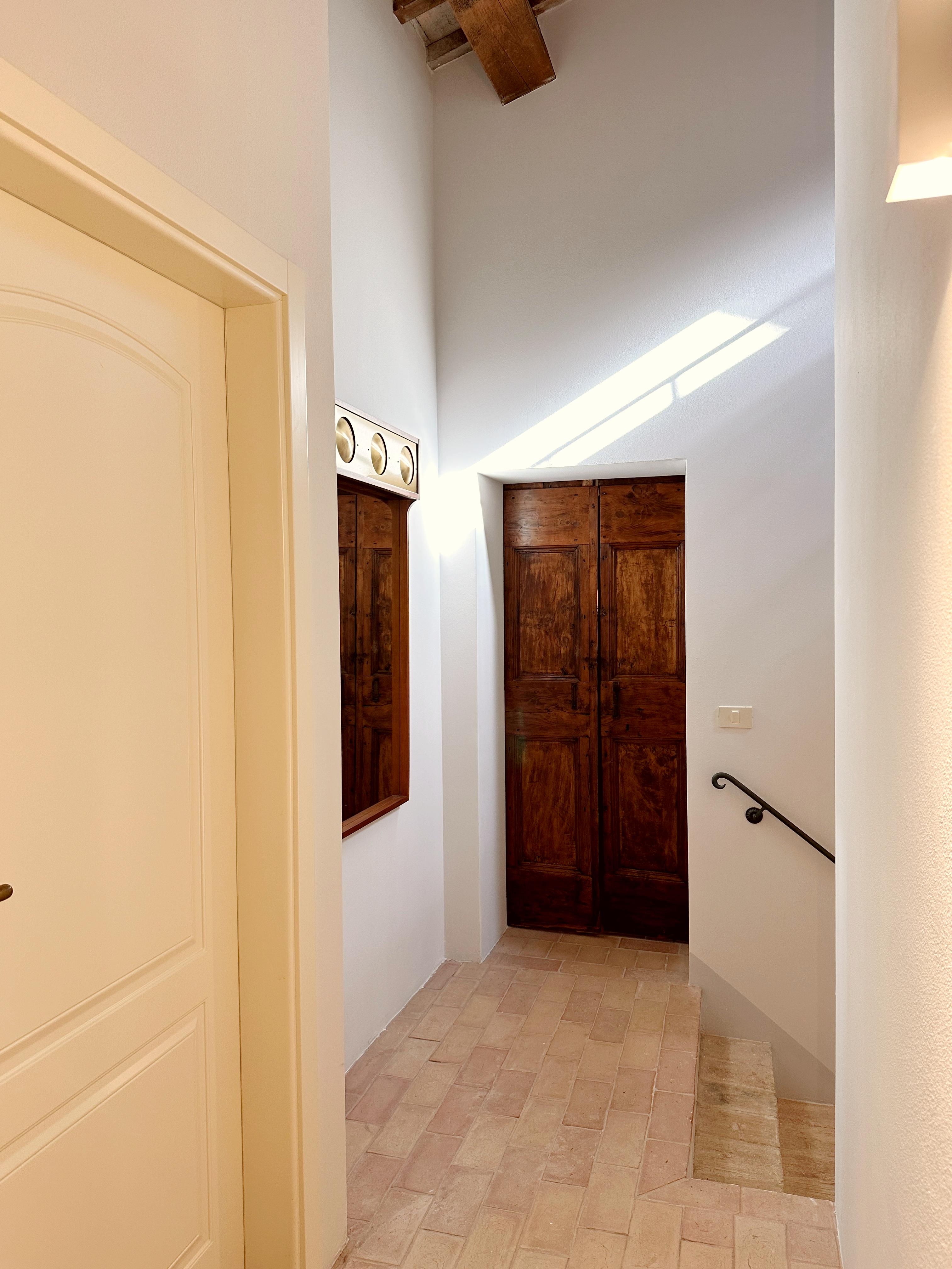 Primo piano:pianerottolo, 4 camere da letto (attualmente 2 sono adibite a studio/lavoro), ognuna con il proprio bagno. Tipici di questo piano sono i soffitti con travi in legno e i pavimenti in cotto.