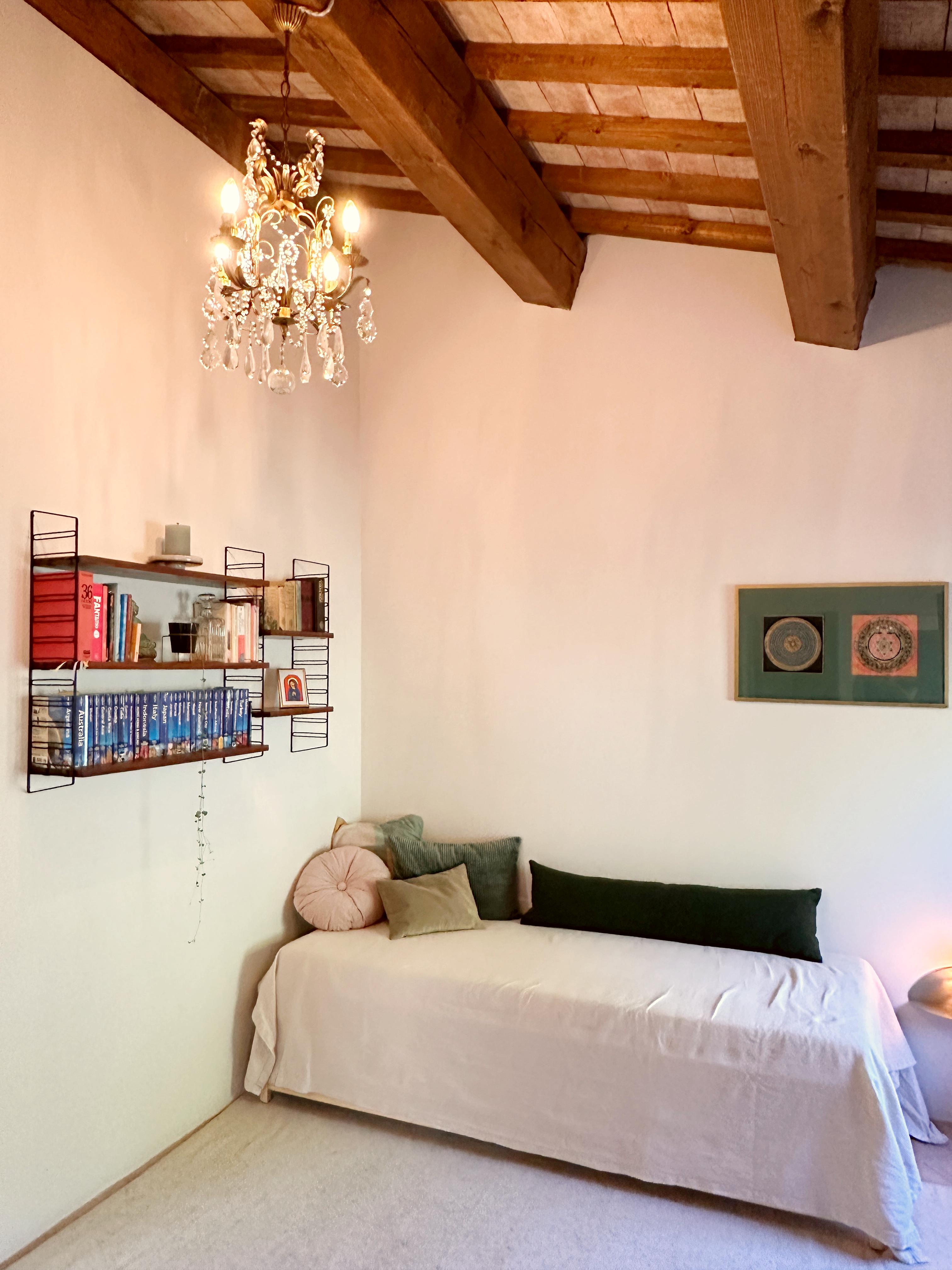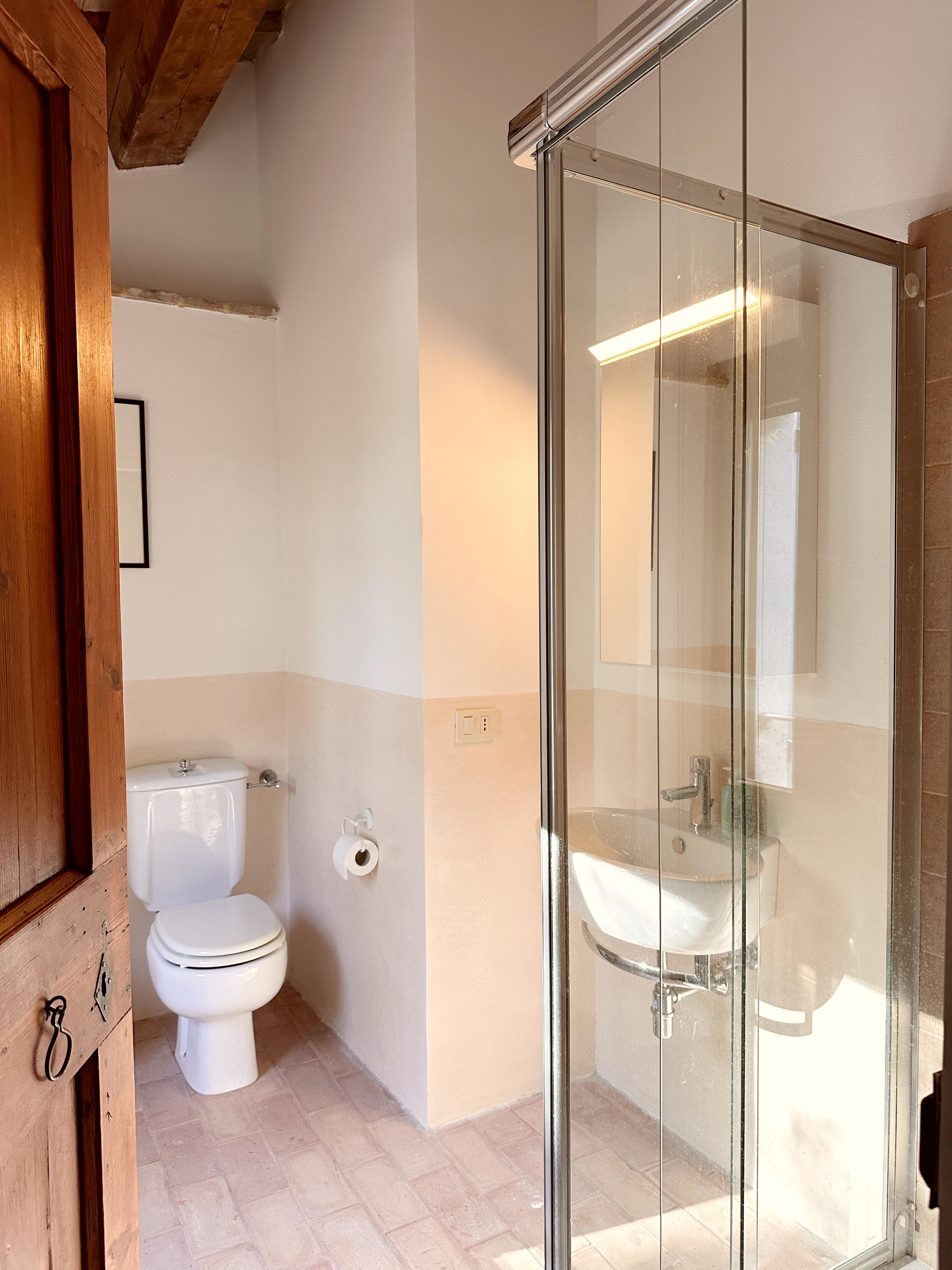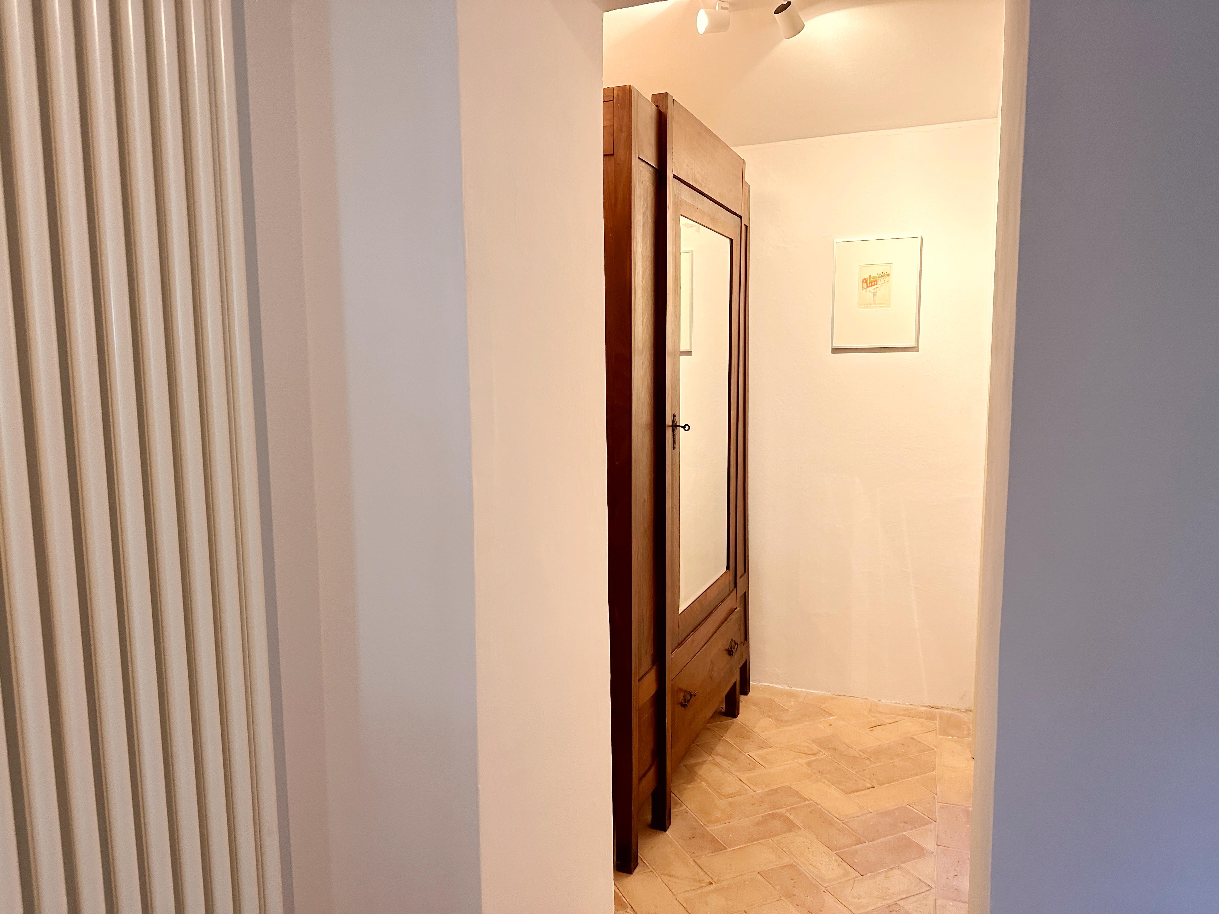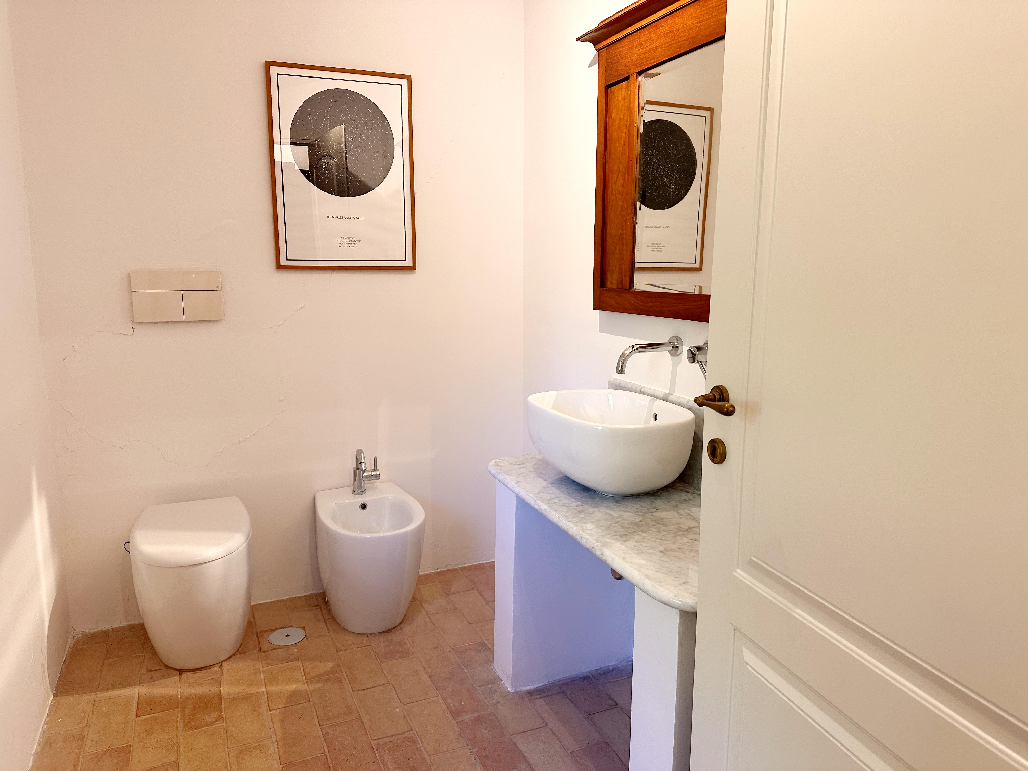 Primo piano:pianerottolo, 4 camere da letto (attualmente 2 sono adibite a studio/lavoro), ognuna con il proprio bagno. Tipici di questo piano sono i soffitti con travi in legno e i pavimenti in cotto.