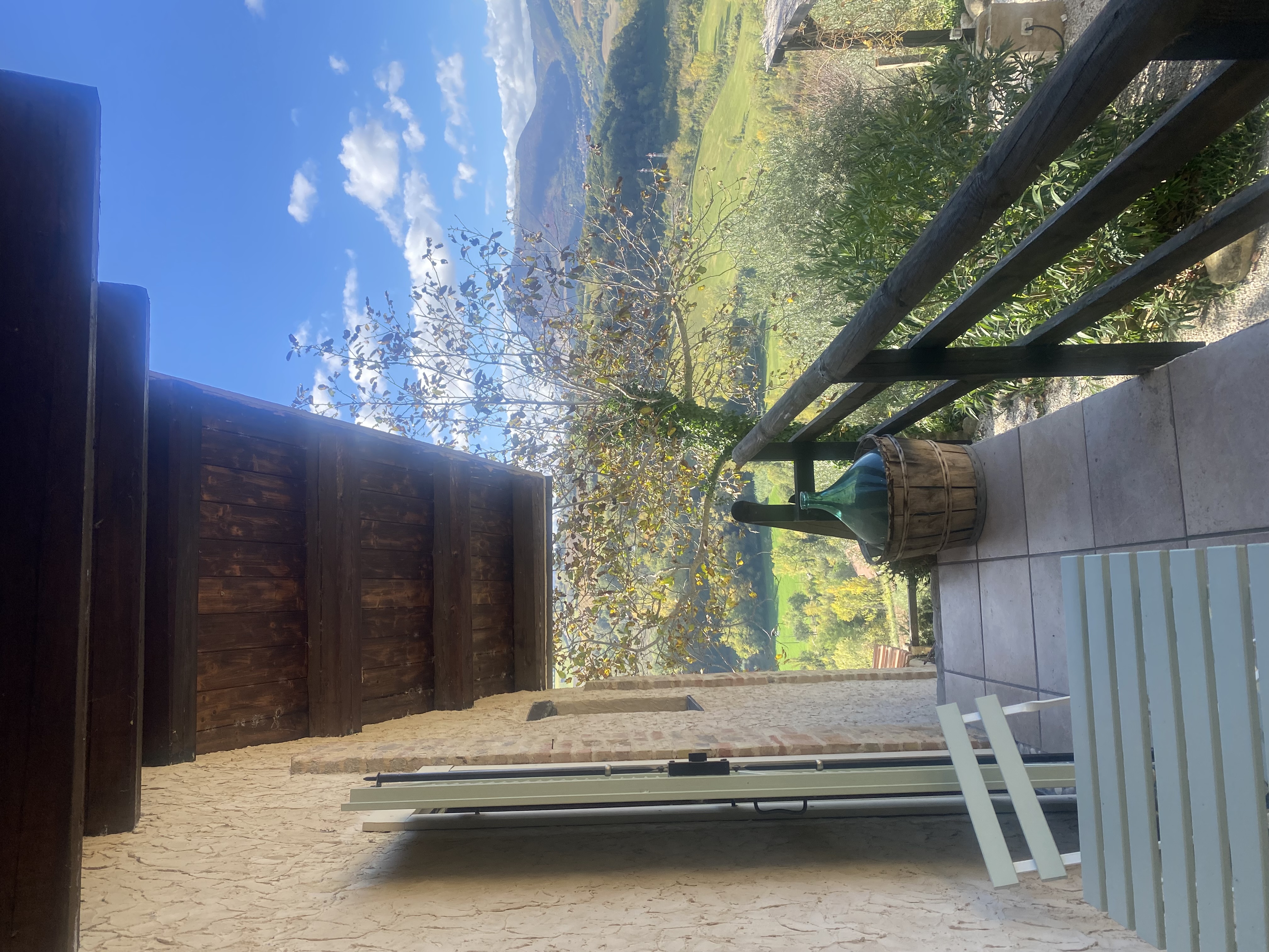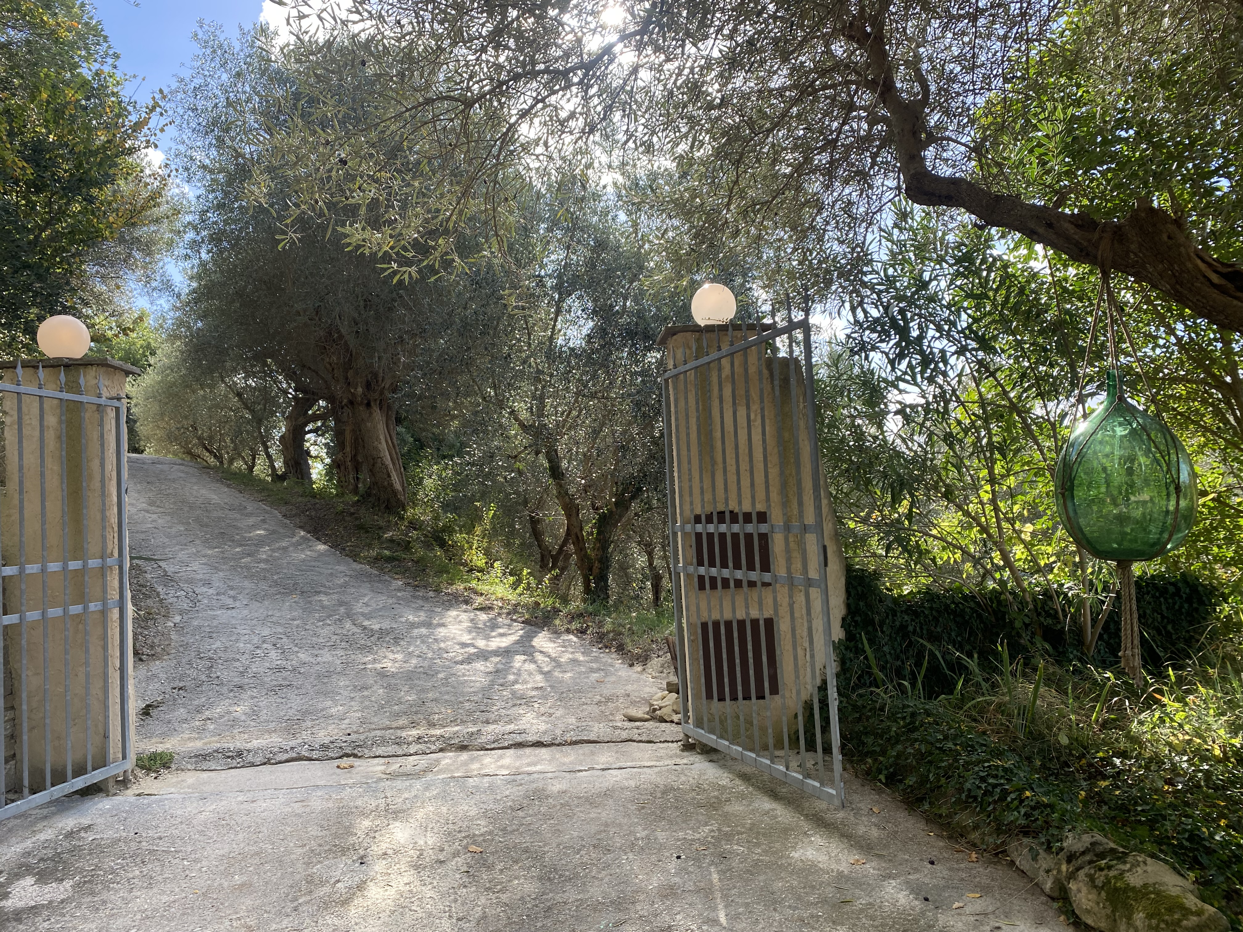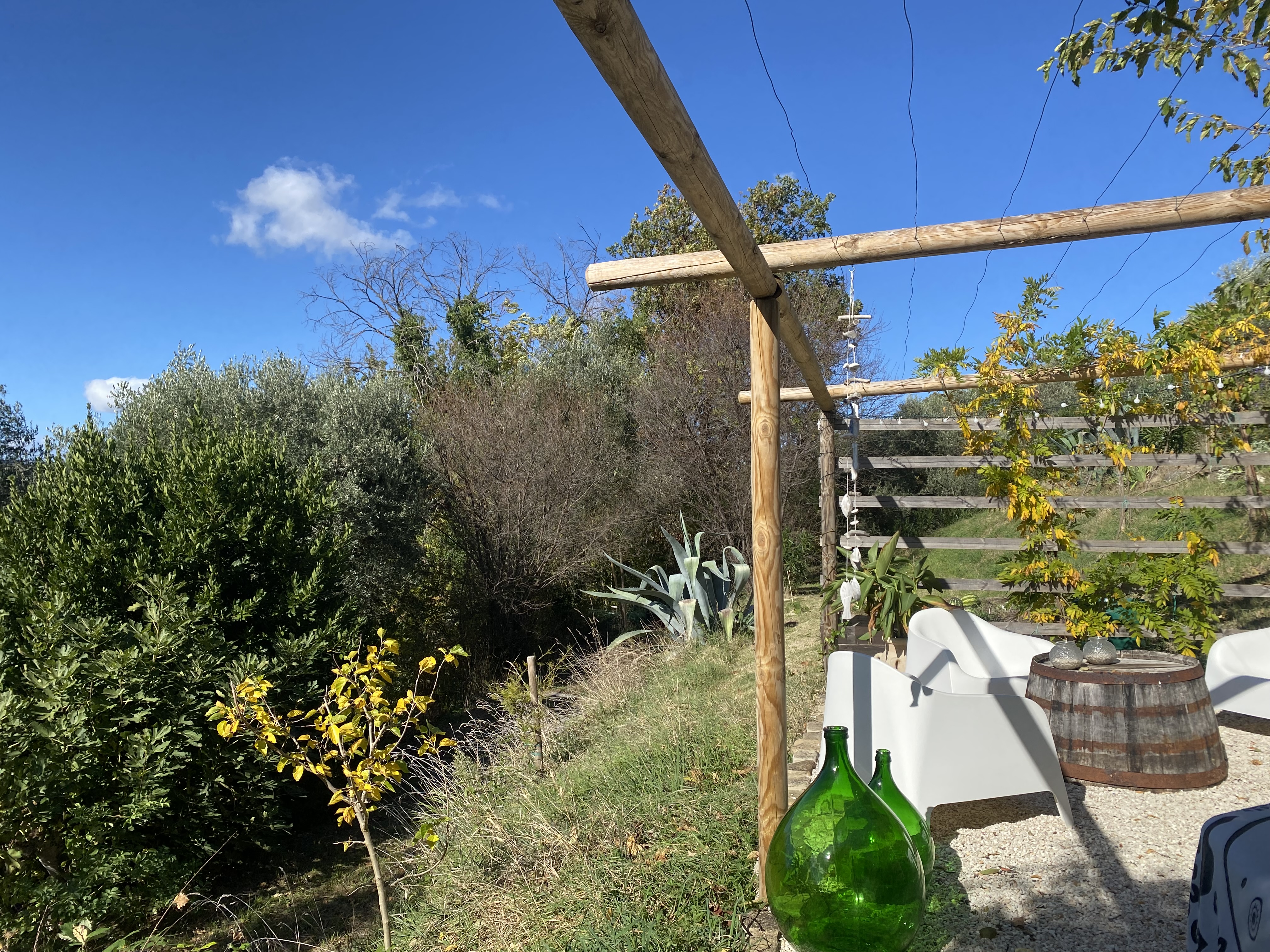 Giardino: Il terreno misura circa 3.000 m², l'attraente giardino su più livelli ha diverse terrazze con zone di sole e ombra, una varietà di fiori e una vegetazione varia, come ulivi, prugne, kiwi, noci, cachi, mandarini e limoni. Piscina ovale (4 x 8 m) con doccia esterna, vasca idromassaggio a legna, capannone/magazzino, lavanderia, piccolo negozio per gli ospiti, attraente cortile con area coperta e lungo tavolo da pranzo .