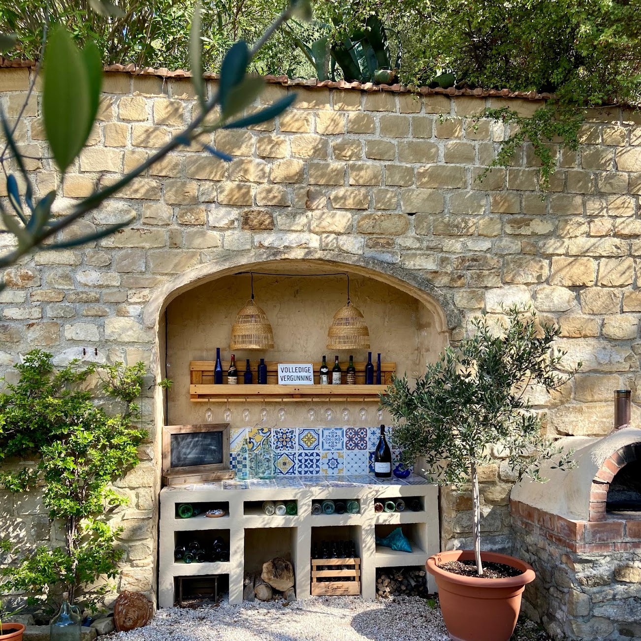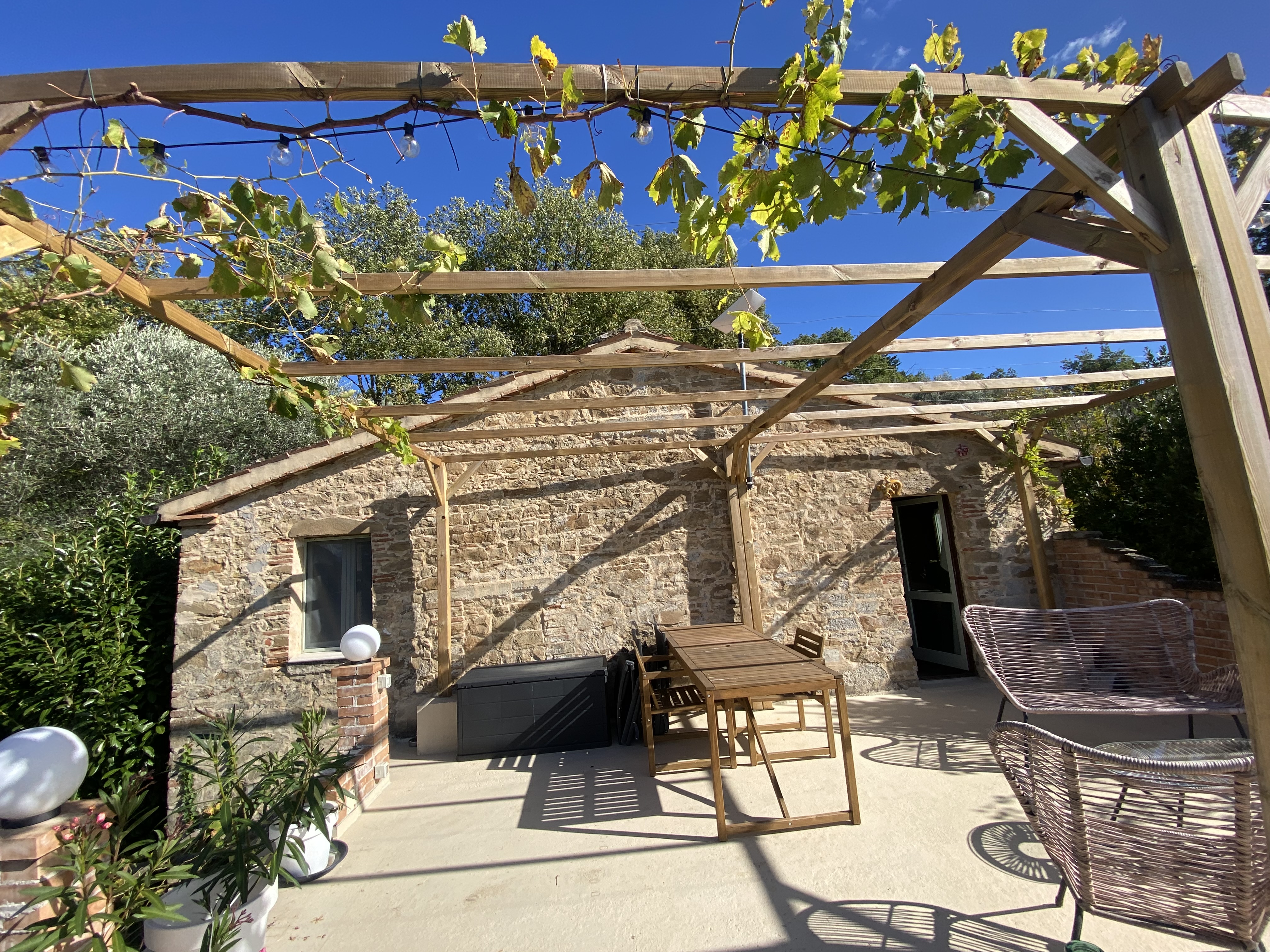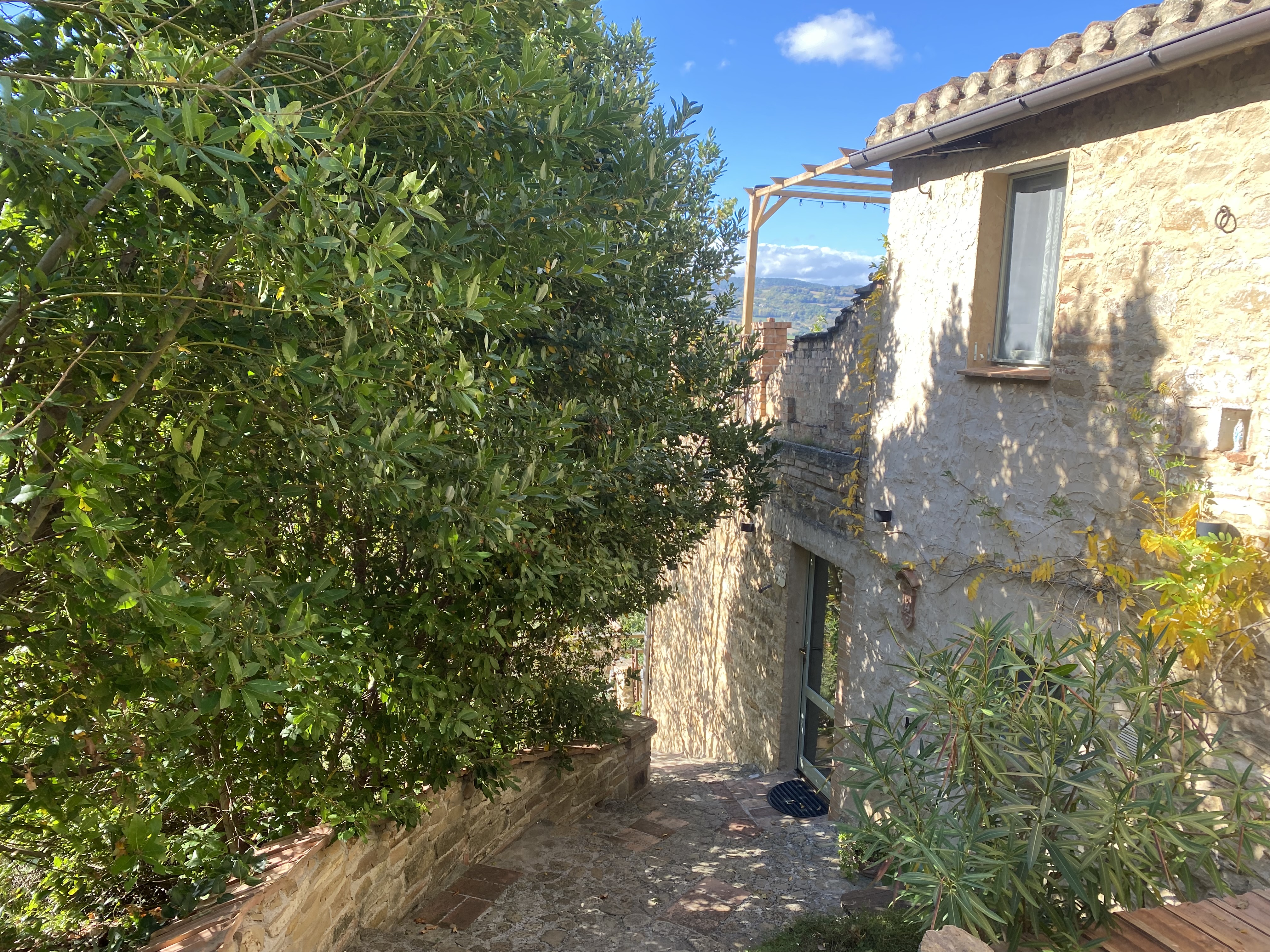 Giardino: Il terreno misura circa 3.000 m², l'attraente giardino su più livelli ha diverse terrazze con zone di sole e ombra, una varietà di fiori e una vegetazione varia, come ulivi, prugne, kiwi, noci, cachi, mandarini e limoni. Piscina ovale (4 x 8 m) con doccia esterna, vasca idromassaggio a legna, capannone/magazzino, lavanderia, piccolo negozio per gli ospiti, attraente cortile con area coperta e lungo tavolo da pranzo .