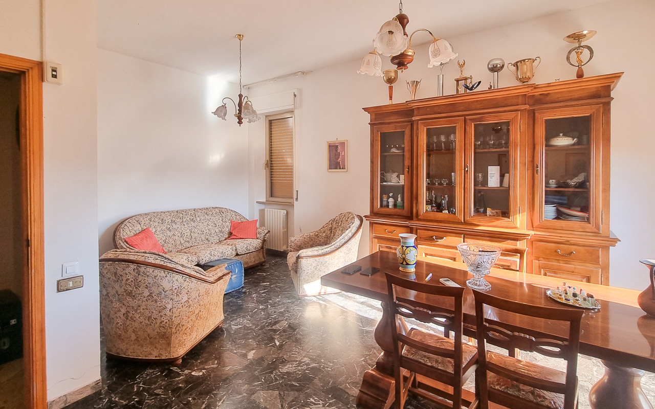 La zona giorno principale si trova al primo piano (circa 120 m²) e comprende cucina, soggiorno, tre camere da letto, un bagno e due balconi. Gli ambienti sono ben proporzionati e luminosi. La zona giorno principale è dotata di aria condizionata.