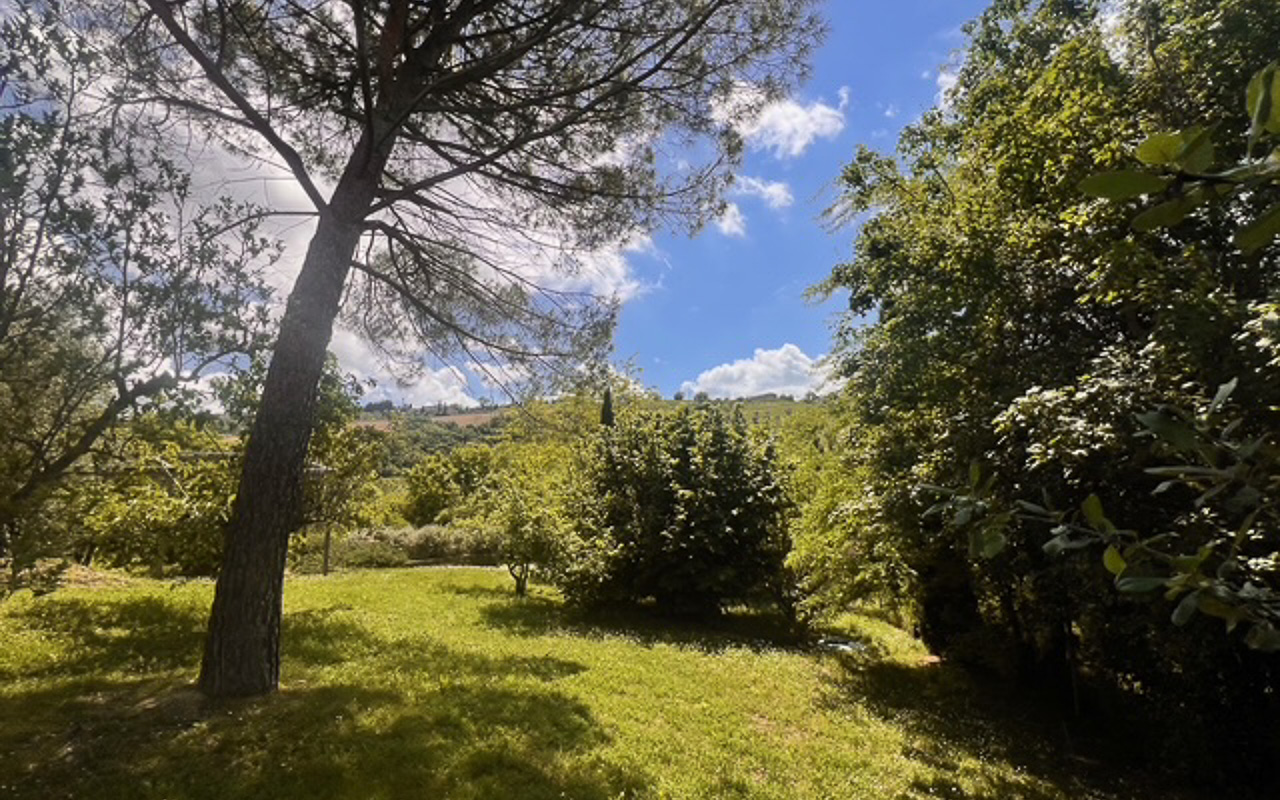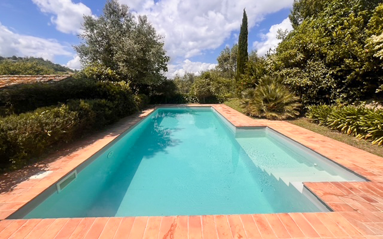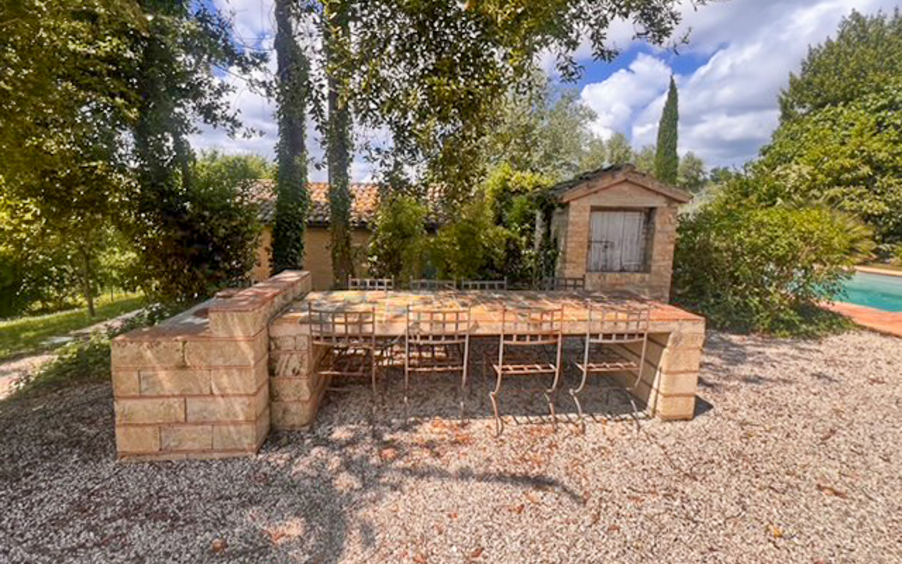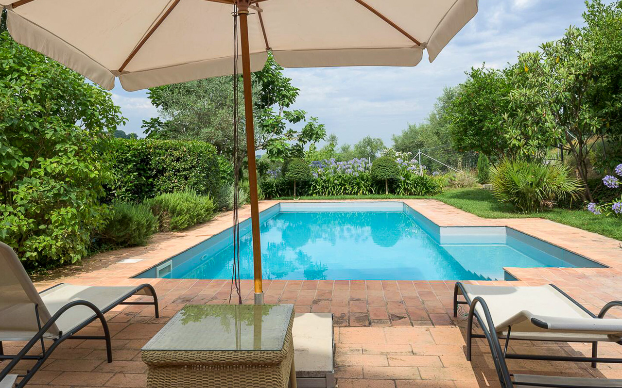 Il giardino è stato progettato con cura e presenta diverse aree dedicate al relax, permettendo di godere appieno della tranquillità e del contesto naturale circostante. La piscina è posizionata in modo strategico per valorizzare al massimo il panorama e dispone di spazi per pranzi all’aperto e barbecue.