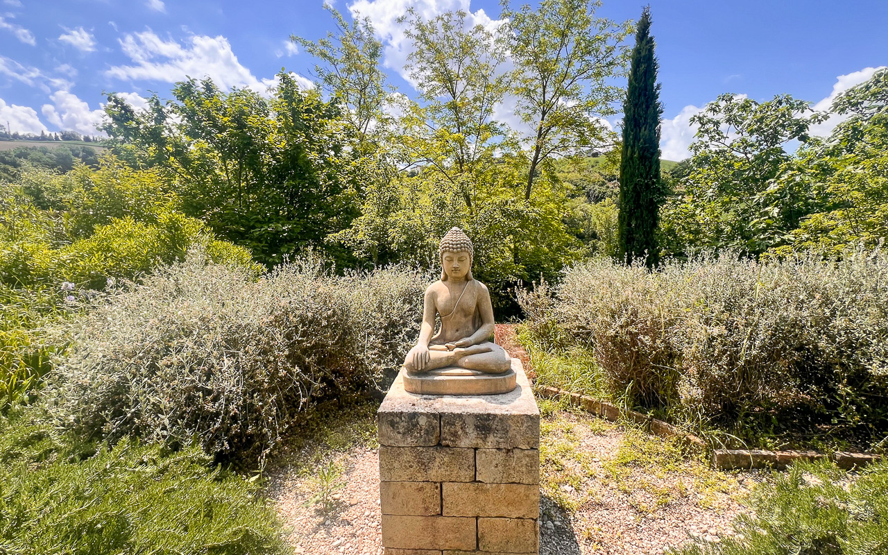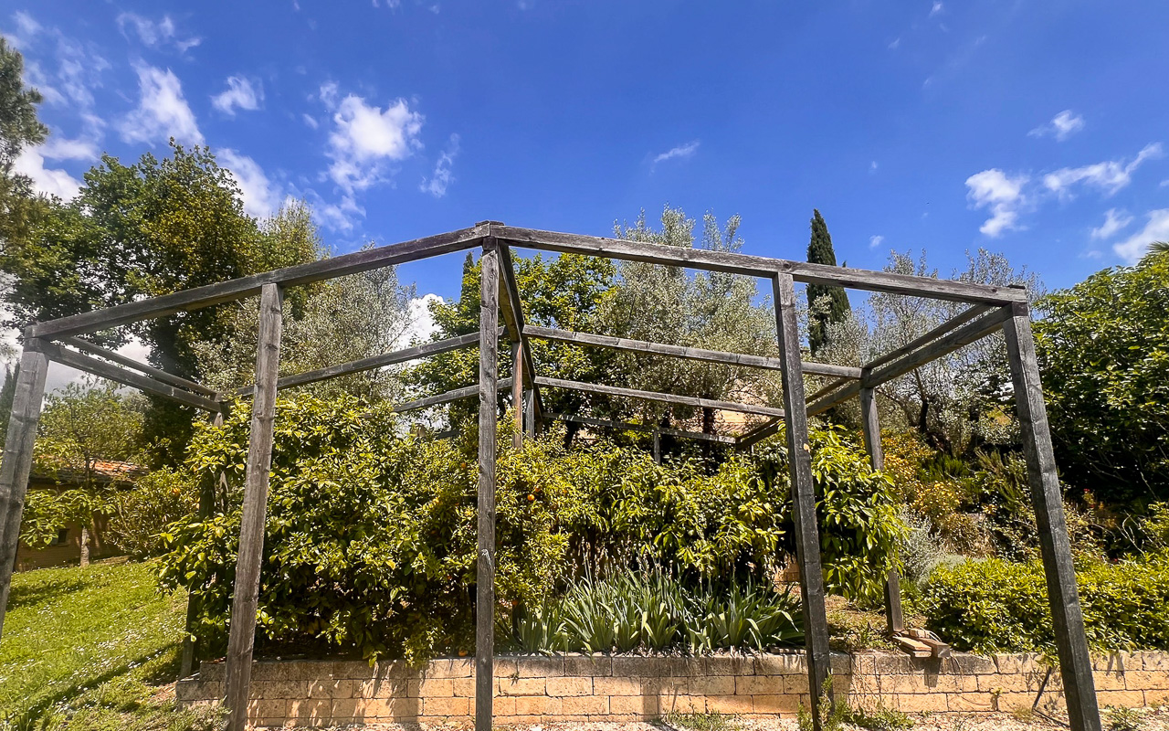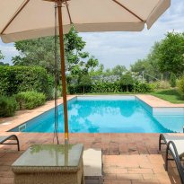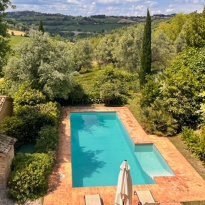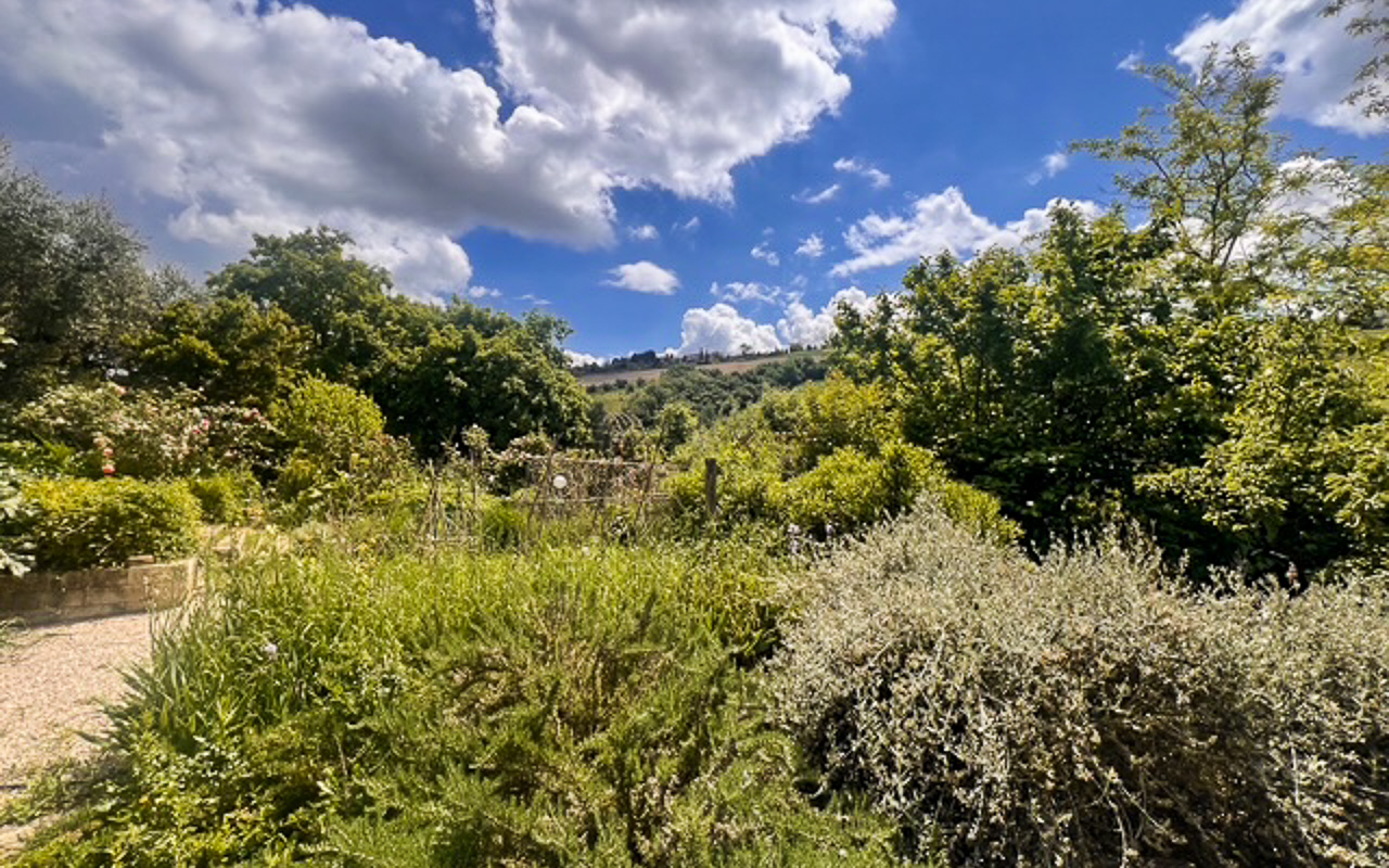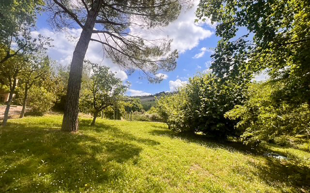 Il giardino è stato progettato con cura e presenta diverse aree dedicate al relax, permettendo di godere appieno della tranquillità e del contesto naturale circostante. La piscina è posizionata in modo strategico per valorizzare al massimo il panorama e dispone di spazi per pranzi all’aperto e barbecue.