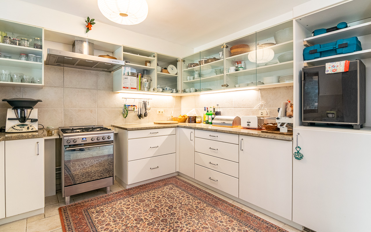 Al piano terra si trovano un soggiorno molto luminoso e una cucina, che insieme creano uno spazio abitativo accogliente e funzionale. Gli interni sono rifiniti con piastrelle color crema posate con disegno romanico in tutta la casa, conferendo un’atmosfera armoniosa ed elegante.