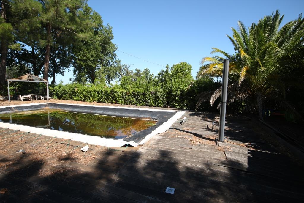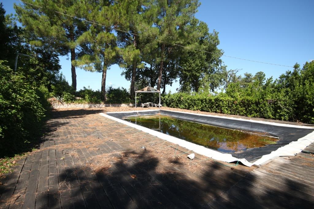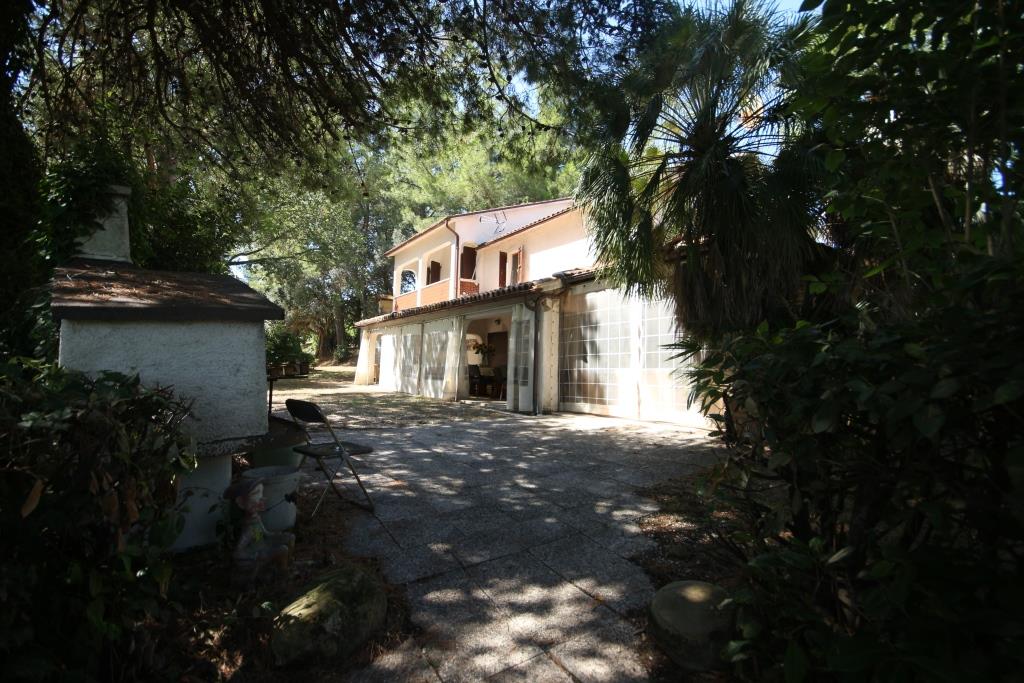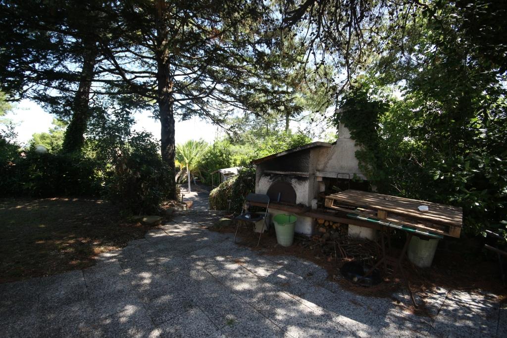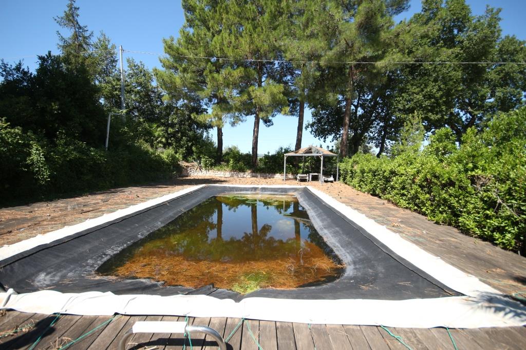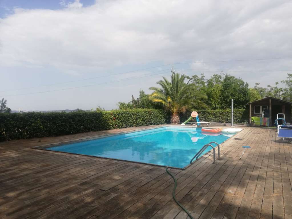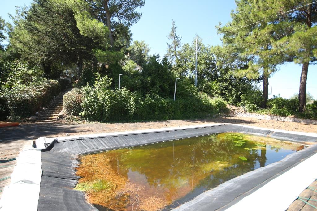 Davanti alla casa c'è un'area barbecue accanto a una scala in tufo che conduce alla piscina inferiore; intorno alla piscina c'è una terrazza solarium con decking in legno che deve essere rinnovato o completamente rinnovato, e fuori dalla terrazza solarium c'è il locale tecnico (9 m²). C'è anche un capanno di 17 m² per riporre gli attrezzi da giardino.