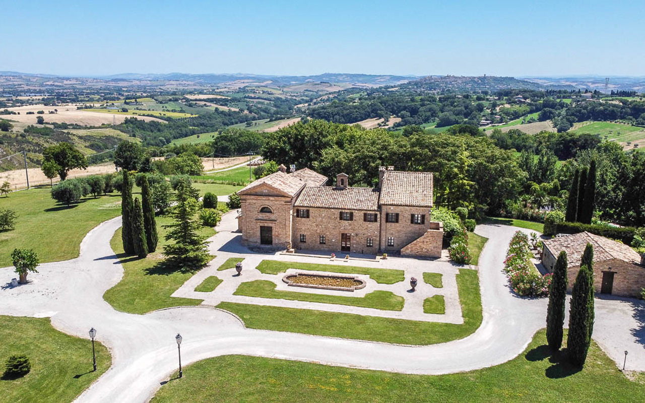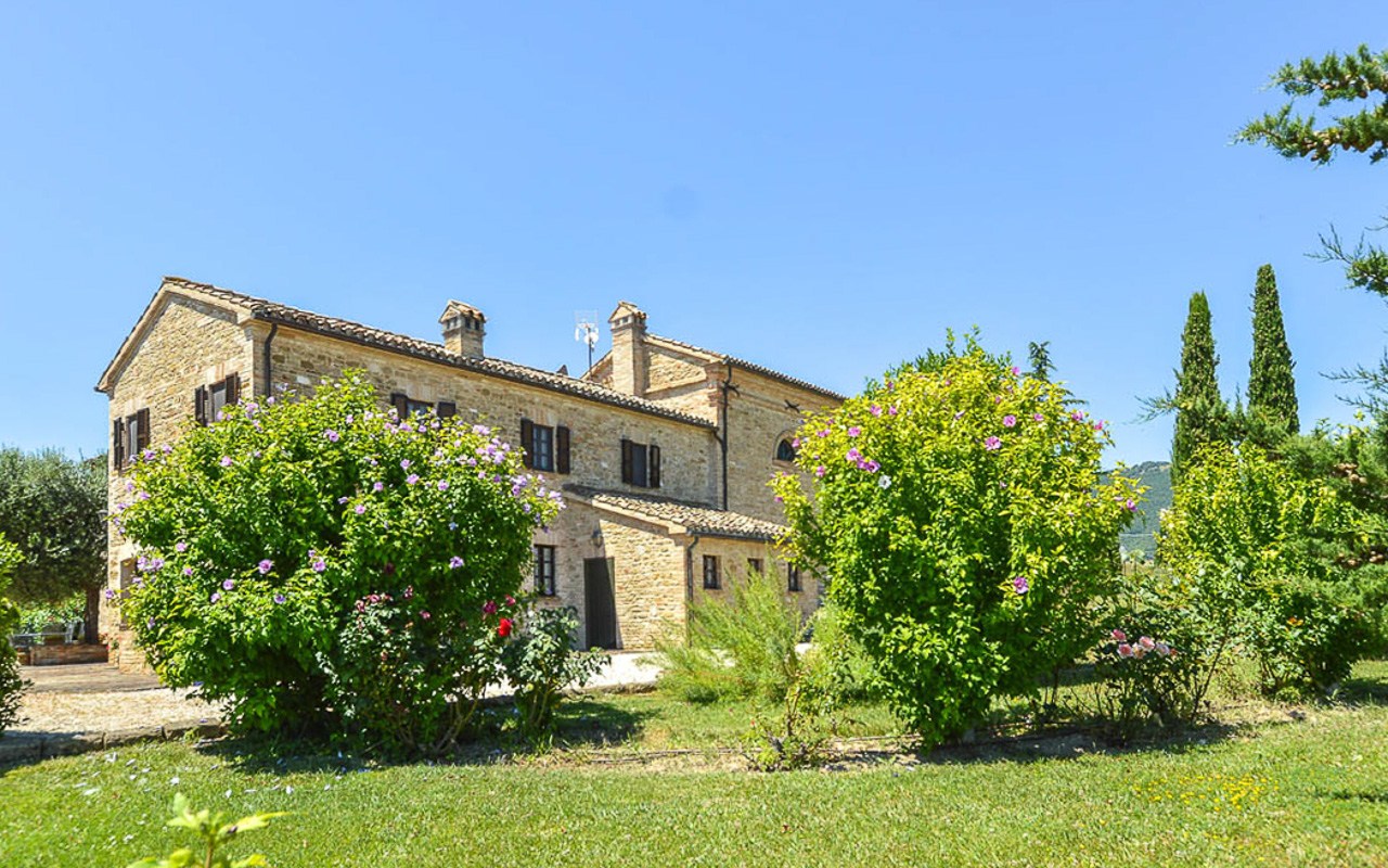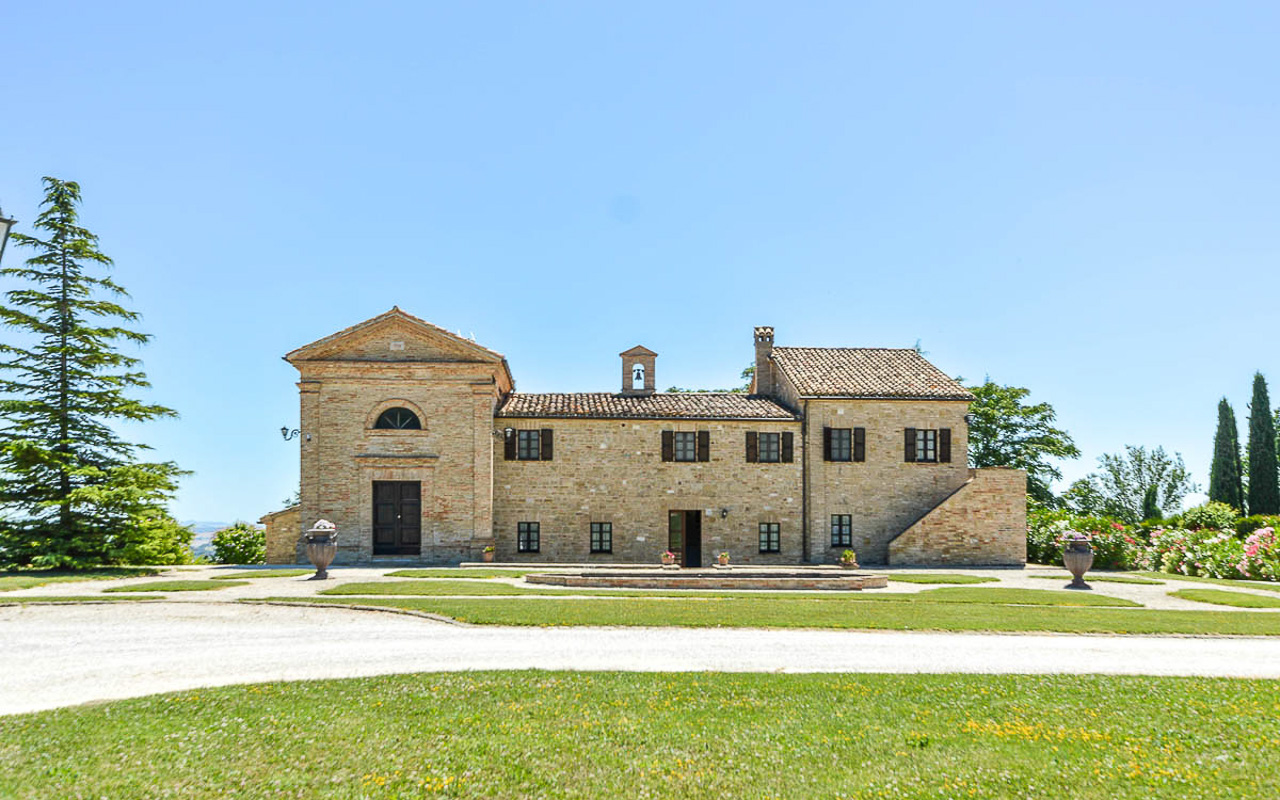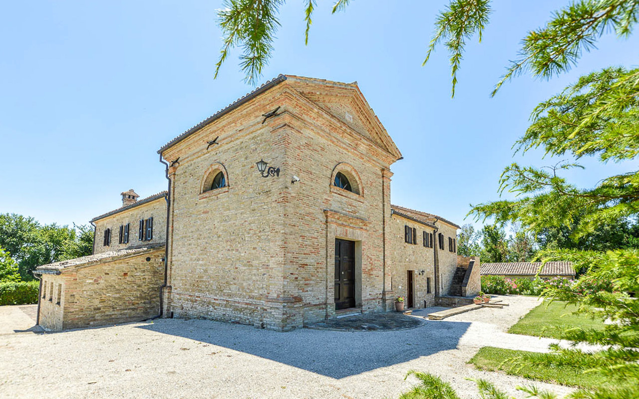 Villa Quintessa is a classic stone villa for sale with annex guest-house, large garden, swimming pool and agricultural land in Le Marche. Just a few minutes walk from the historic center of Sant’Angelo in Pontano in the province of Macerata, nestled in one of the most beautiful areas of the Marche Region between the sea and the mountains, a splendid property consisting of a large villa with annex, lush garden with swimming pool and appurtenant agricultural land of over 36,000 square meters.