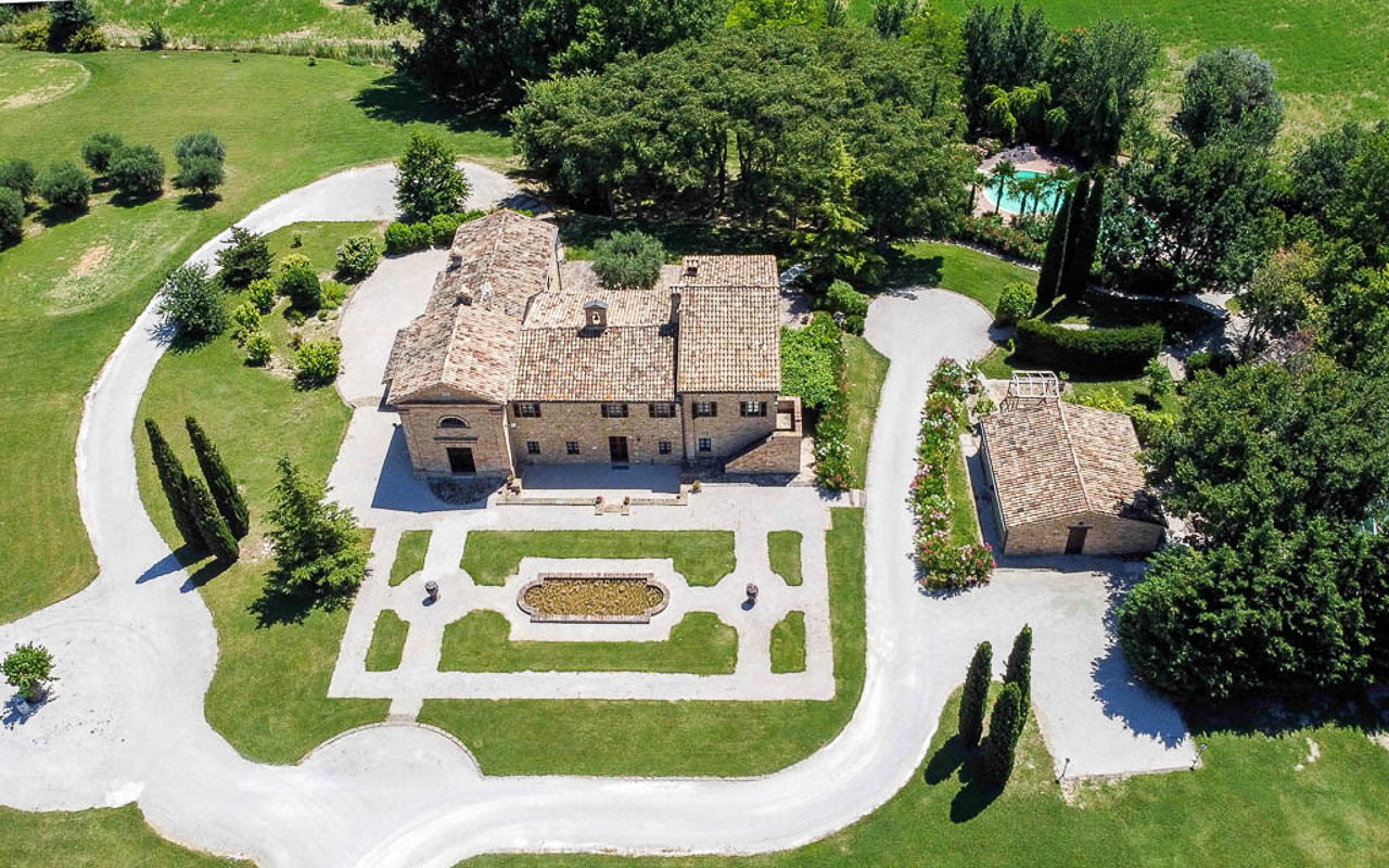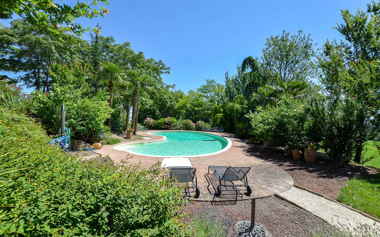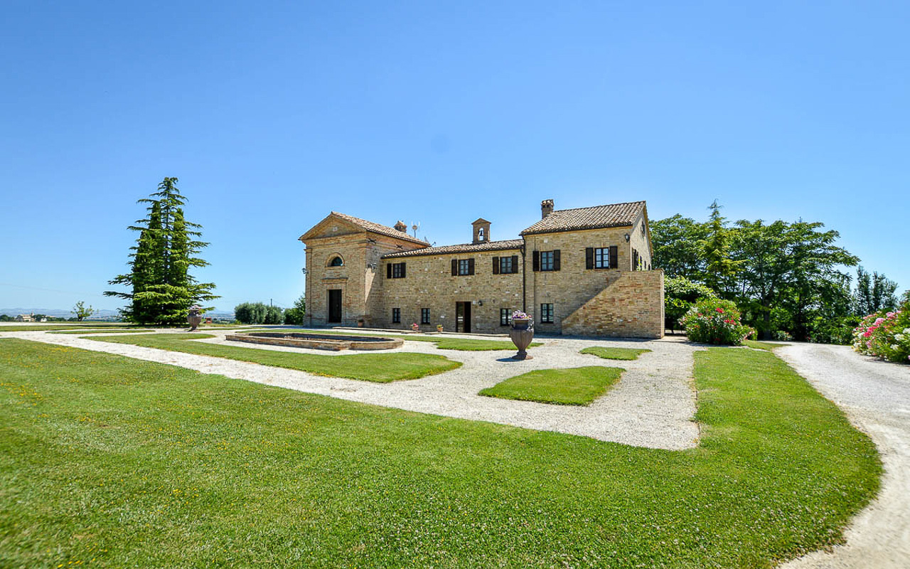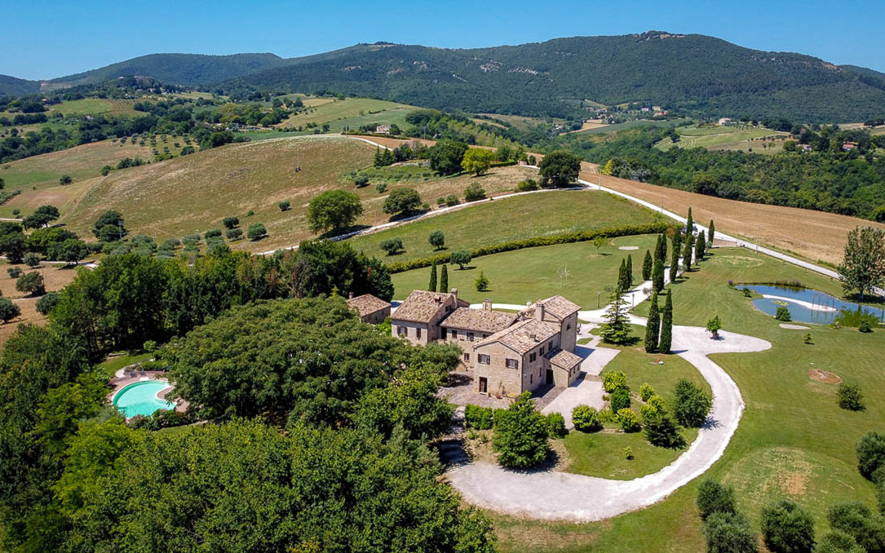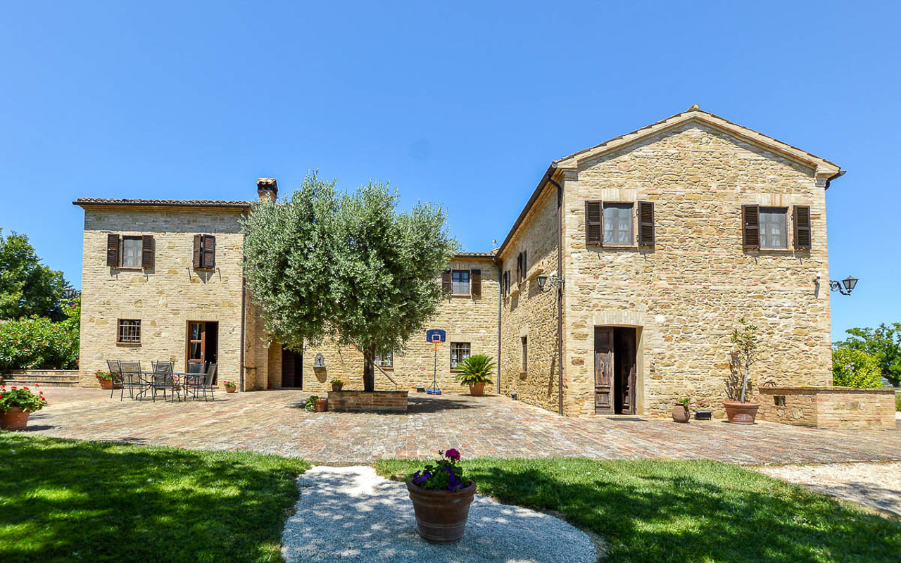 Villa Quintessa is a classic stone villa for sale with annex guest-house, large garden, swimming pool and agricultural land in Le Marche. Just a few minutes walk from the historic center of Sant’Angelo in Pontano in the province of Macerata, nestled in one of the most beautiful areas of the Marche Region between the sea and the mountains, a splendid property consisting of a large villa with annex, lush garden with swimming pool and appurtenant agricultural land of over 36,000 square meters.