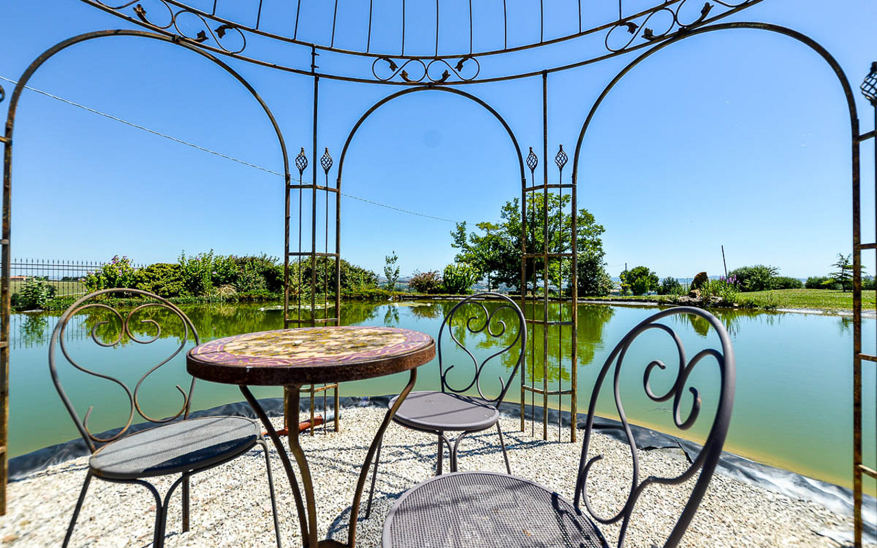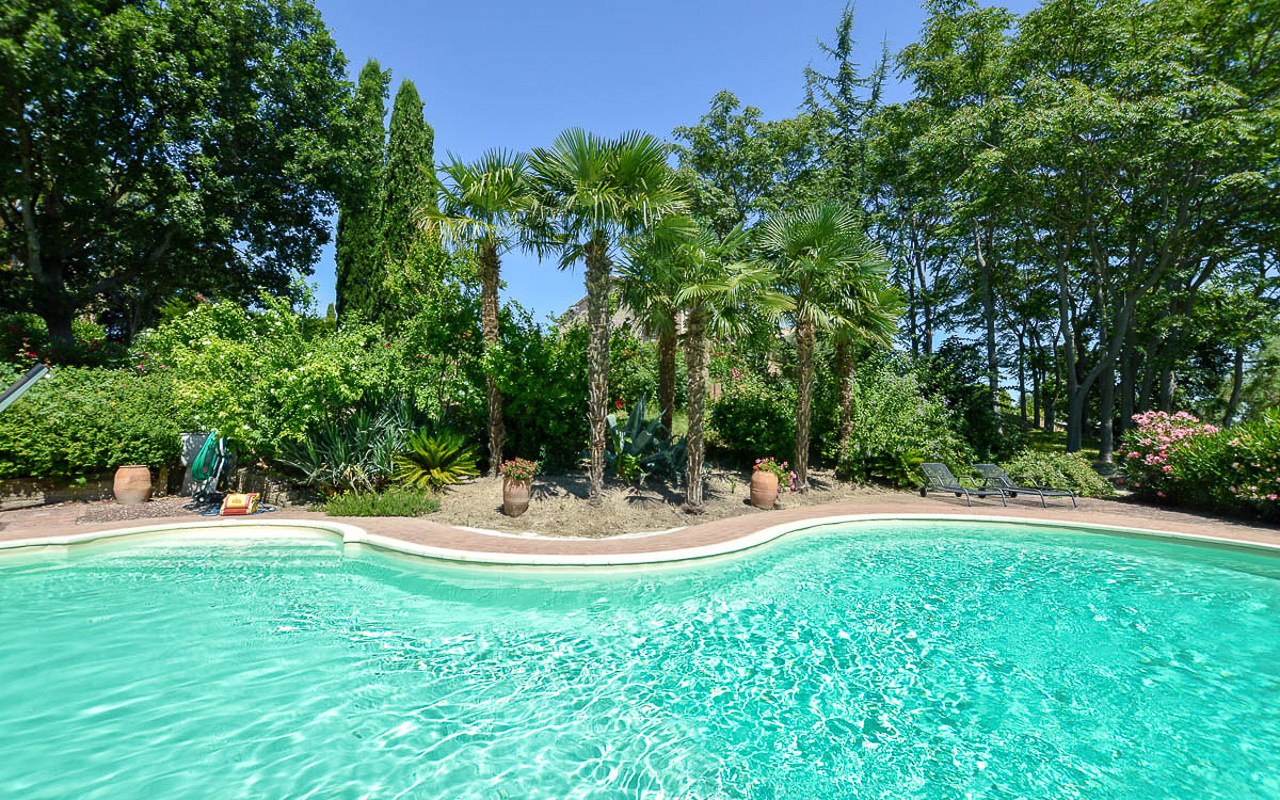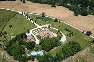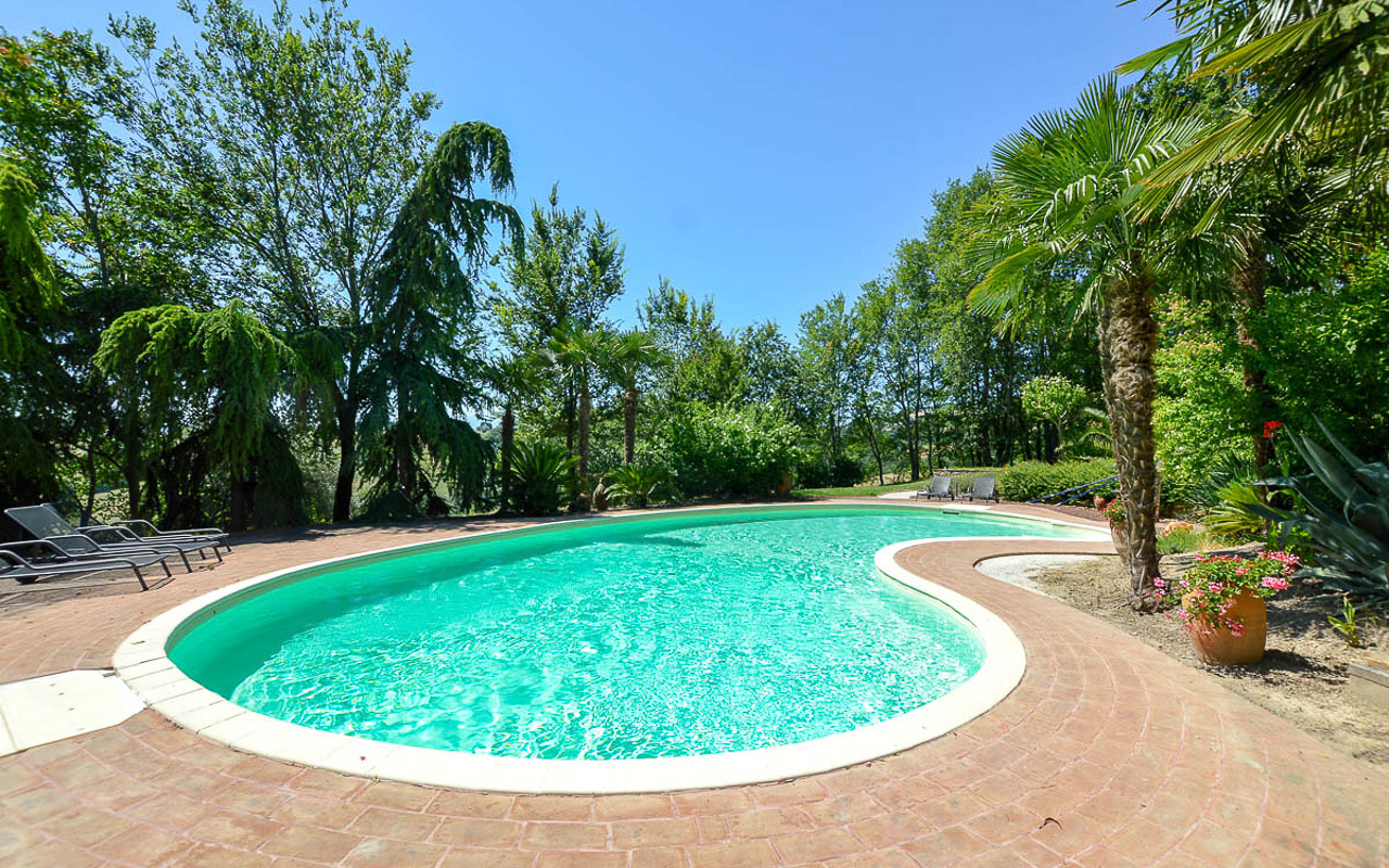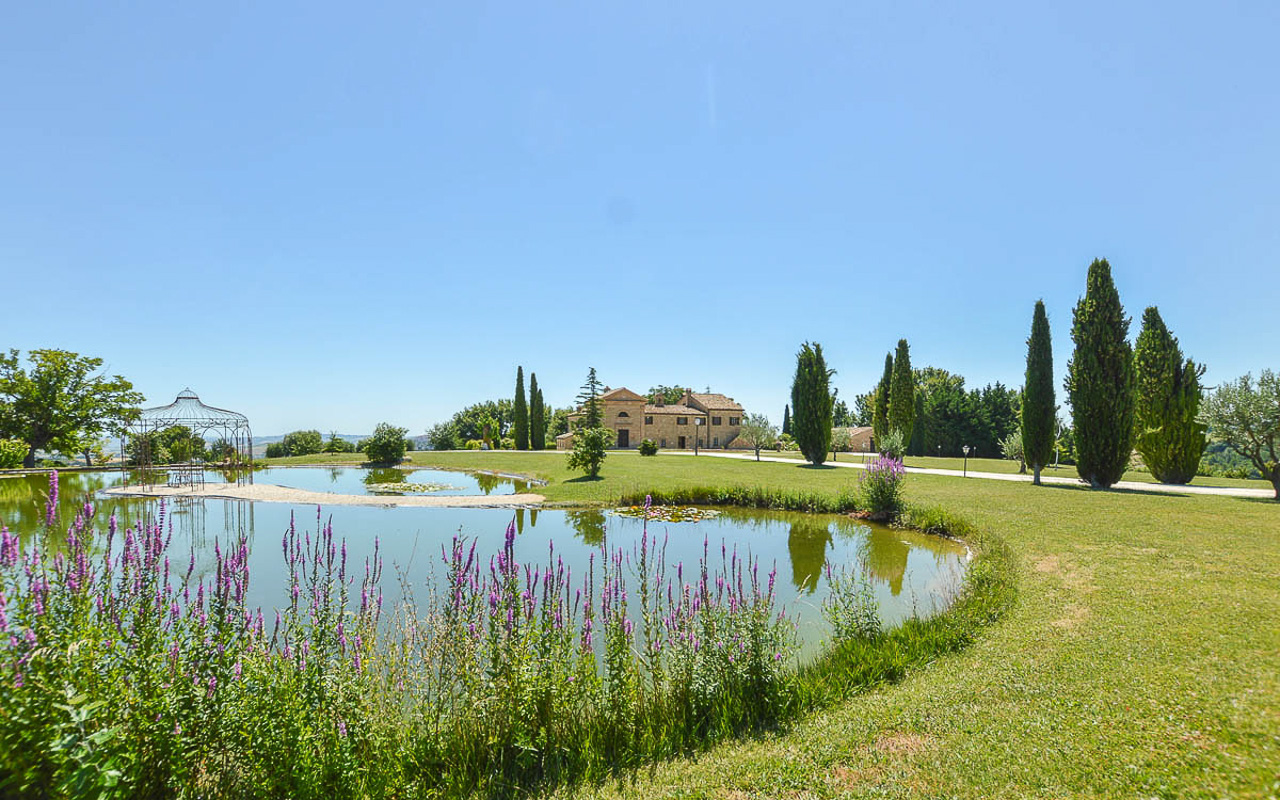 Villa Quintessa is a classic stone villa for sale with annex guest-house, large garden, swimming pool and agricultural land in Le Marche. Just a few minutes walk from the historic center of Sant’Angelo in Pontano in the province of Macerata, nestled in one of the most beautiful areas of the Marche Region between the sea and the mountains, a splendid property consisting of a large villa with annex, lush garden with swimming pool and appurtenant agricultural land of over 36,000 square meters.