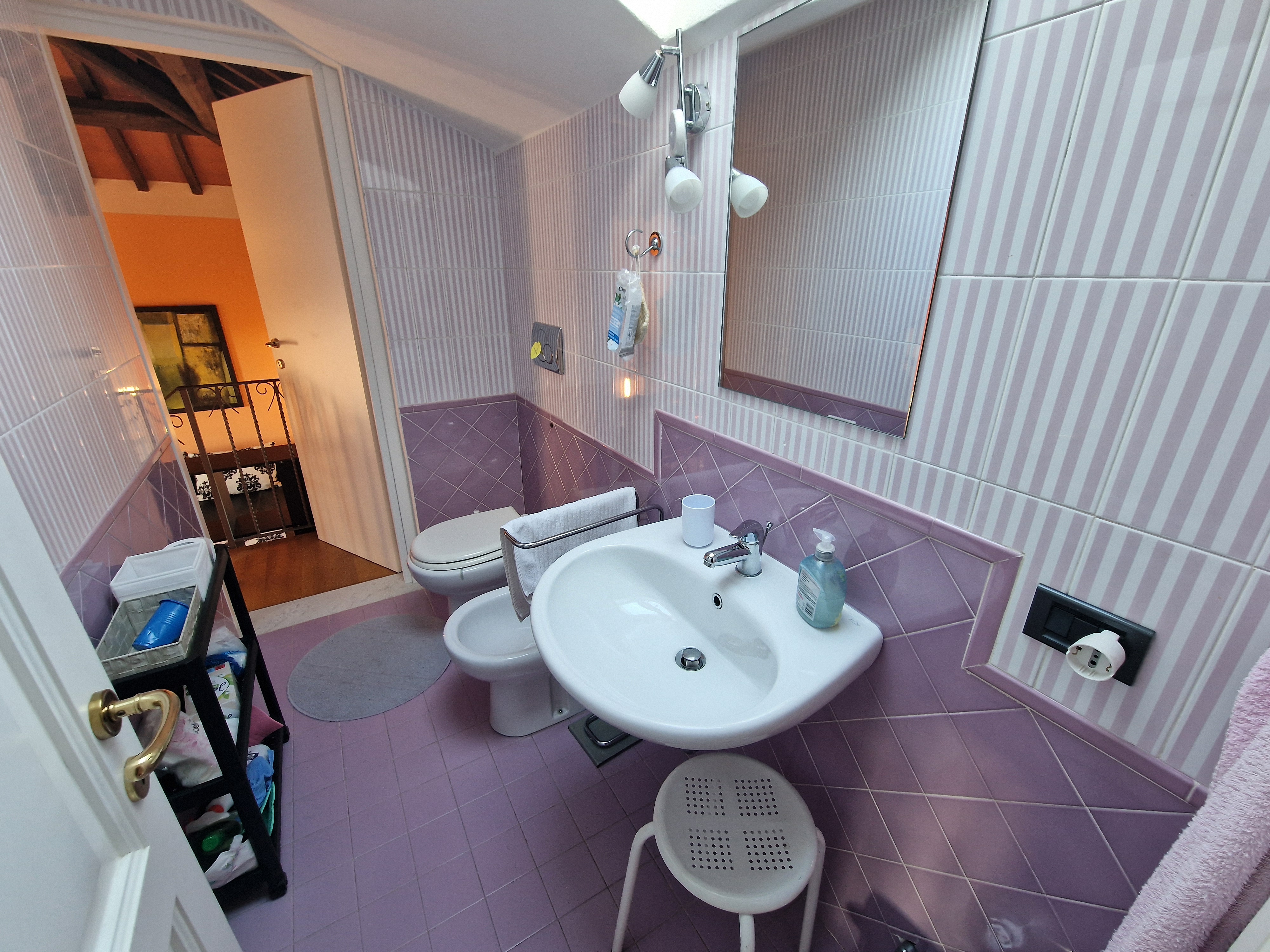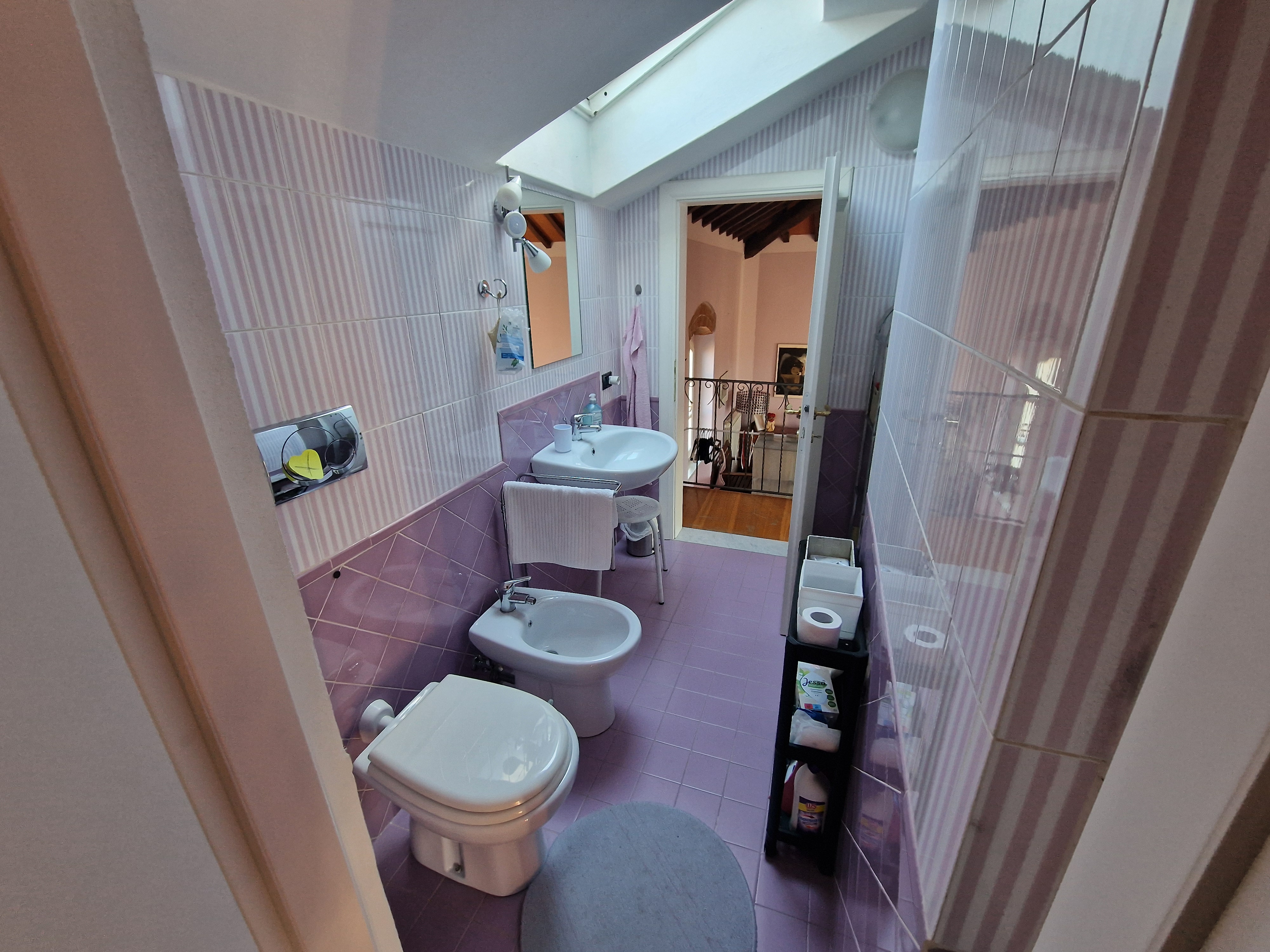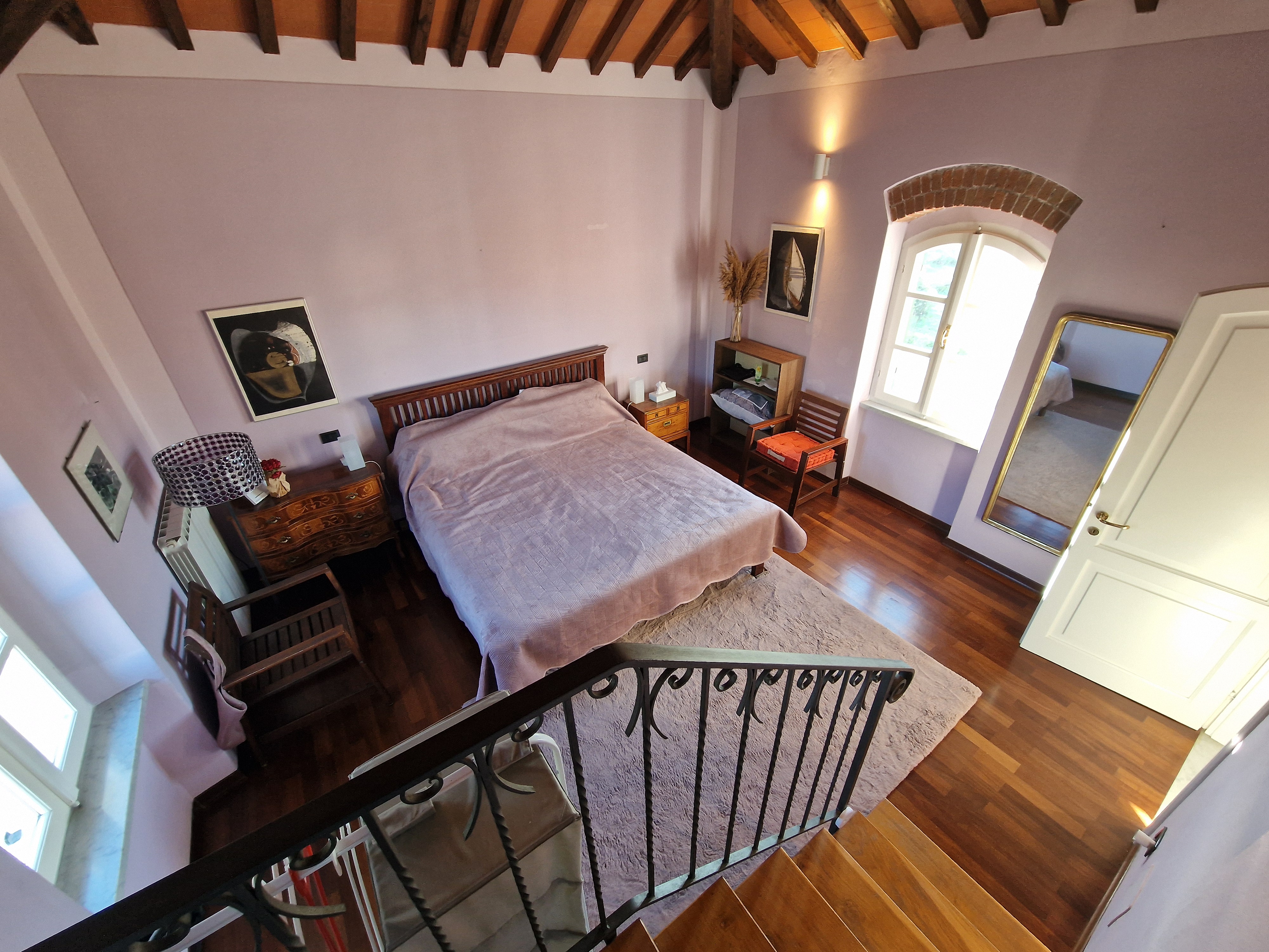 Al secondo piano si trovano altre due camere da letto, ognuna con bagno privato con doccia, raggiungibili attraverso una suggestiva scala interna progettata per garantire comfort e indipendenza.