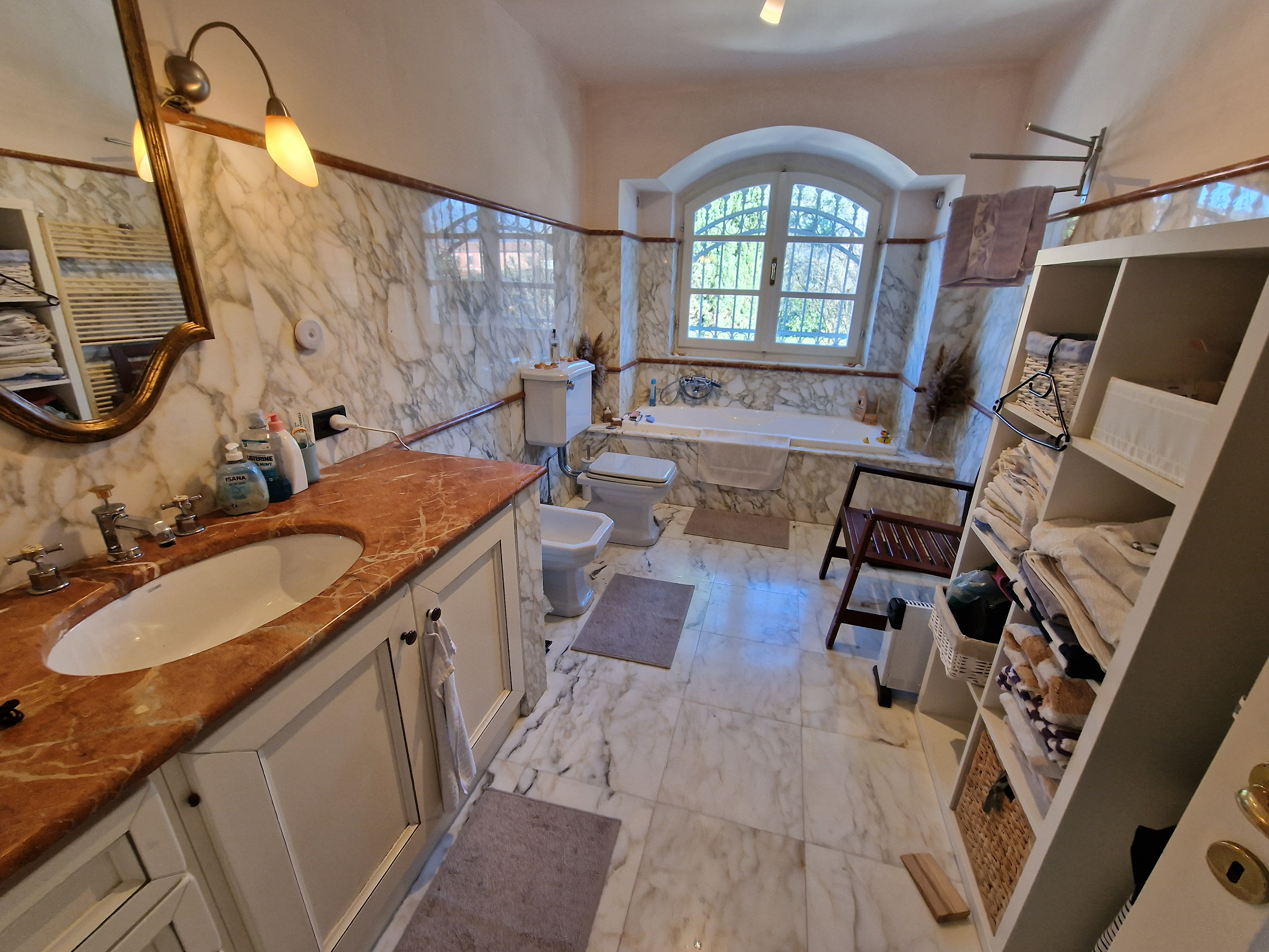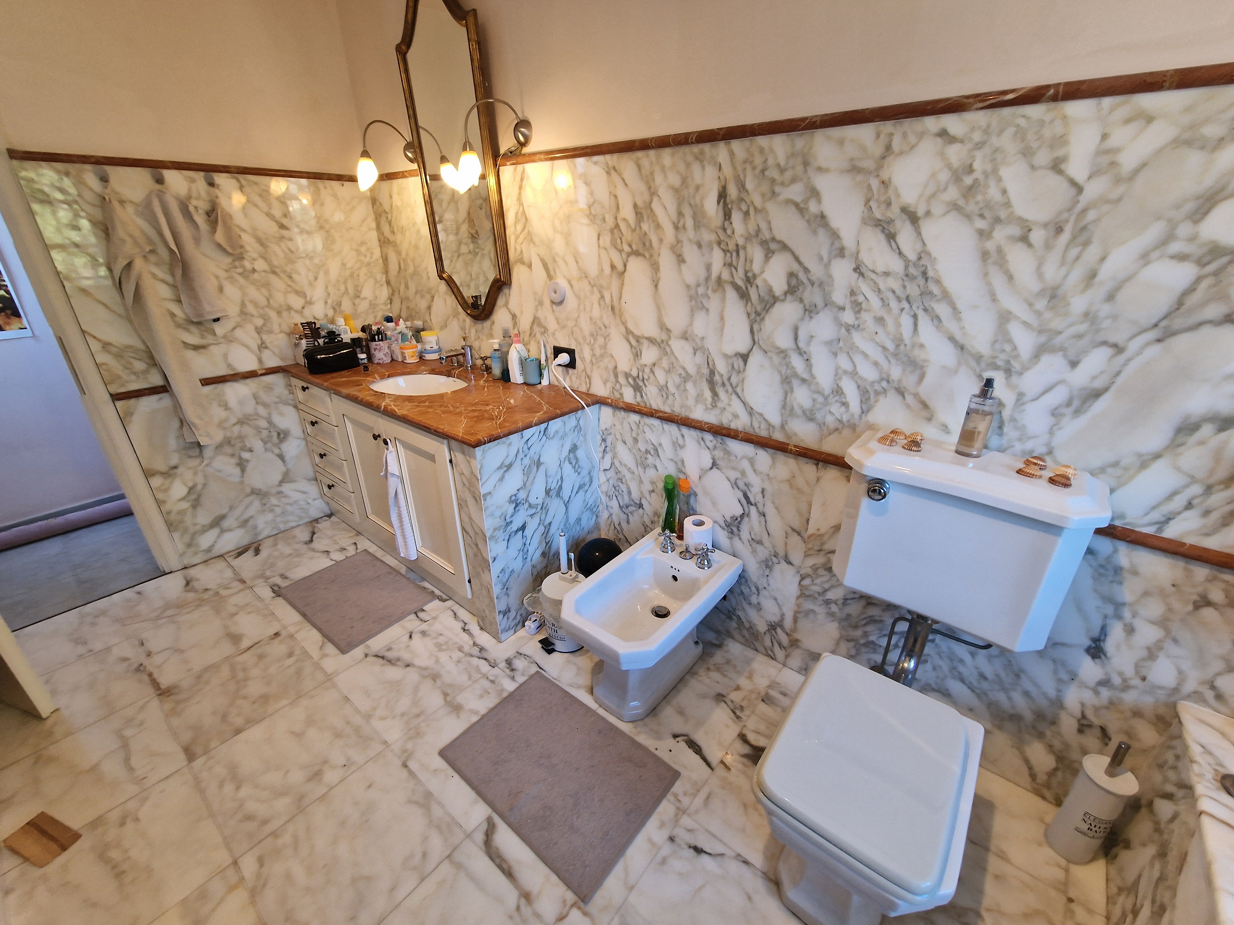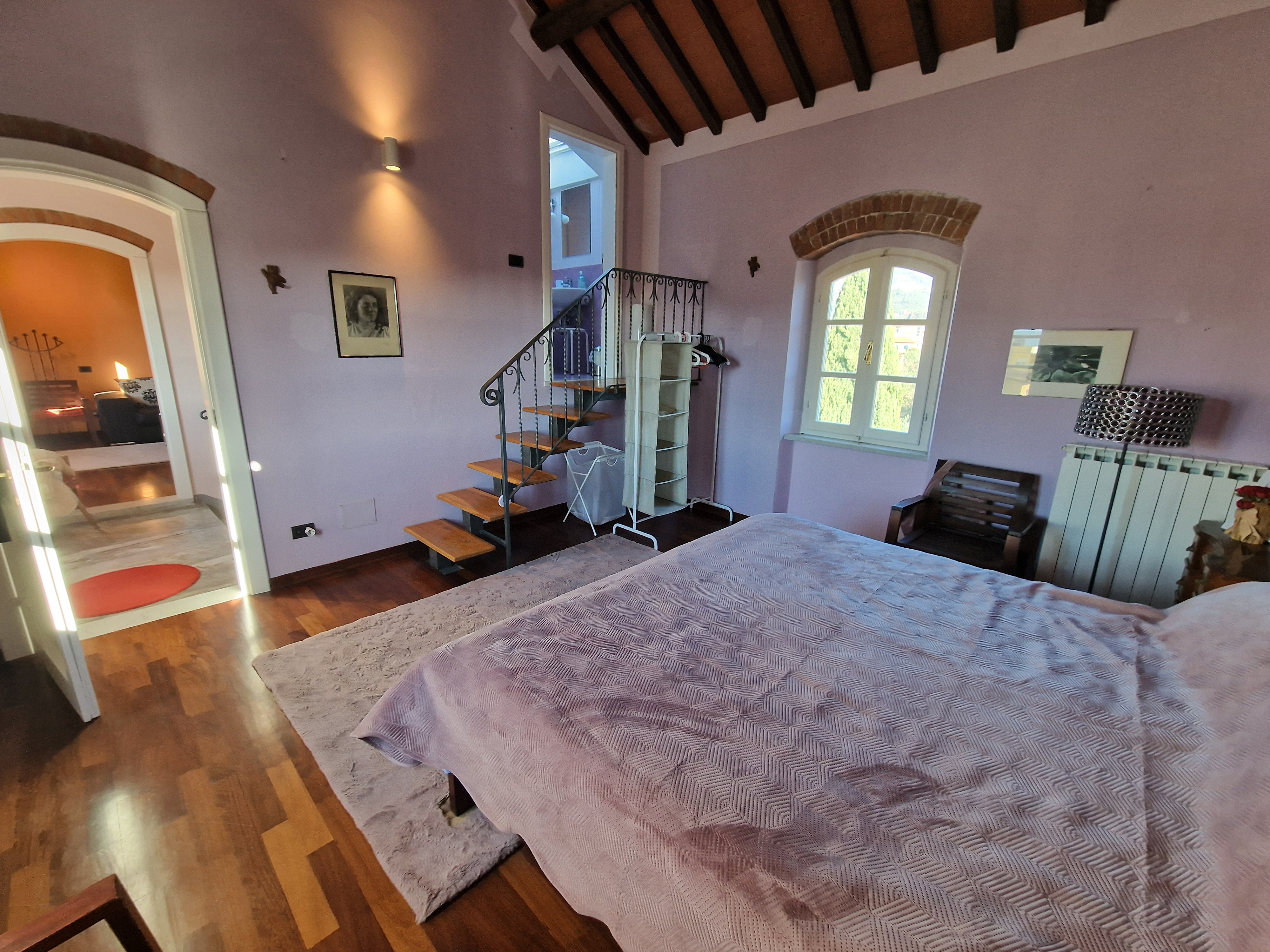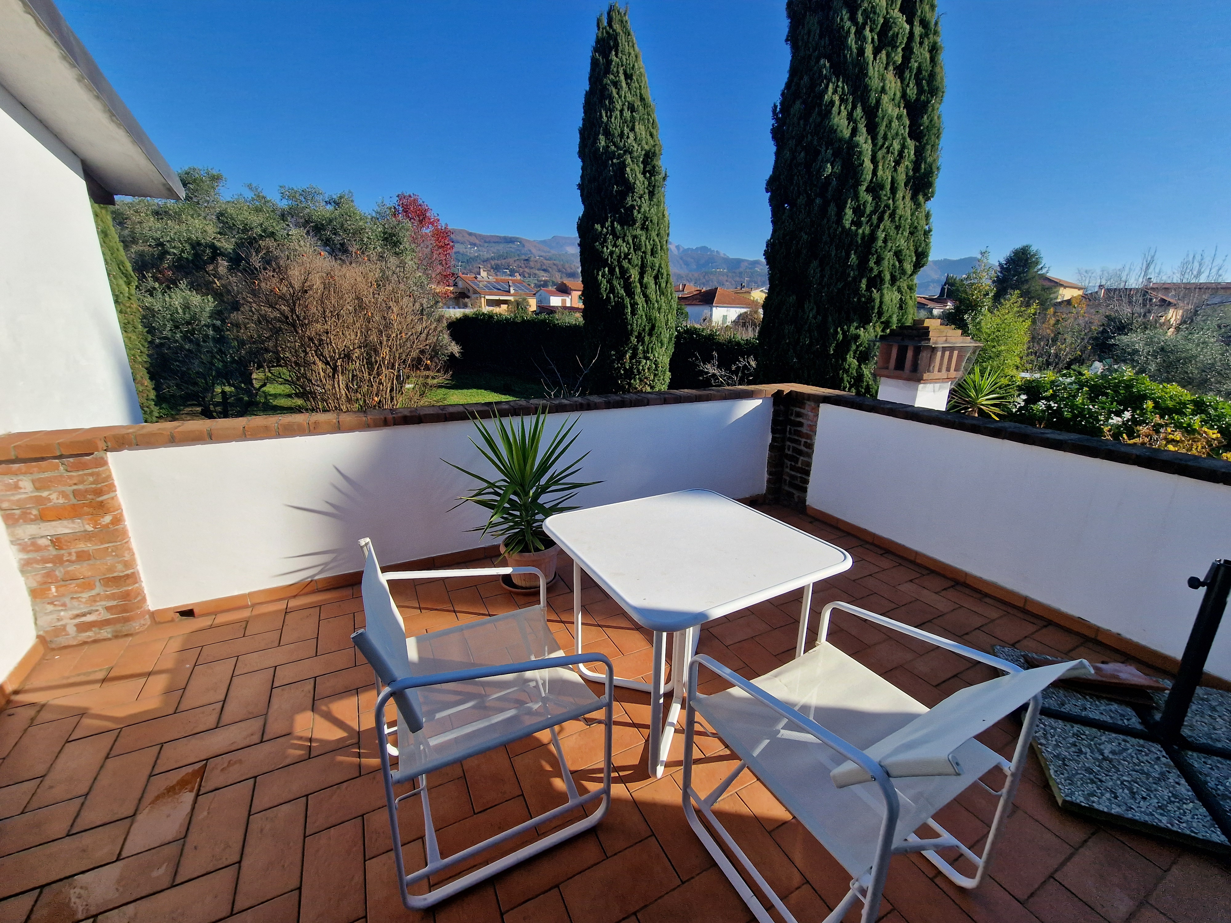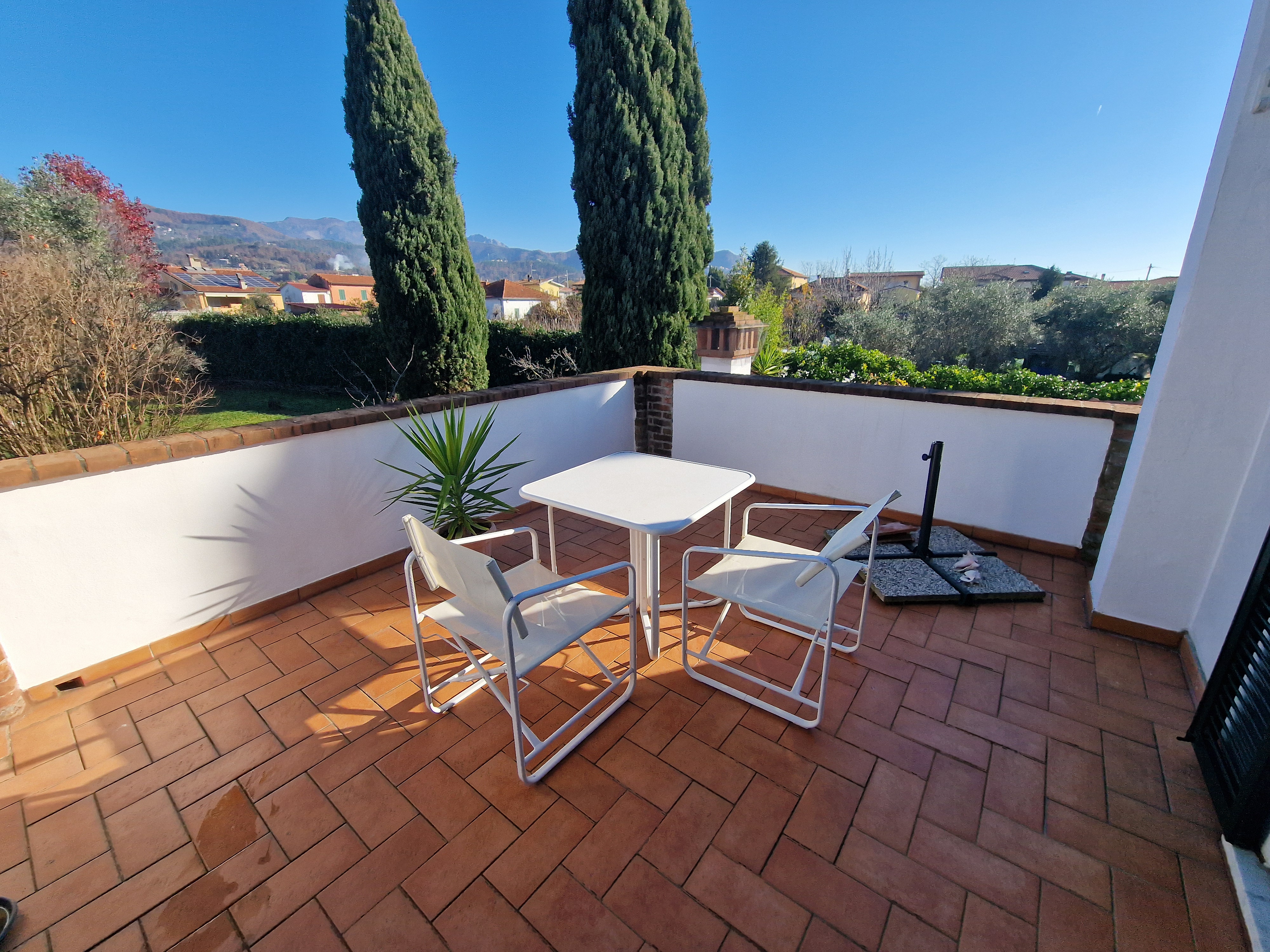 Al primo piano si trovano tre generose camere da letto, di cui una padronale con terrazza privata e vista libera sulle montagne circostanti. Tra il piano terra e il primo piano, un magnifico bagno, completamente rivestito in marmo di Carrara, aggiunge un ulteriore elemento di prestigio alla proprietà.
