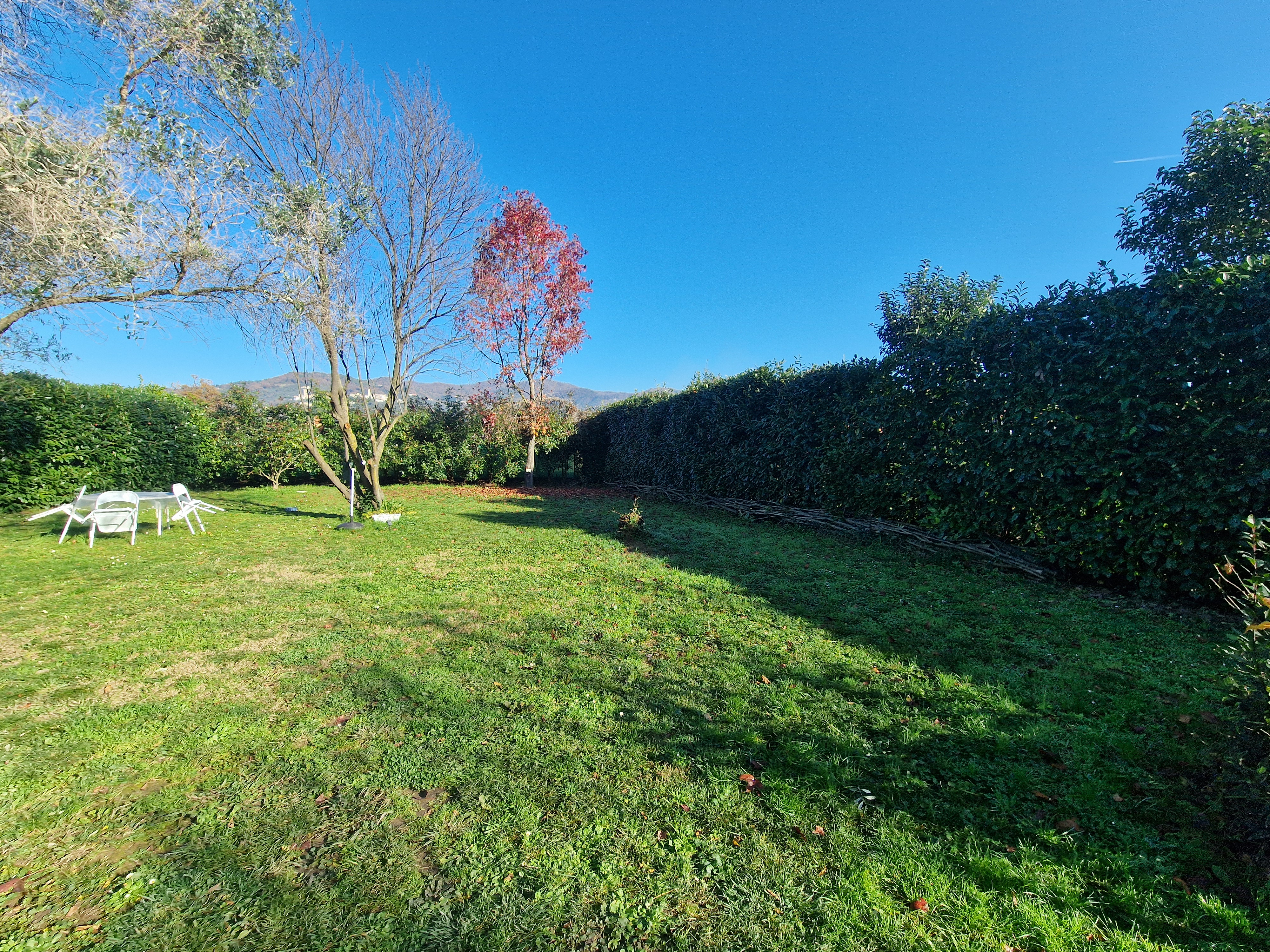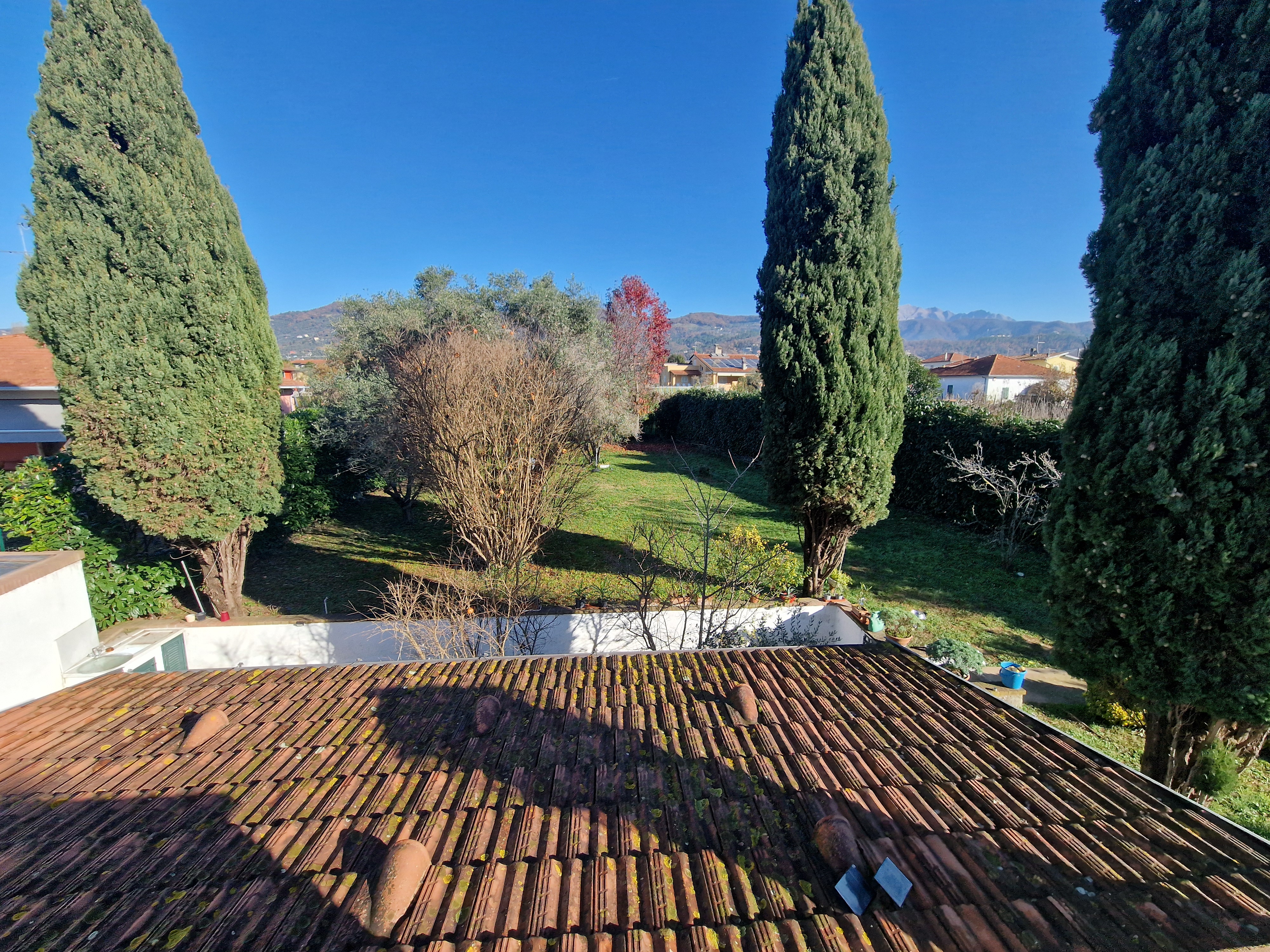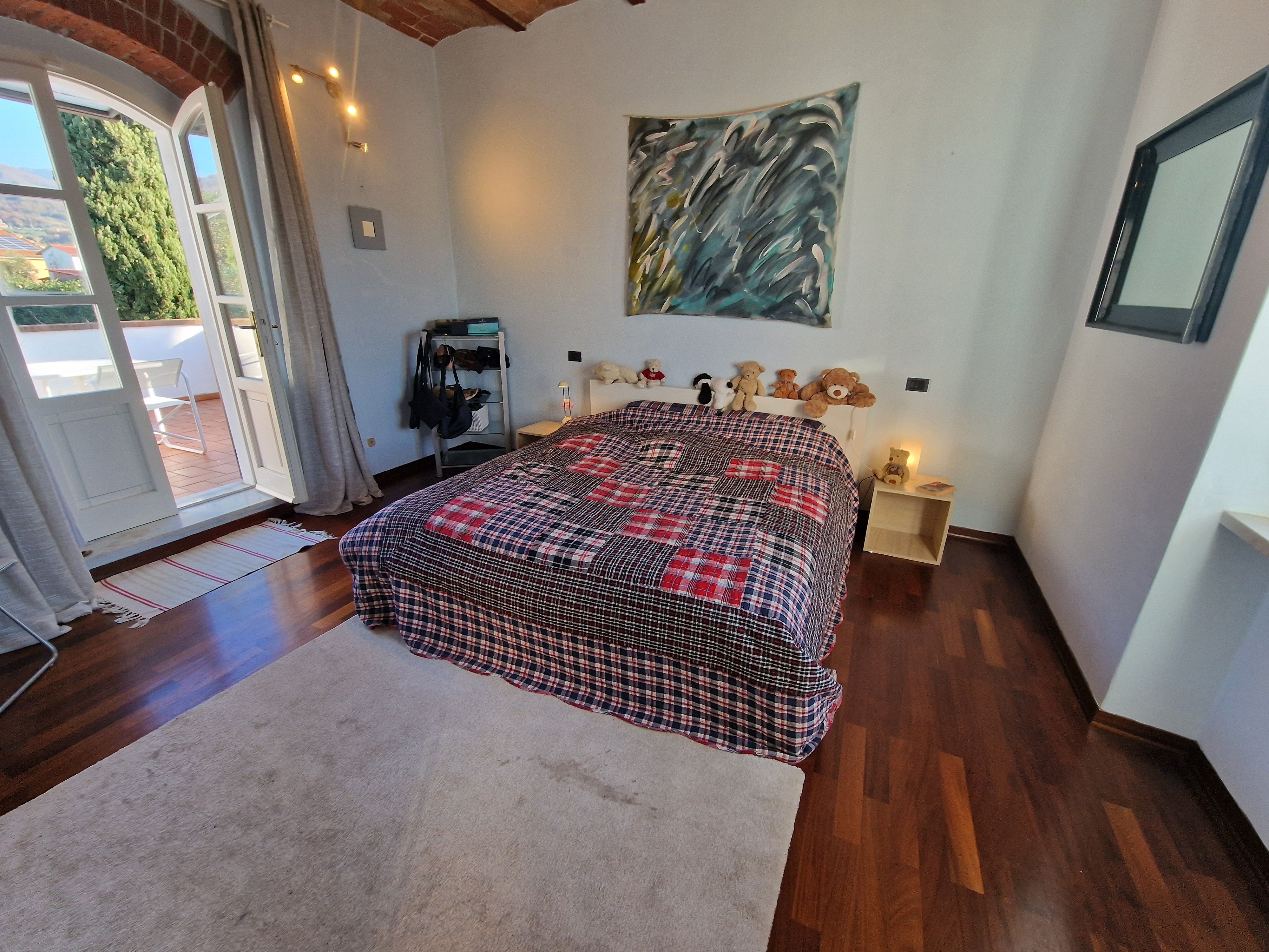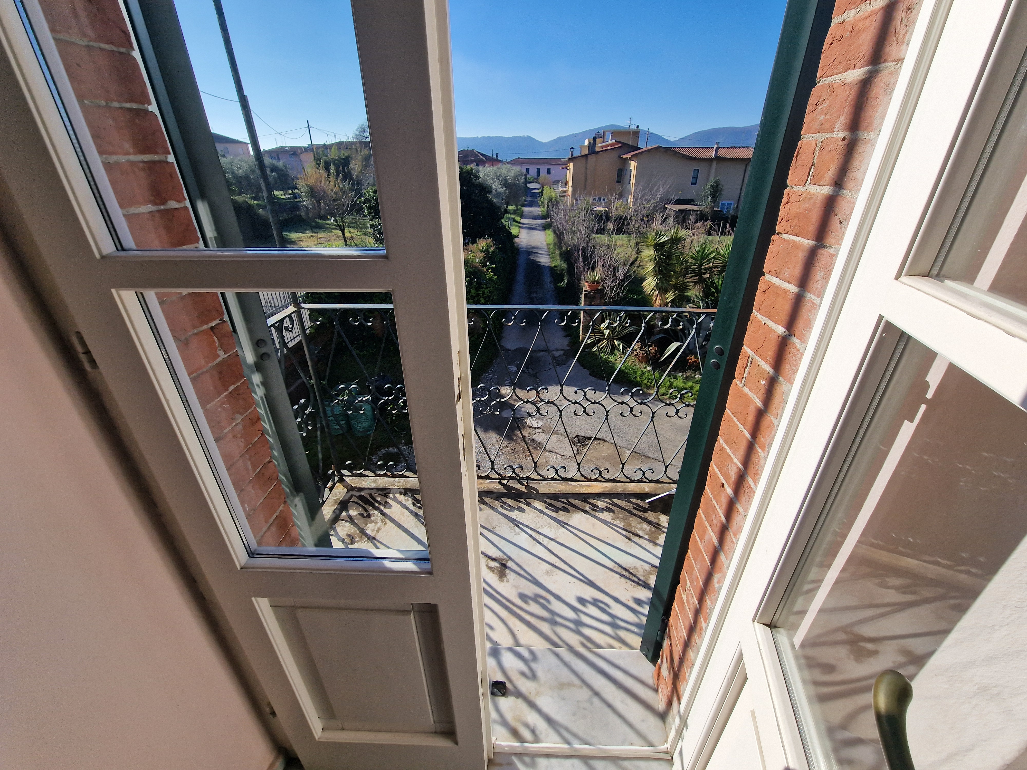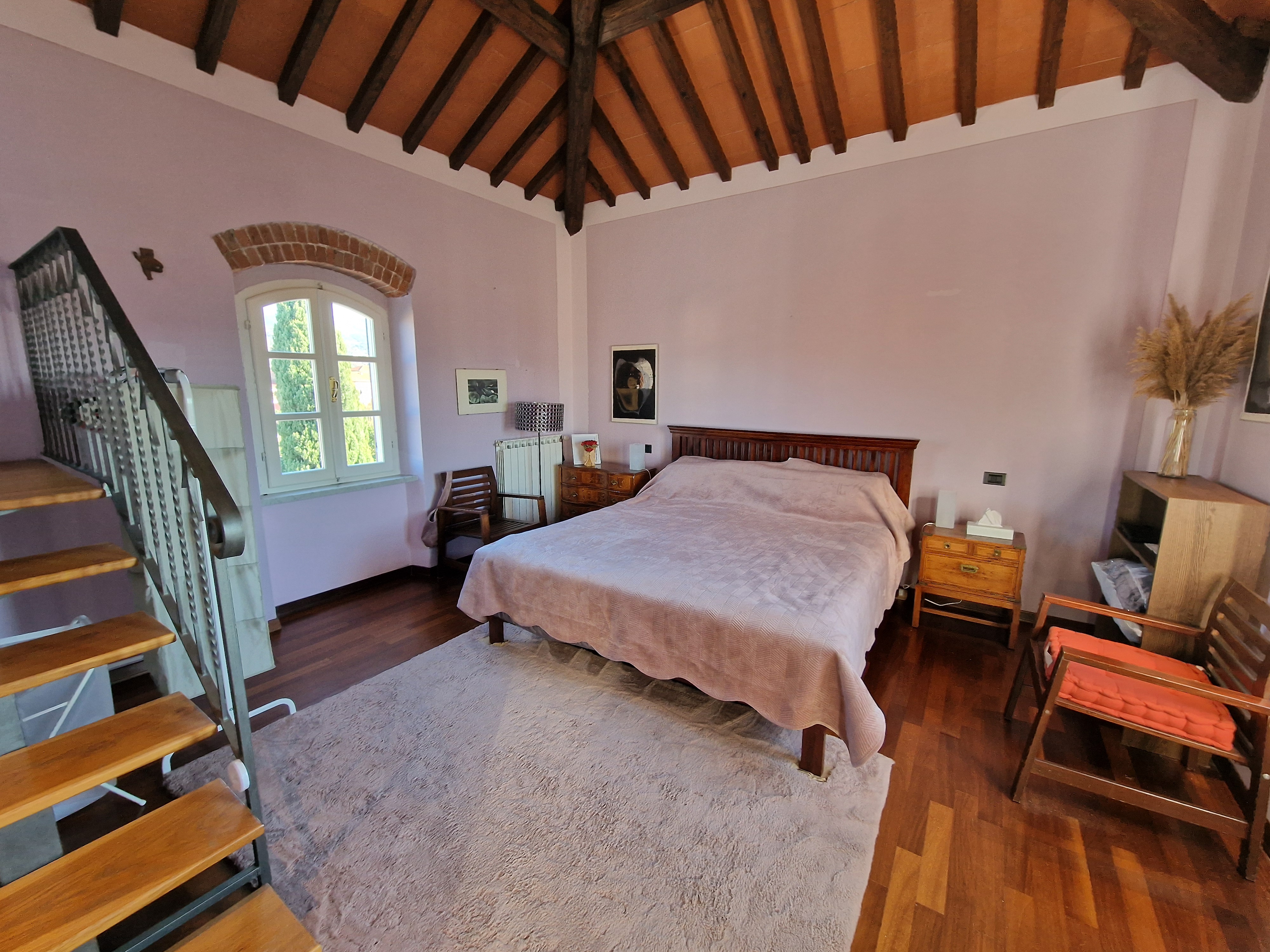Al primo piano si trovano tre generose camere da letto, di cui una padronale con terrazza privata e vista libera sulle montagne circostanti. Tra il piano terra e il primo piano, un magnifico bagno, completamente rivestito in marmo di Carrara, aggiunge un ulteriore elemento di prestigio alla proprietà.
