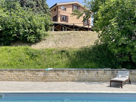Renovated villa with swimming pool (5 x 10 m) and beautiful panoramic views over the countryside and the Sibillini Mountains, set in a private yet non-isolated location just minutes from San Ginesio and Tolentino. The property features a fully fenced garden of approx. 3,680 sqm, three outbuildings, easy access via a municipal road and was fully renovated in 2011, with main services in place.