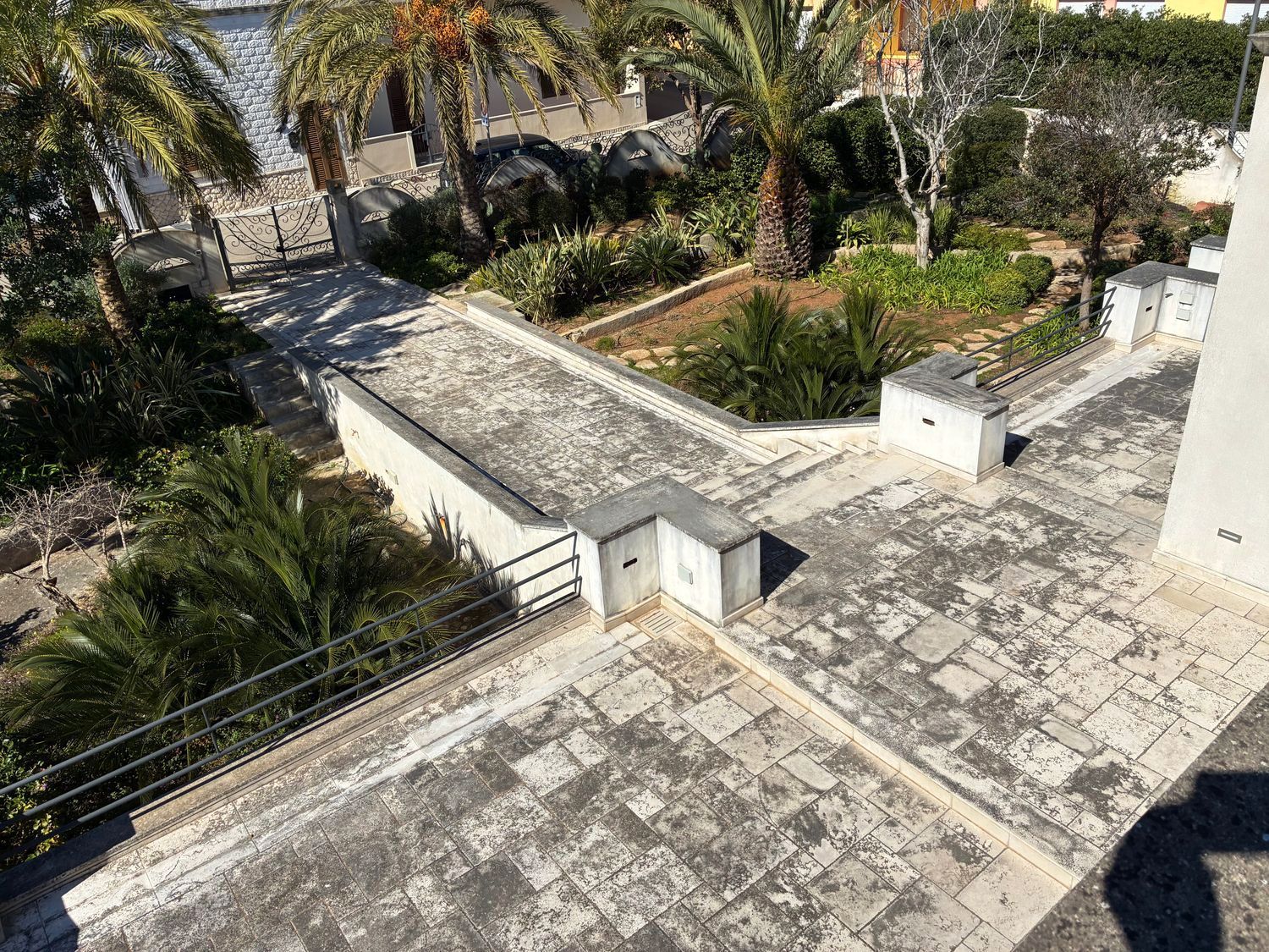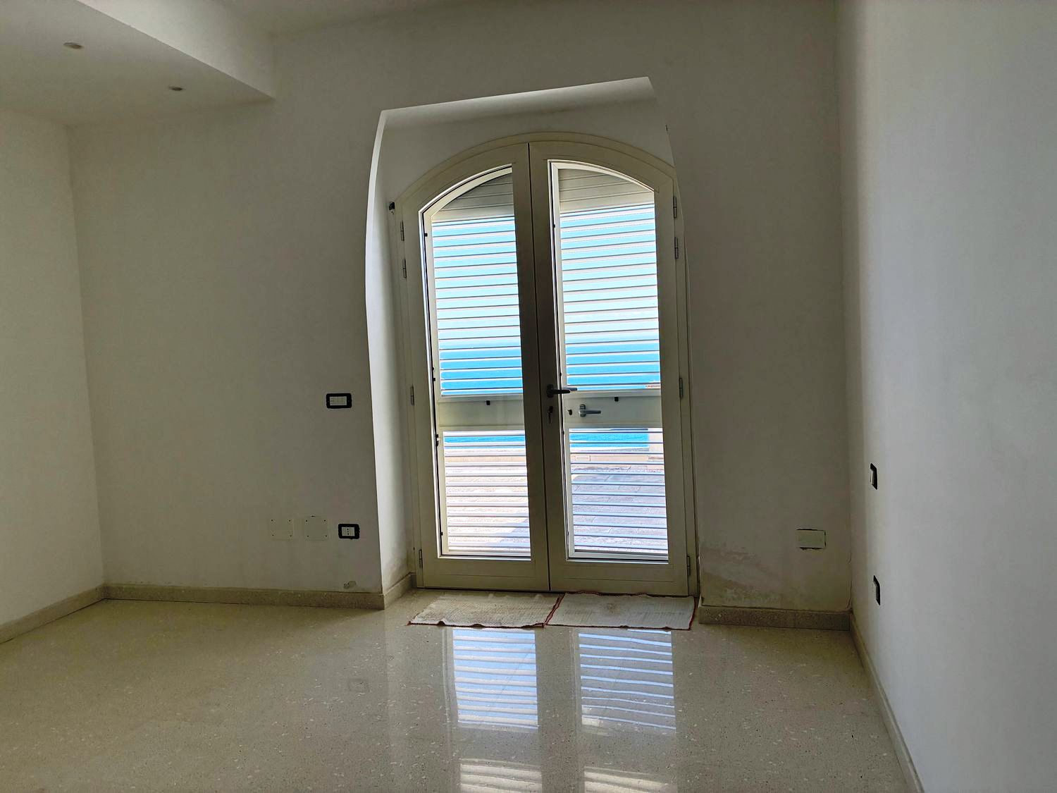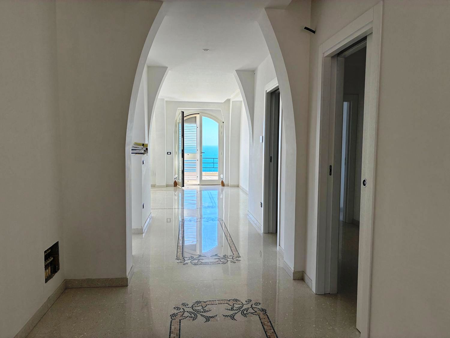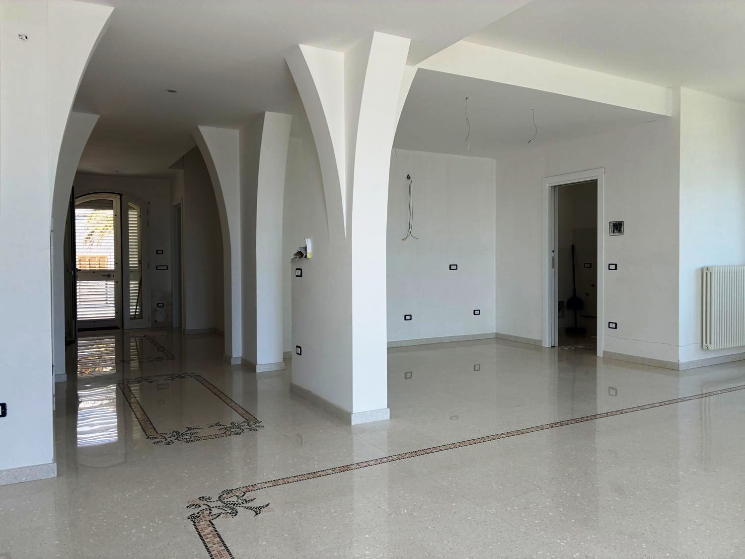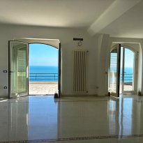 Internamente, la villa è composta da ingresso, disimpegno, ampio soggiorno panoramico, 4 camere da letto (di cui una con vista mare), 3 bagni completi, cucina, lavanderia e terrazzo panoramico al piano di circa 56 m² con pavimentazione in pietra di Trani. Altri piazzali e terrazze calpestabili di pari metratura completano l’abitazione, sempre pavimentati con pietra di prima scelta. Le finiture interne sono di alto pregio, con infissi dotati di vetrocamera.