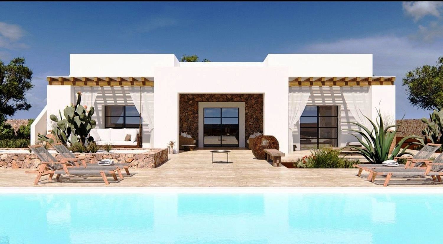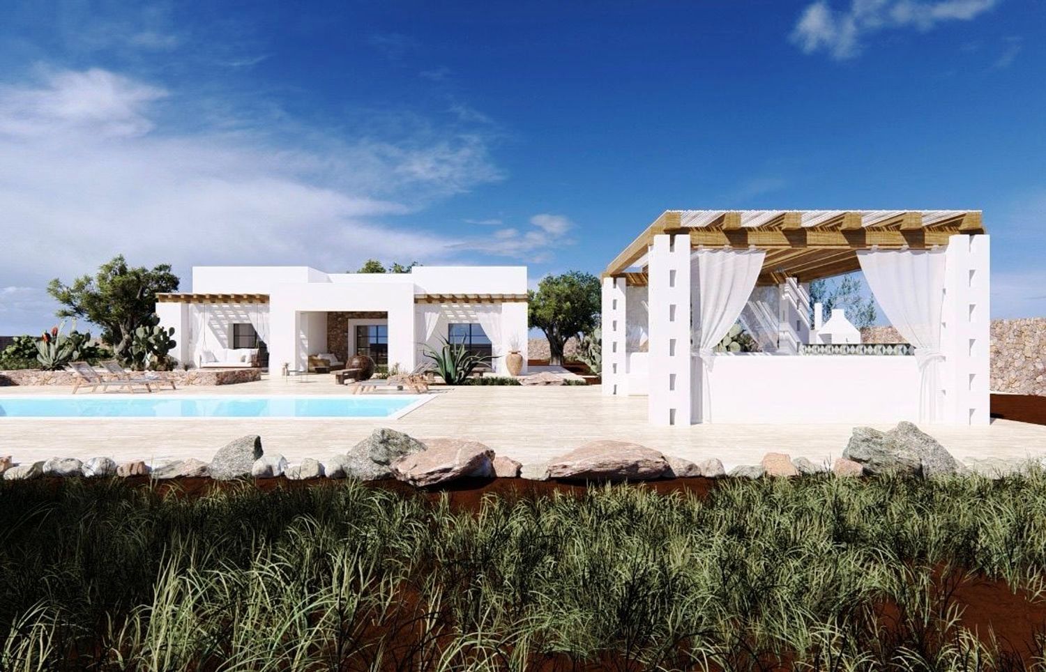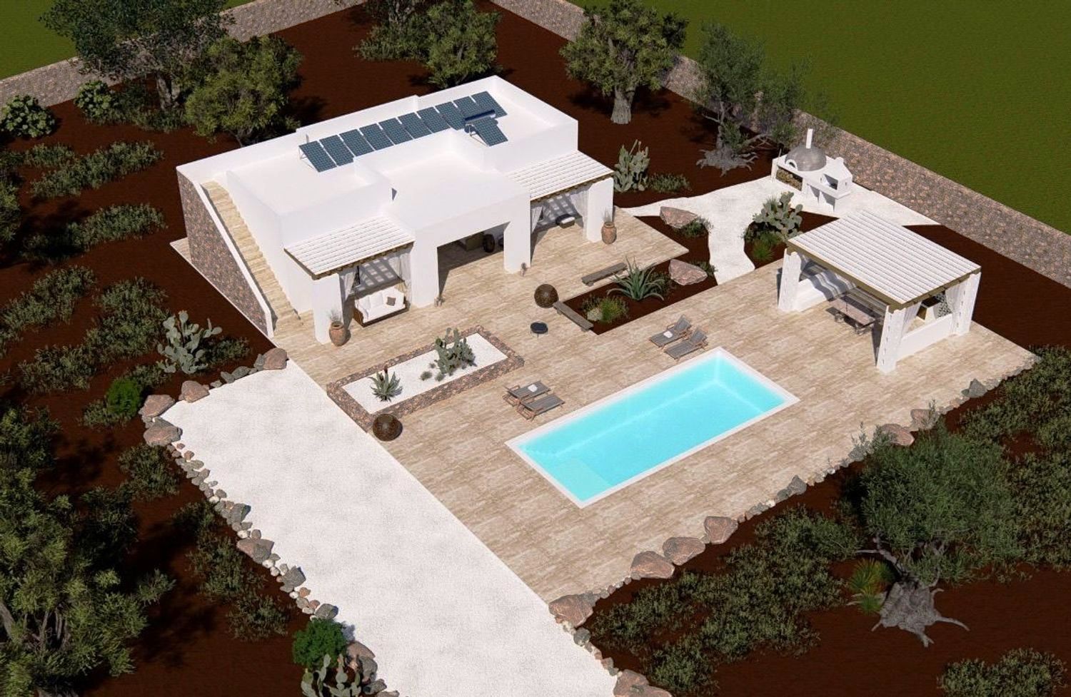 La villa sarà composta da due ampie camere da letto, un soggiorno/sala da pranzo, due bagni, zona living con cucina, zona portico, barbecue con forno a legna, piscina di 40 m² con area relax, terrazzo panoramico, area parcheggio e ingresso privato.