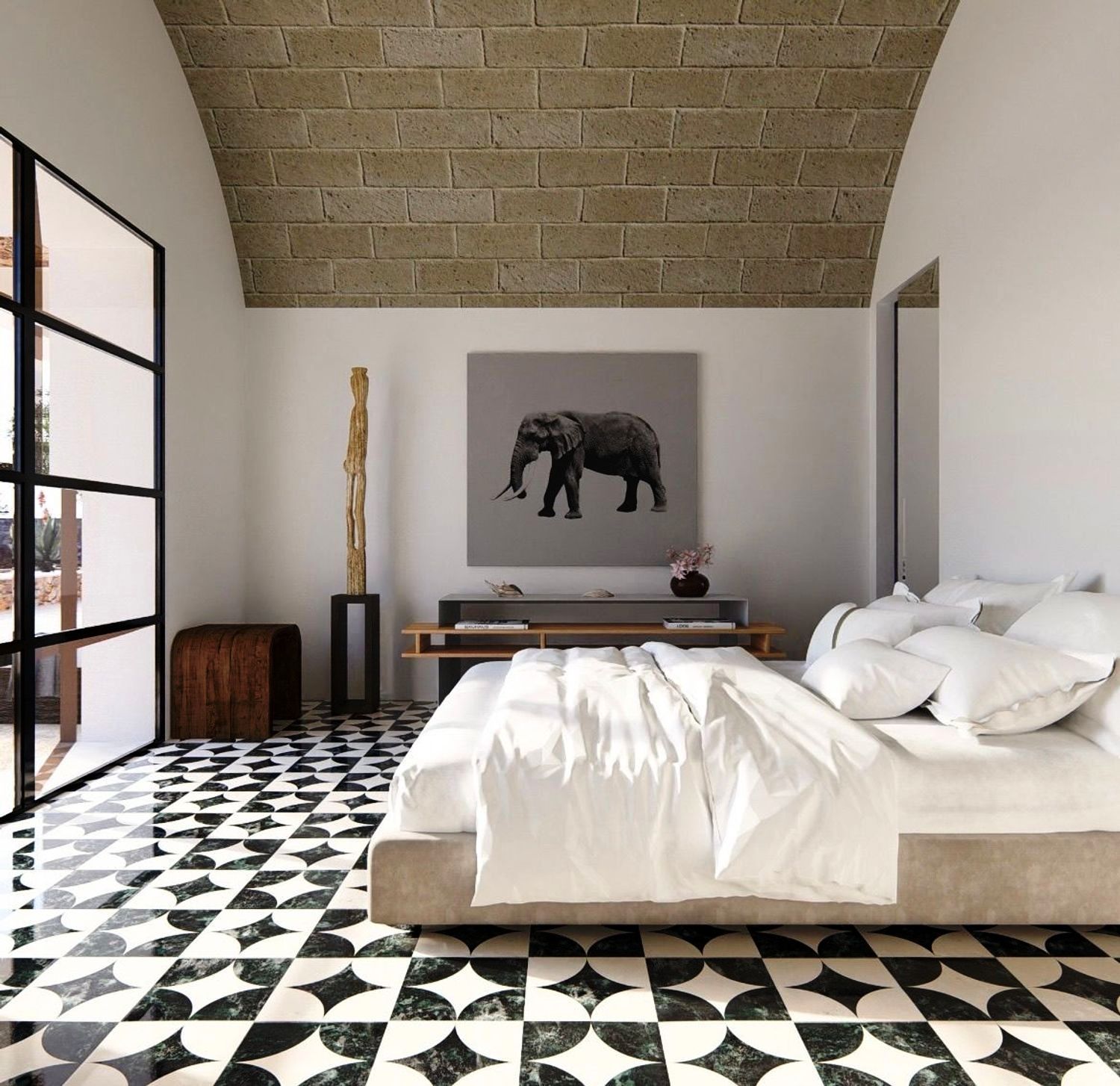 Le linee architettoniche della villa sono scandite da geometrie pulite e moderne, organizzate in tre moduli quadrati, ognuno dotato di portico e grandi vetrate che affacciano sul giardino.