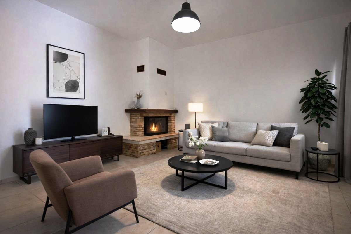 L’ingresso conduce in un accogliente soggiorno con camino, ambiente caldo e luminoso collegato alla cucina-pranzo. Un comodo disimpegno separa la zona notte, composta da due camere da letto e due bagni, una soluzione funzionale anche per ospitalità o affitti turistici.