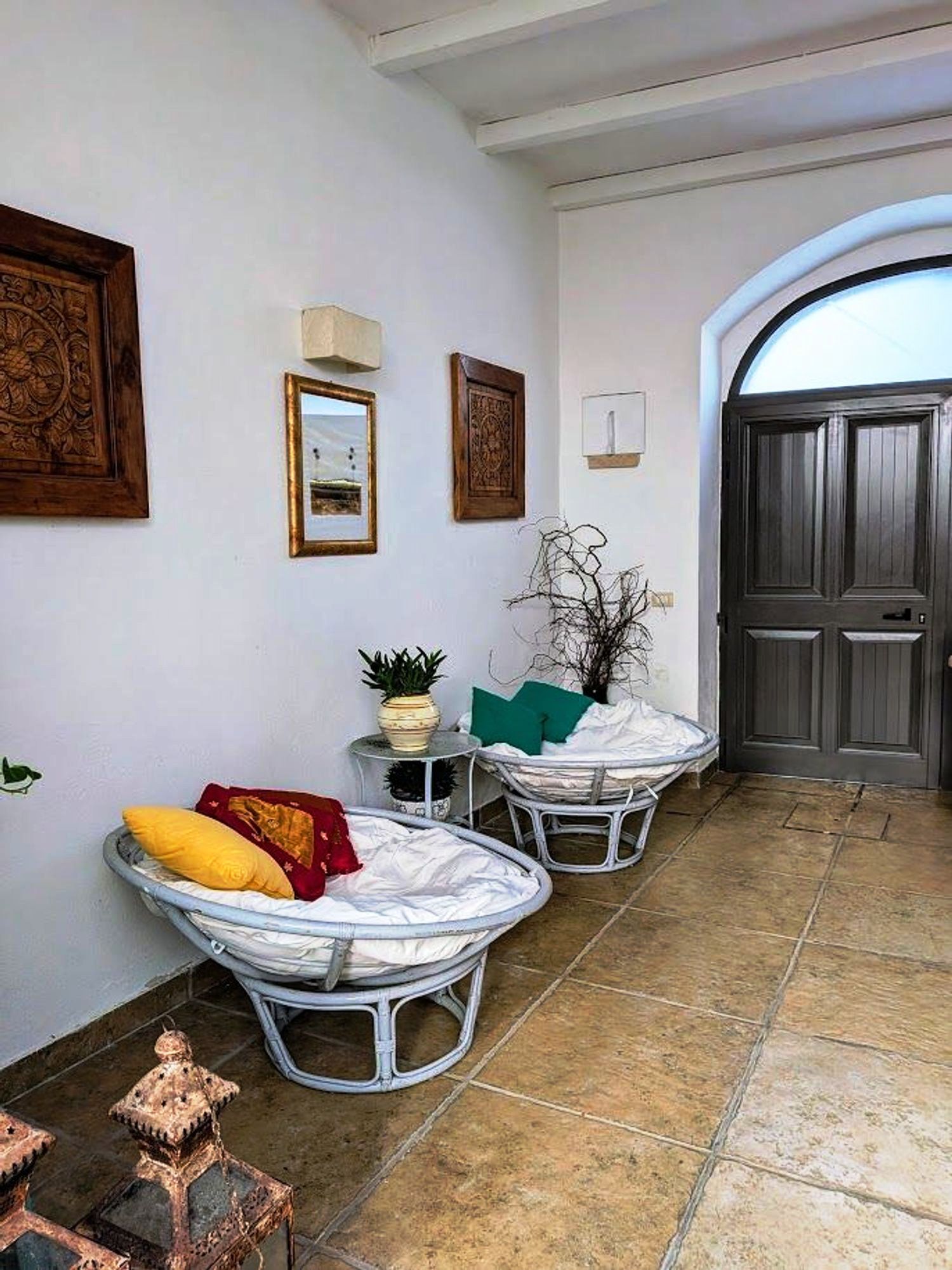 Un antico atrio a forma di arco antico fanno accedere in un patio con la volta in carparo a faccia vista, che sa di fresco e di antico una volta forse ricovero di calessi e cavalli, da un antica stalla sulla sinistra vi è una dependance completa e indipendente, continuando si entra nel corpo principale dell’abitazione, dove vi è un grande salone con fantastiche volte in carparo antico, due alcove sono state trasformate in un intimo studio, e un privo ambiente adibito a libreria e zona relax, un camino antico fa da padrone nello spazio soggiorno, sempre al piano terra si trova una spaziosa camera da letto con cabina armadio e bagno. Al piano interrato abbiamo anche un’antica cantina in pietra per conservare vini pregiati. Al piano terra si trova anche una cucina super attrezzata da dove si accede in uno splendido aranceto di circa 90 m², dove si può godere del fresco nelle torridi giornate estive, o godere di splendide cene conviviali con amici e parenti. Salendo al primo piano vi sono altre due stanze da letto e un altro bagno e si accede su una terrazza che si affaccia su una vista mozzafiato sulla chiesa del paesello.