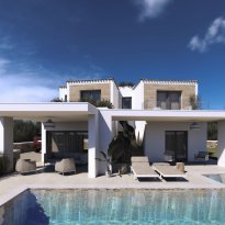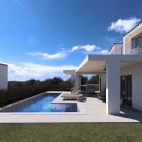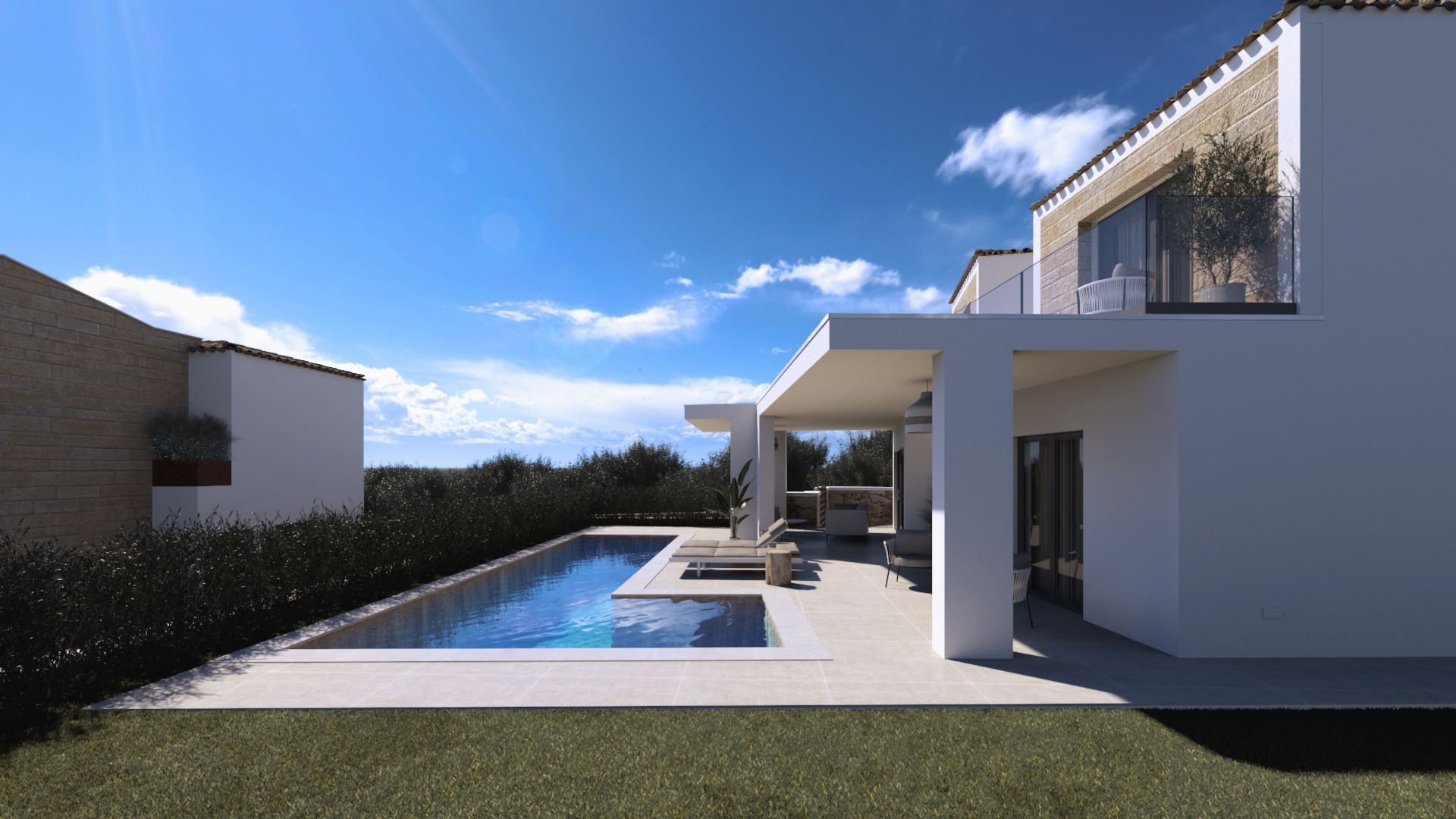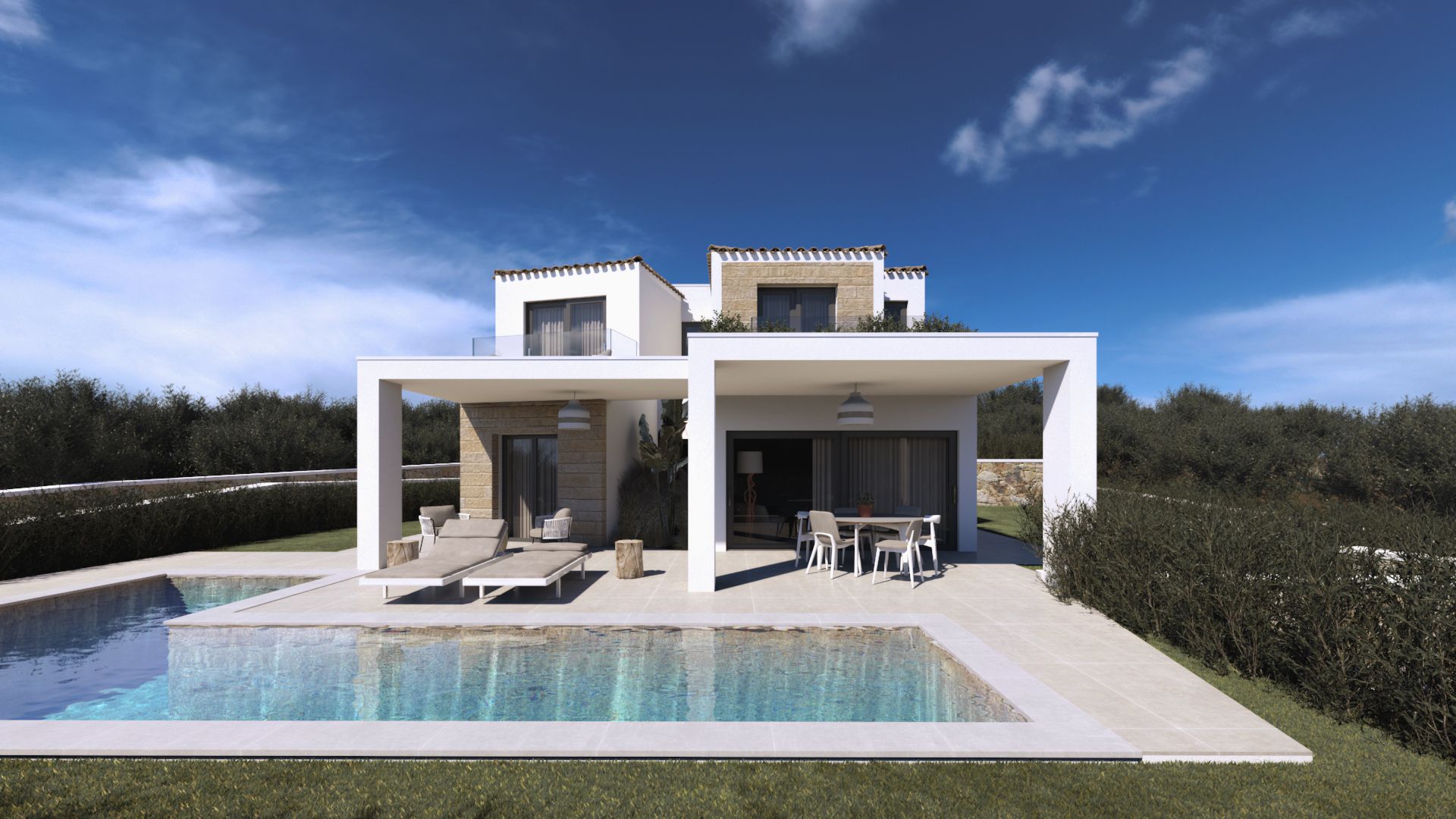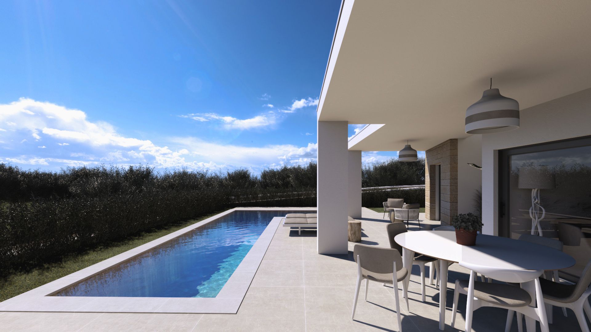 All'interno, le grandi finestre scorrevoli in alluminio con doppi vetri offrono una luce meravigliosa e una transizione perfetta tra interno ed esterno. Questo crea un'atmosfera aperta e ariosa, perfettamente adatta alla vita mediterranea. Grazie ai pannelli solari integrati, si beneficia anche dell'efficienza energetica e della riduzione dei costi, un investimento vantaggioso per il futuro.