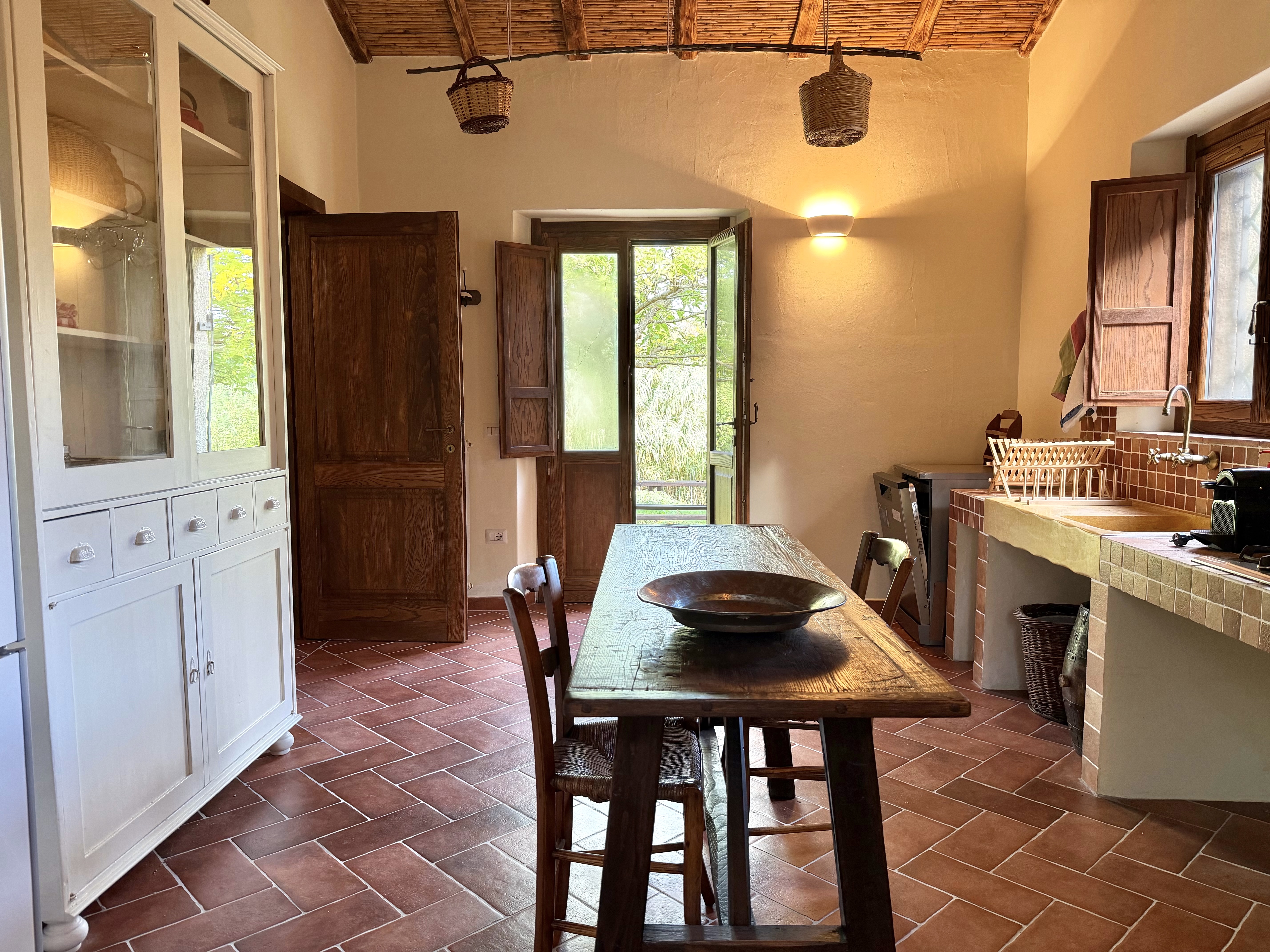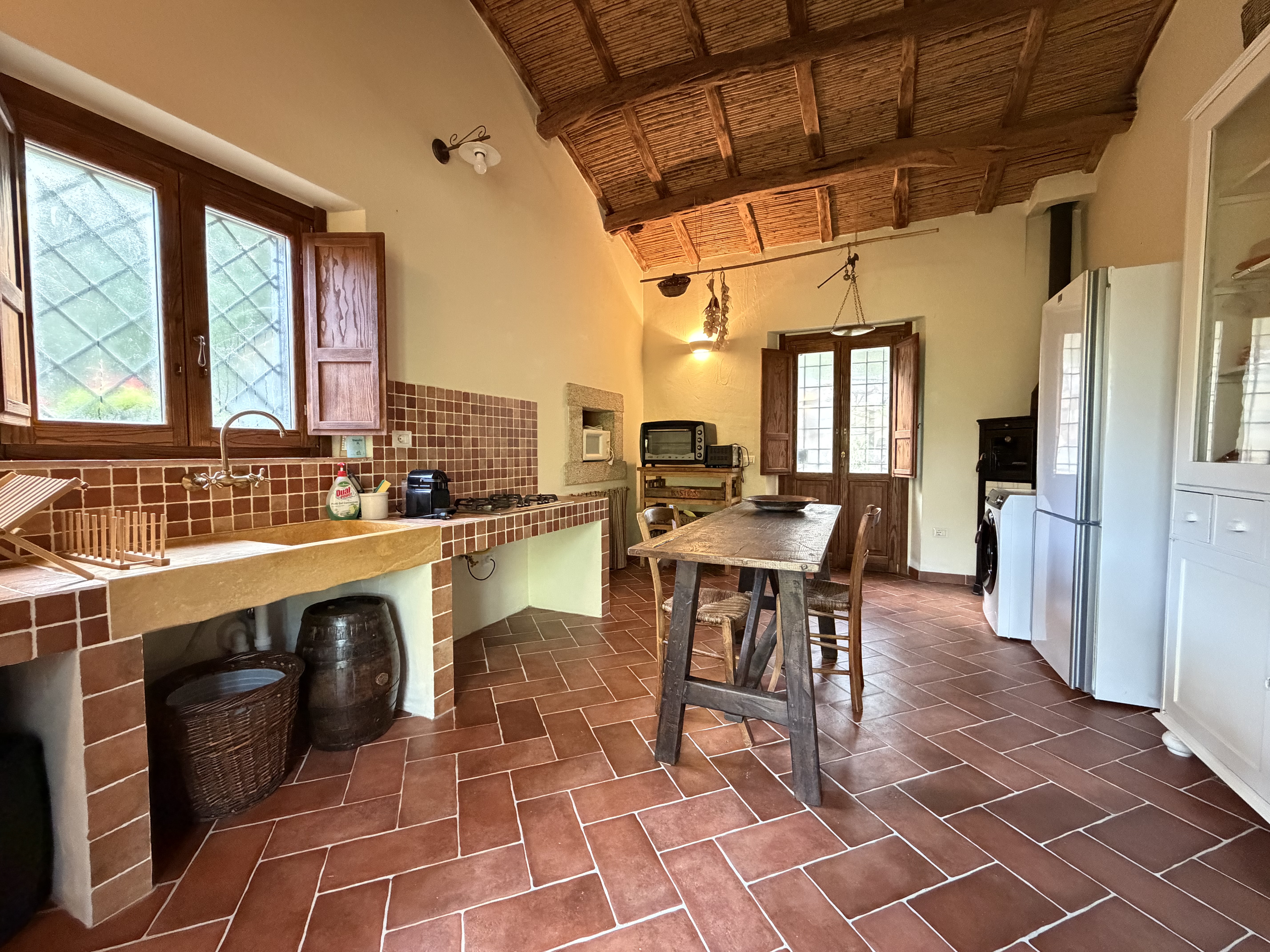 La proprietà si apre con un ingresso su cucina, accogliente e funzionale, che conduce all’ampio soggiorno con caminetto, cuore caldo della casa e perfetto per vivere l’atmosfera tipica degli antichi stazzi.