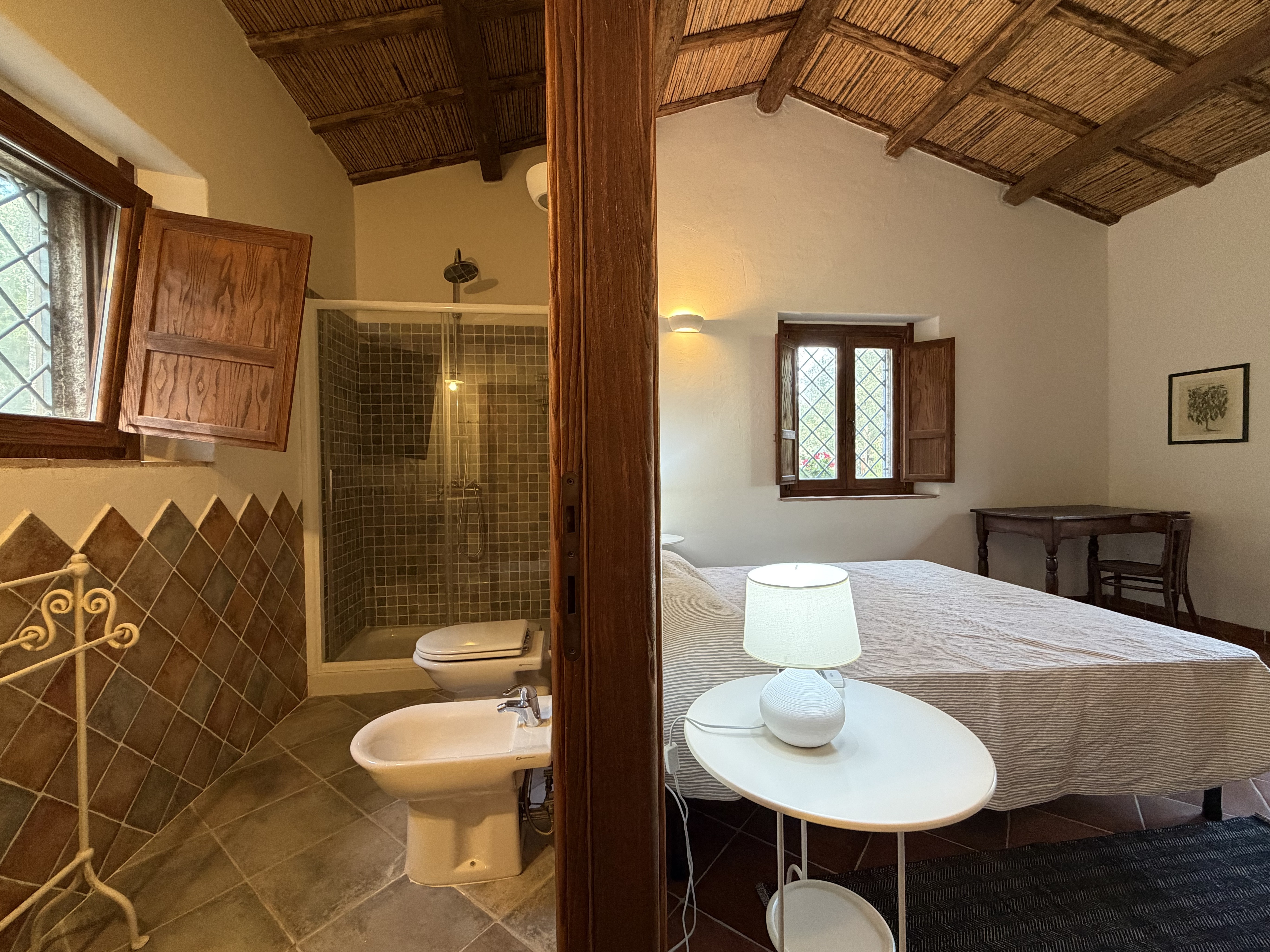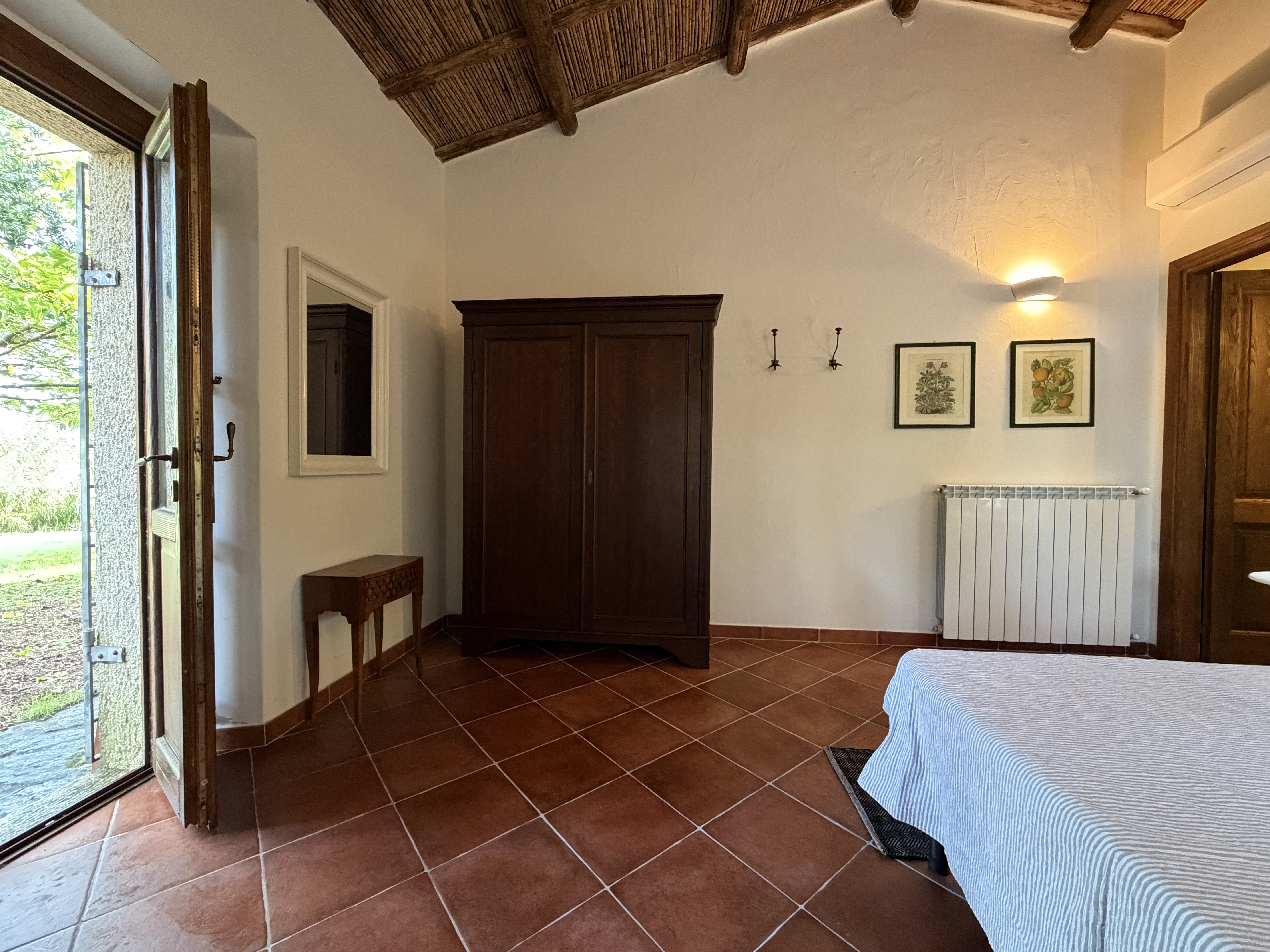 La zona notte è composta da una camera matrimoniale con bagno privato e da una seconda camera con bagno e ingresso indipendente, caratteristica che rispecchia l’evoluzione storica degli stazzi, nei quali le stanze venivano aggiunte nel tempo secondo le necessità familiari. Climatizzato, non arredato.