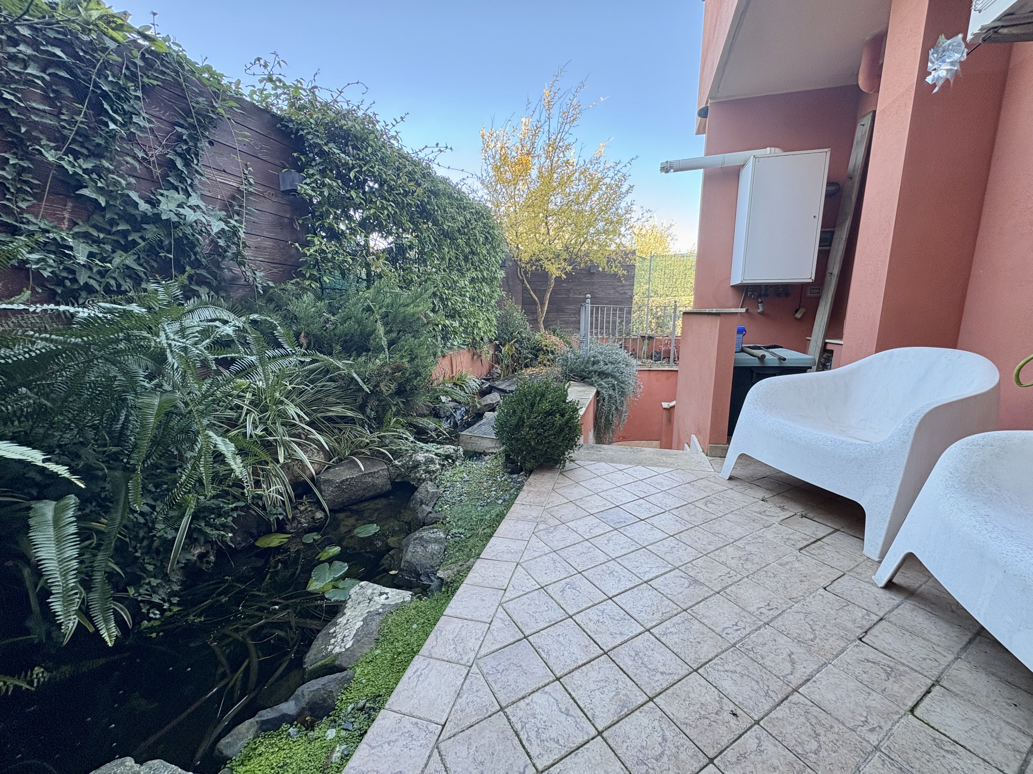 Seconda camera da letto matrimoniale con accesso diretto al cortile esterno con laghetto ornamentale