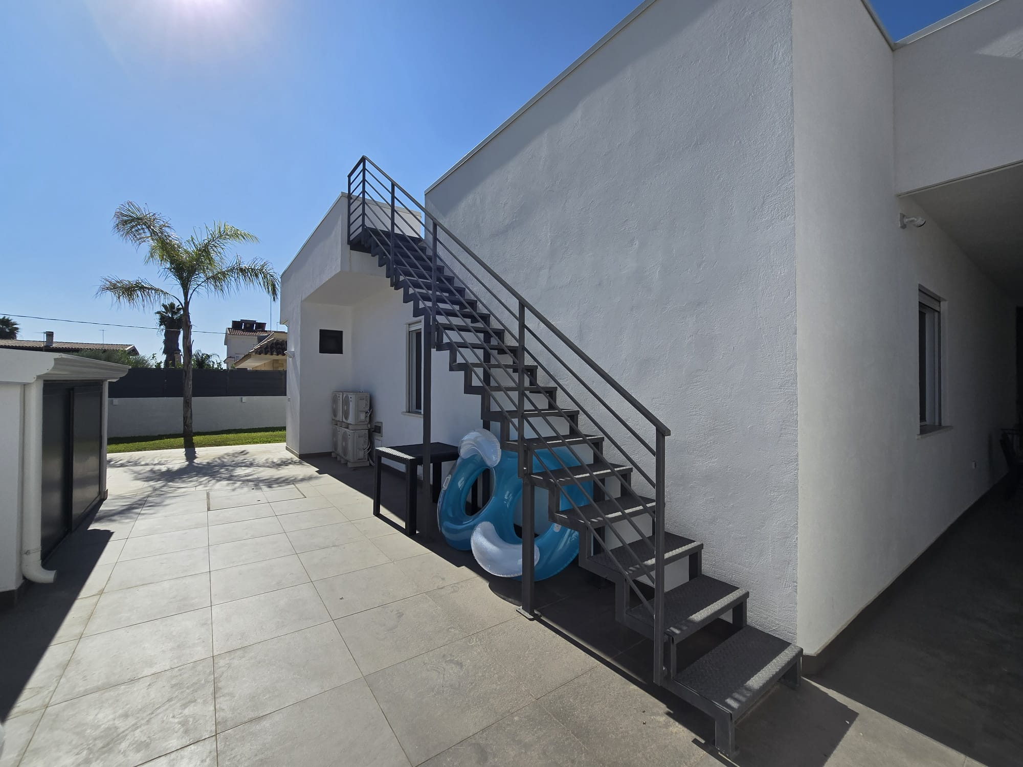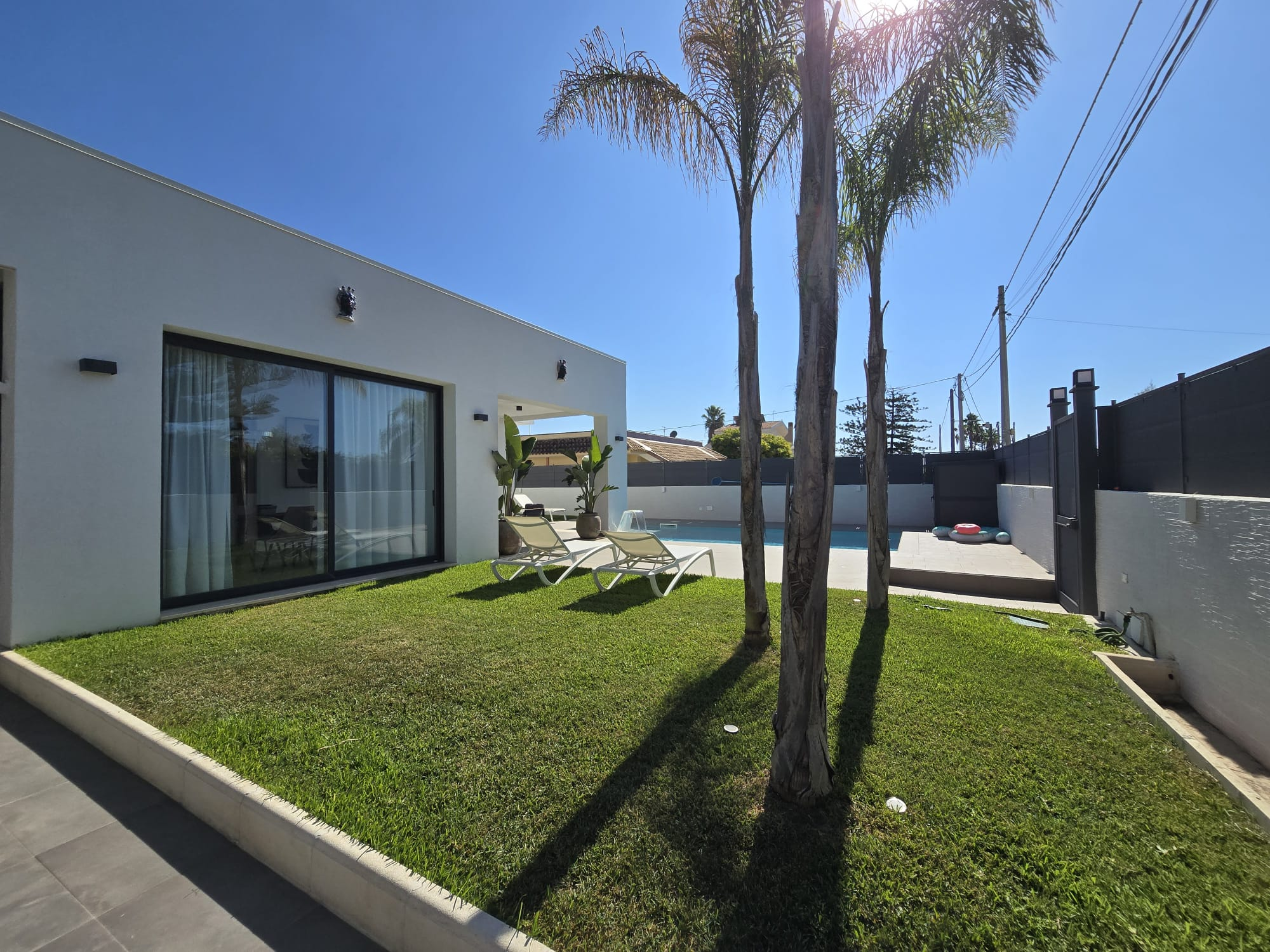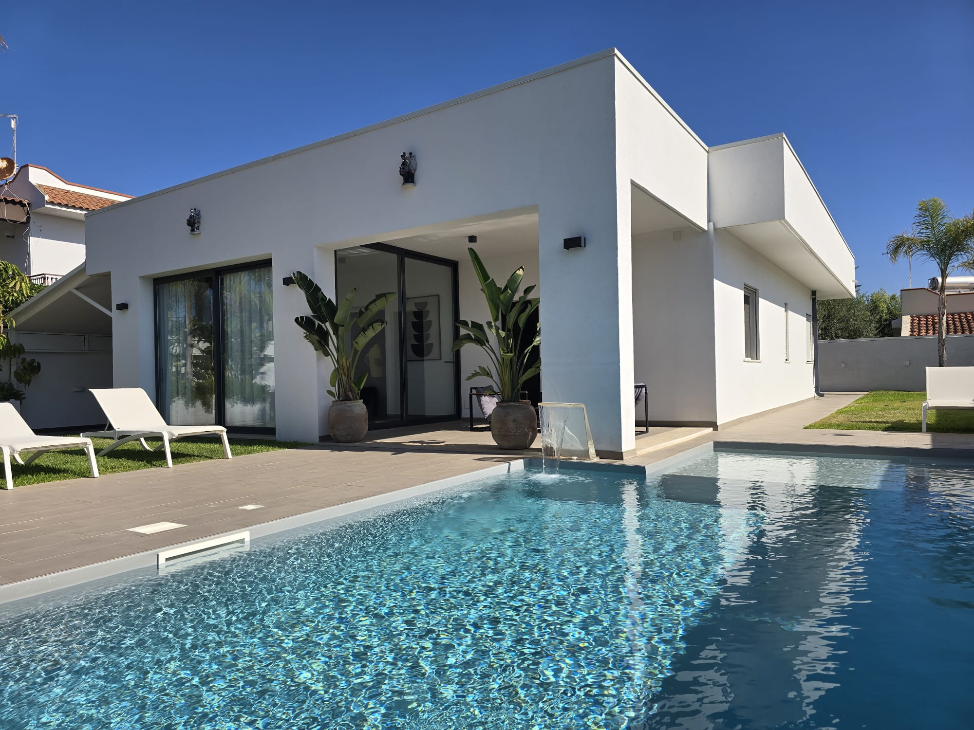 Esclusiva villa a Siracusa a soli 500 metri dalla spiaggia. Pronta a ricevere gli ospiti che vogliono godersi il Mar Ionio a Siracusa con stile. Caratteristiche principali: ampia cucina e soggiorno con molta luce, veranda in vetro con sala da pranzo e vista sulla piscina - seconda veranda aperta con vista diretta sulla piscina. La piscina con idromassaggio è circondata da un solarium soleggiato. La villa dispone di 2 camere da letto, di cui una con cabina armadio e bagno privato. La lavanderia è integrata nella cucina. C'è anche un annesso di 30 m² da utilizzare come casa per gli ospiti, studio o sala hobby. Parcheggio coperto per 5 auto. Dalla terrazza panoramica di oltre 140 m² si gode di una vista mozzafiato sul mare. La villa è dotata di mobili ed elettrodomestici di design habitat moderni e confortevoli. Tutte le stanze sono progettate e rifinite secondo uno standard elevato per il massimo comfort. La casa si trova in una zona residenziale tranquilla ed elegante. Un investimento vantaggioso sia come residenza principale di lusso sia per l'affitto come casa vacanze in una delle località balneari più famose della Sicilia.